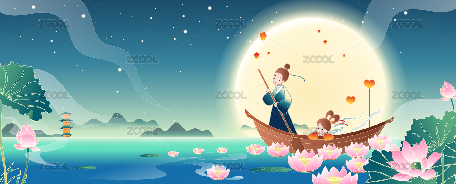 中國愛情傳說牛郎織女七夕荷花流云國潮插畫