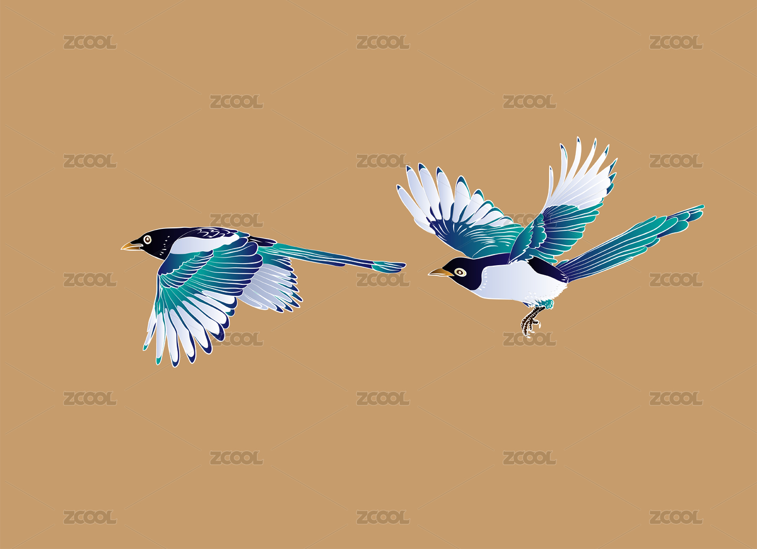 國潮七夕飛鳥喜鵲工筆白描矢量中國風插畫