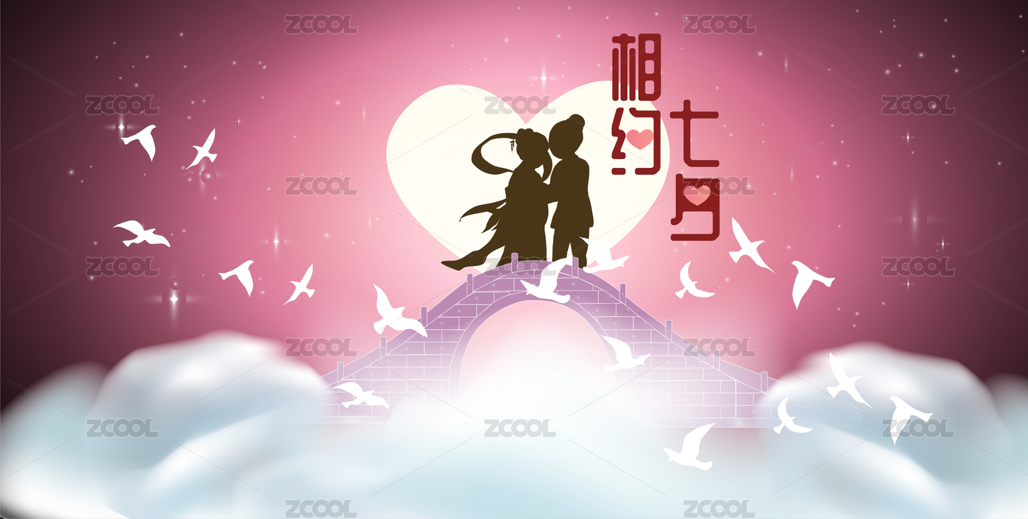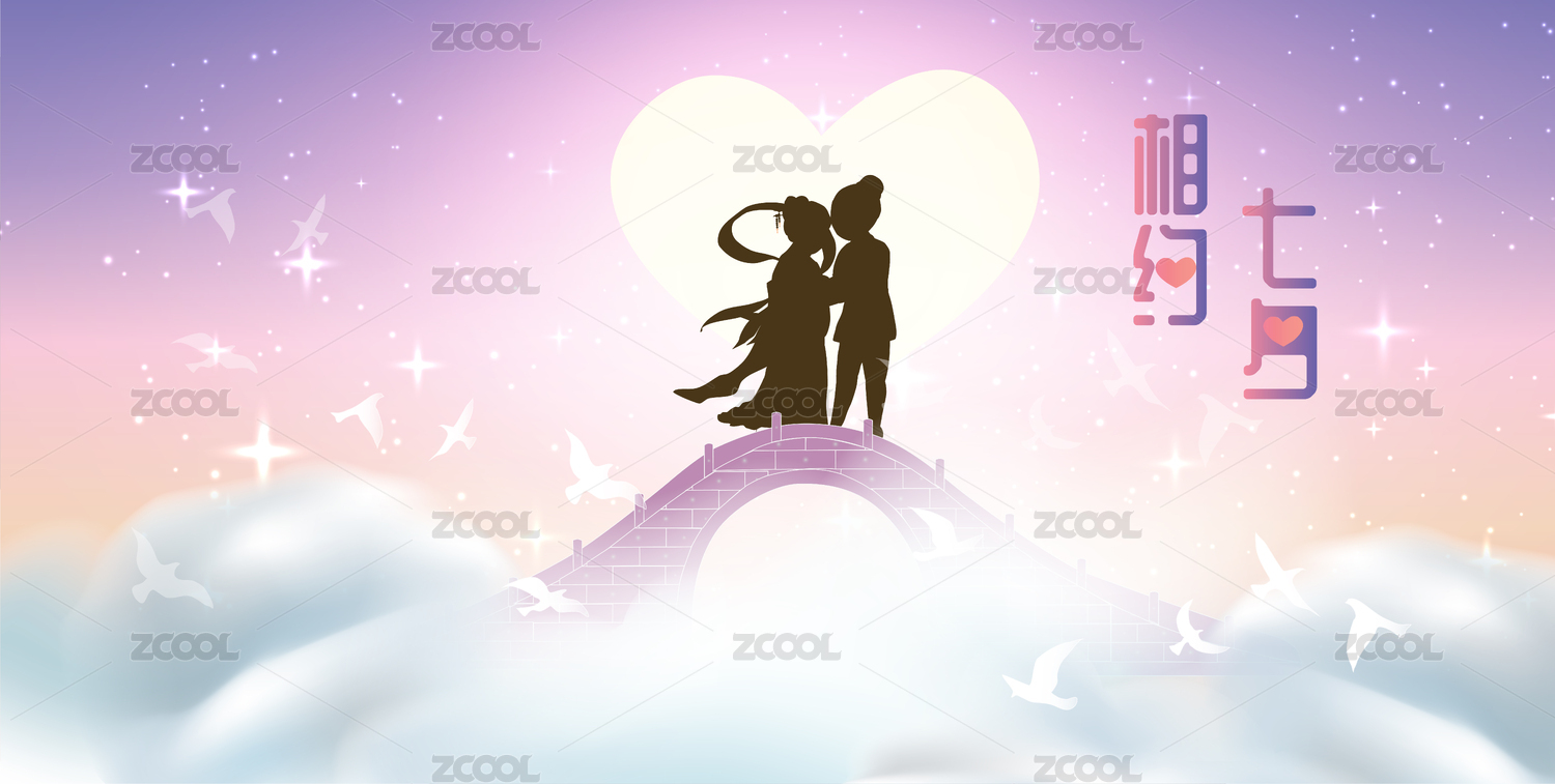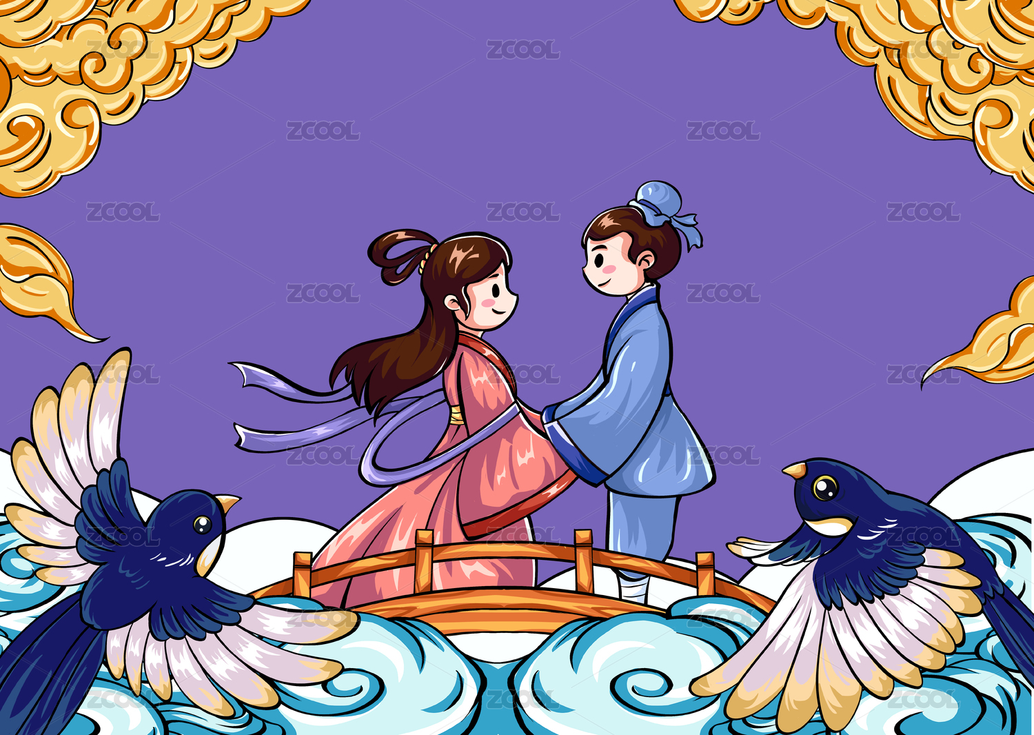 七夕情侶約會擁抱牛郎織女鵲橋相會國潮插畫