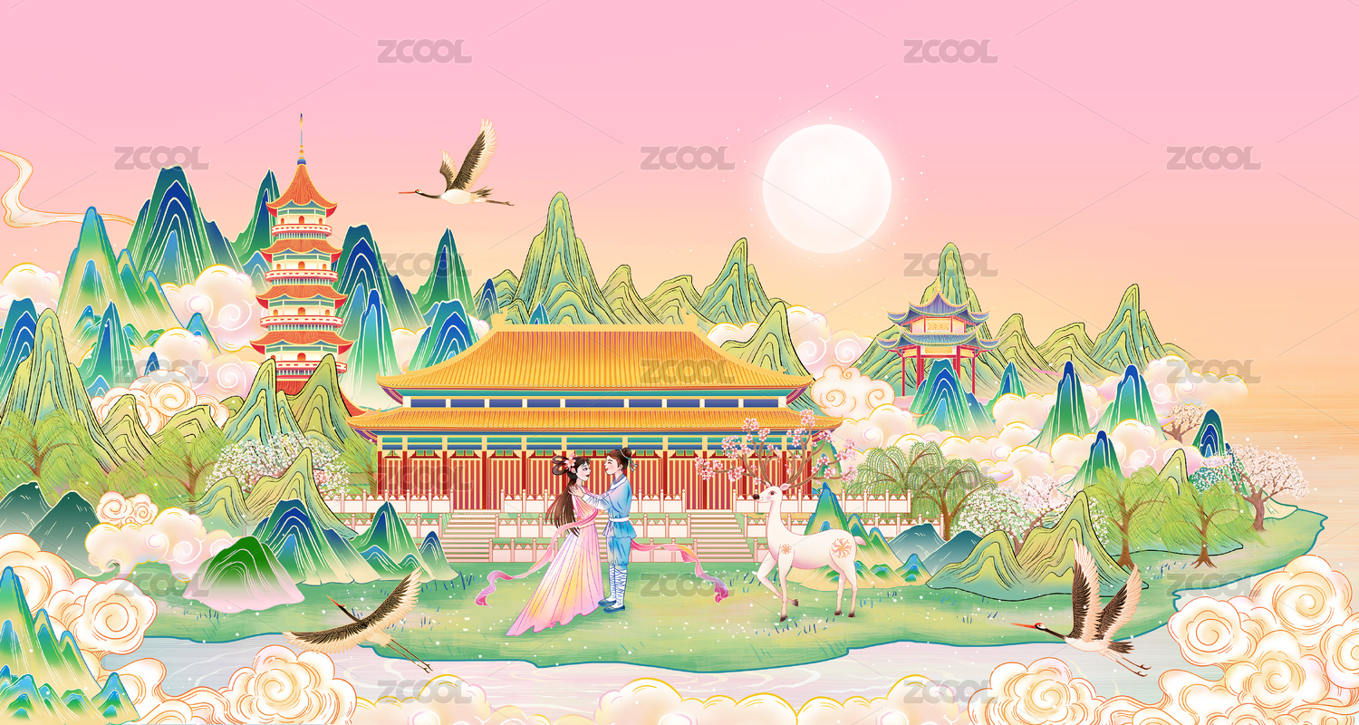 七夕祥云宮殿石橋荷花喜鵲情侶相會國潮插畫