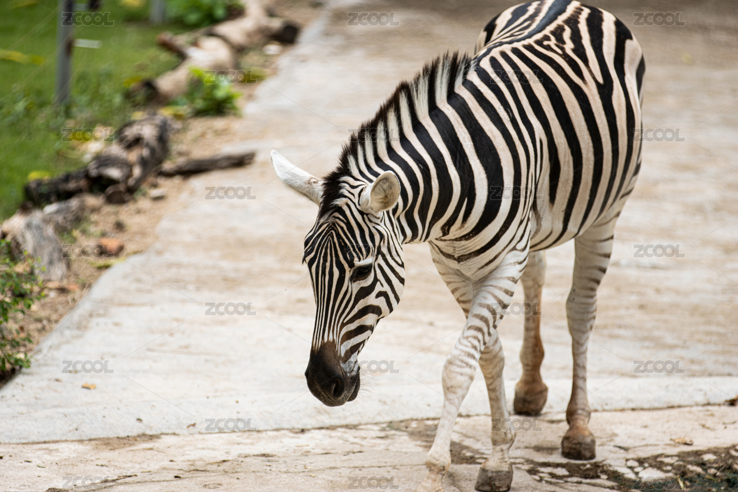 動物園里在水泥地上行走的一只斑馬