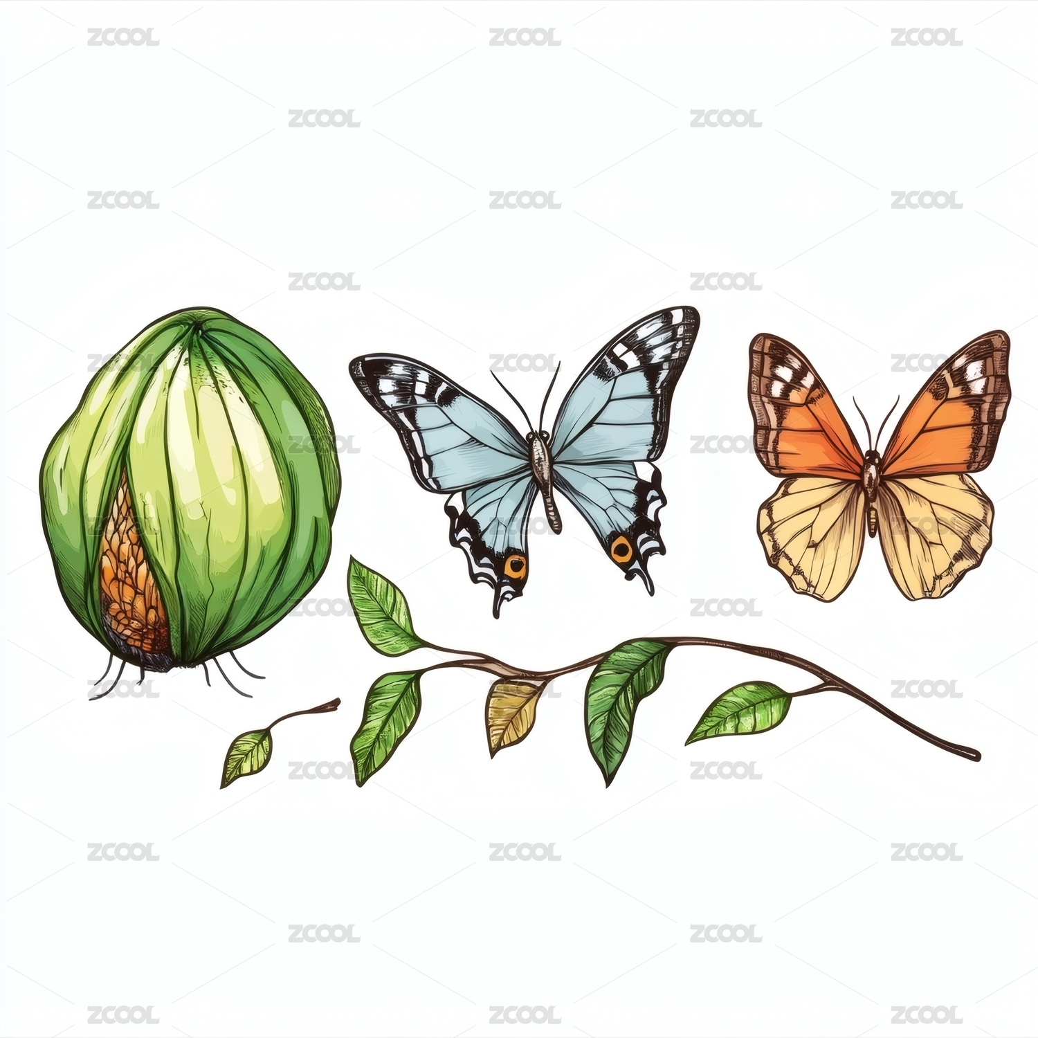 綠葉上的蝴蝶與蟲繭