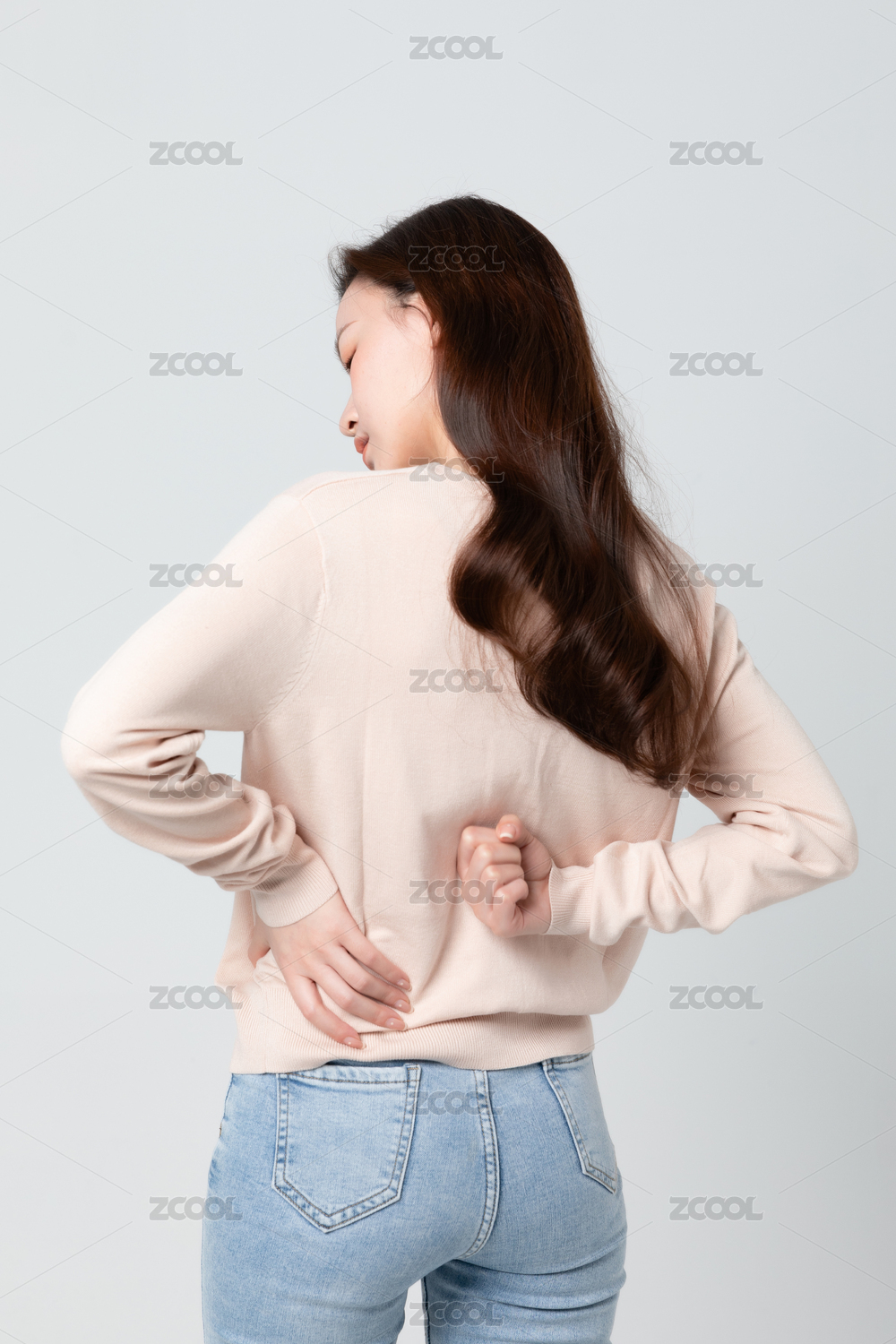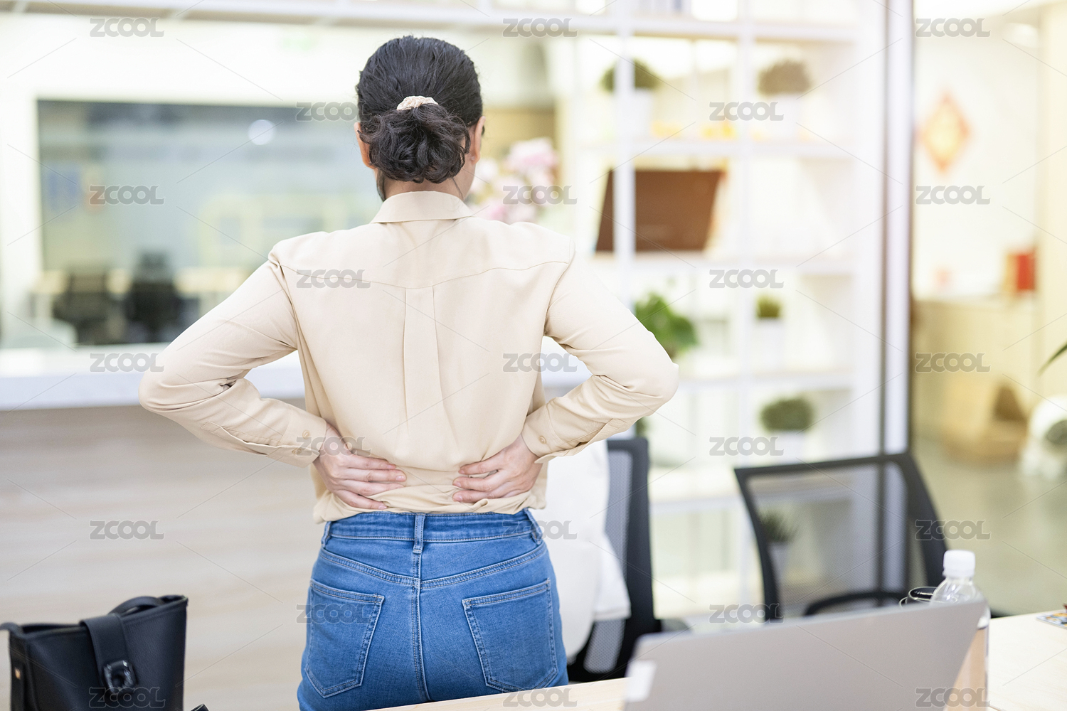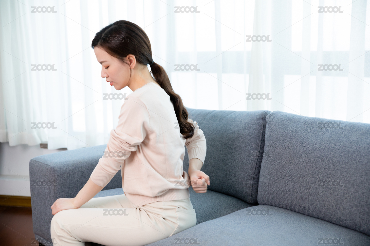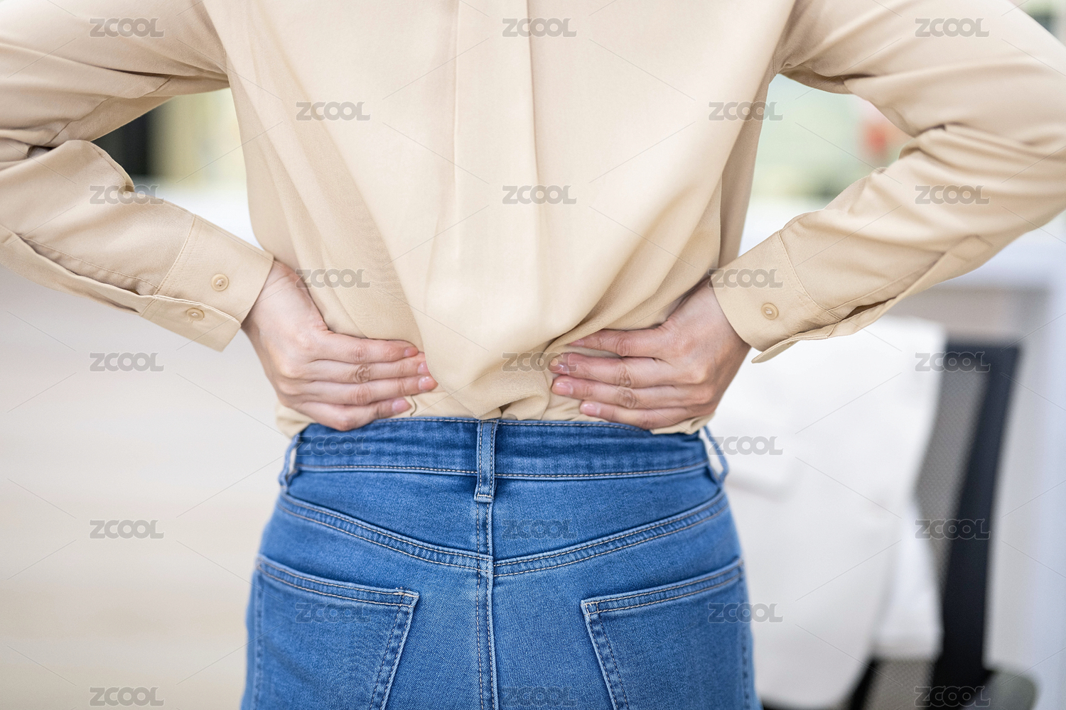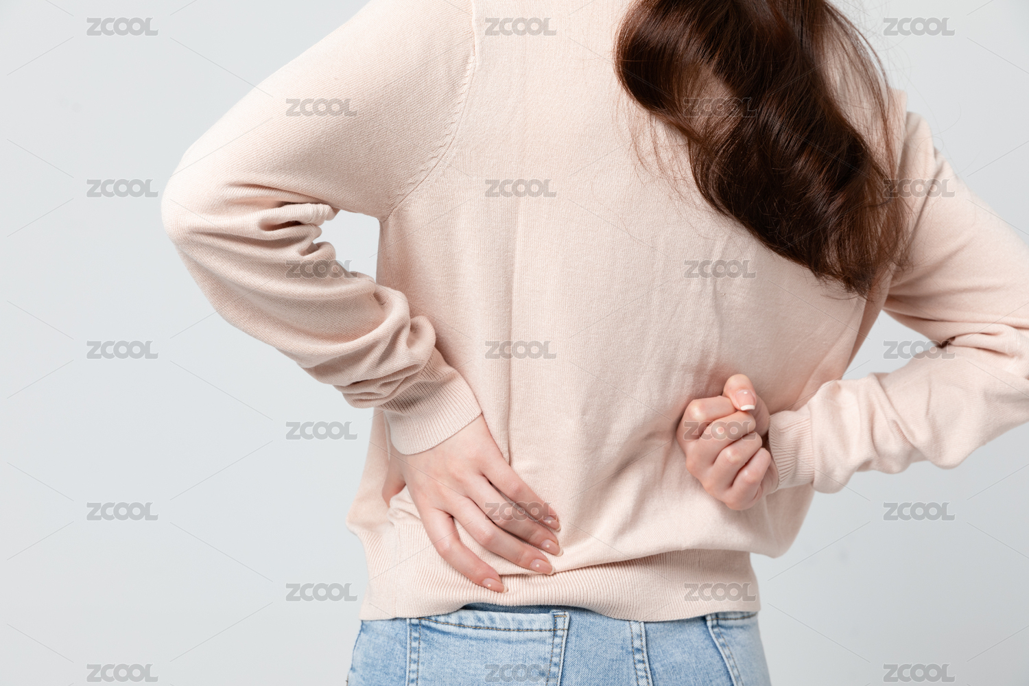 年輕女生腰酸背痛背影