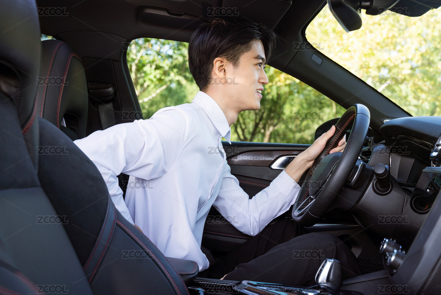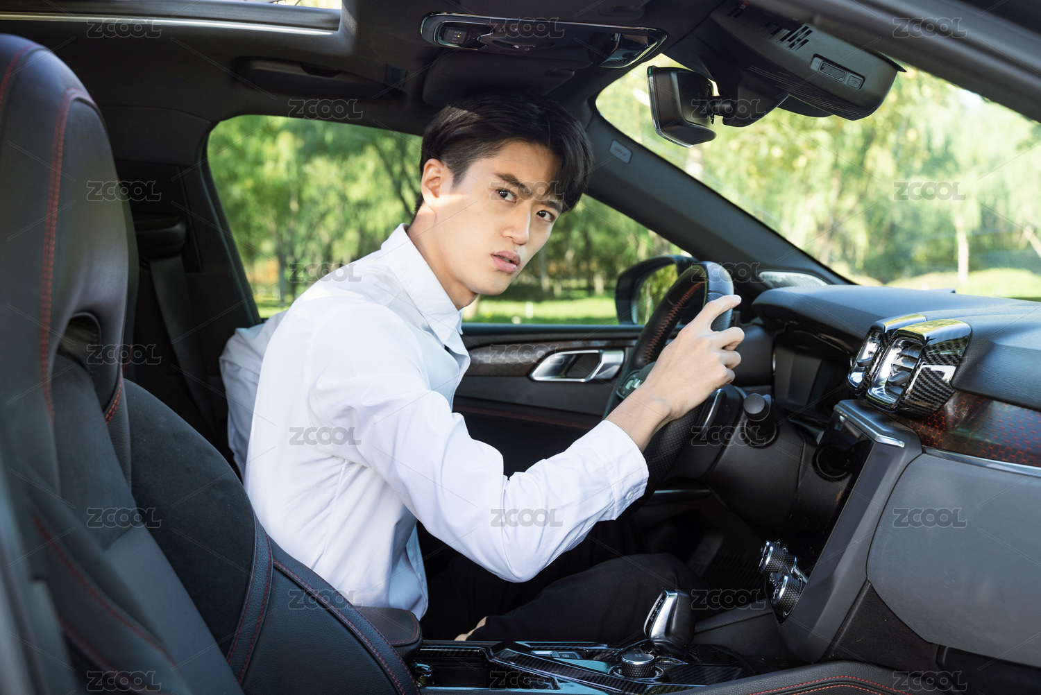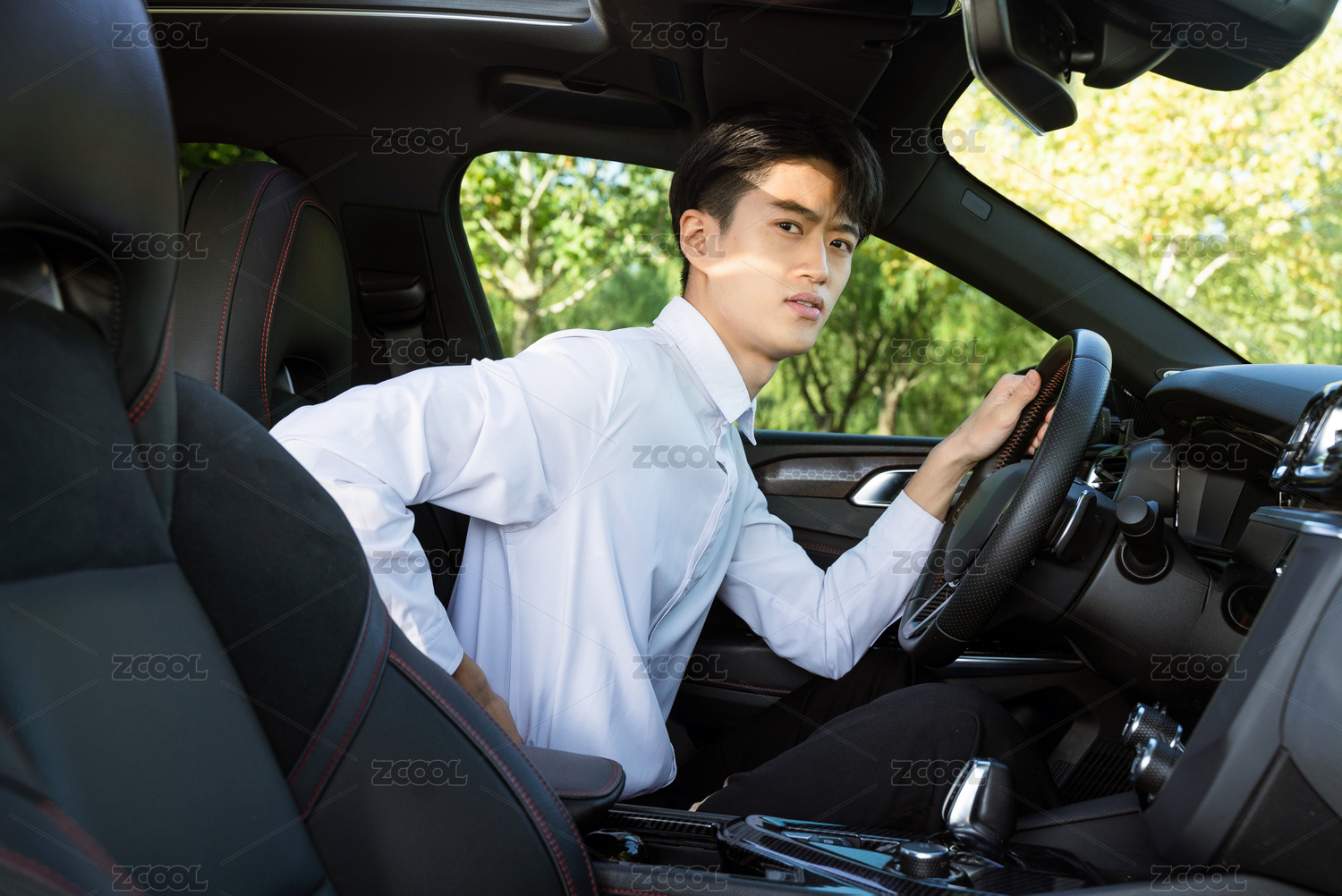 坐在車內(nèi)腰酸背痛的年輕男性司機(jī)