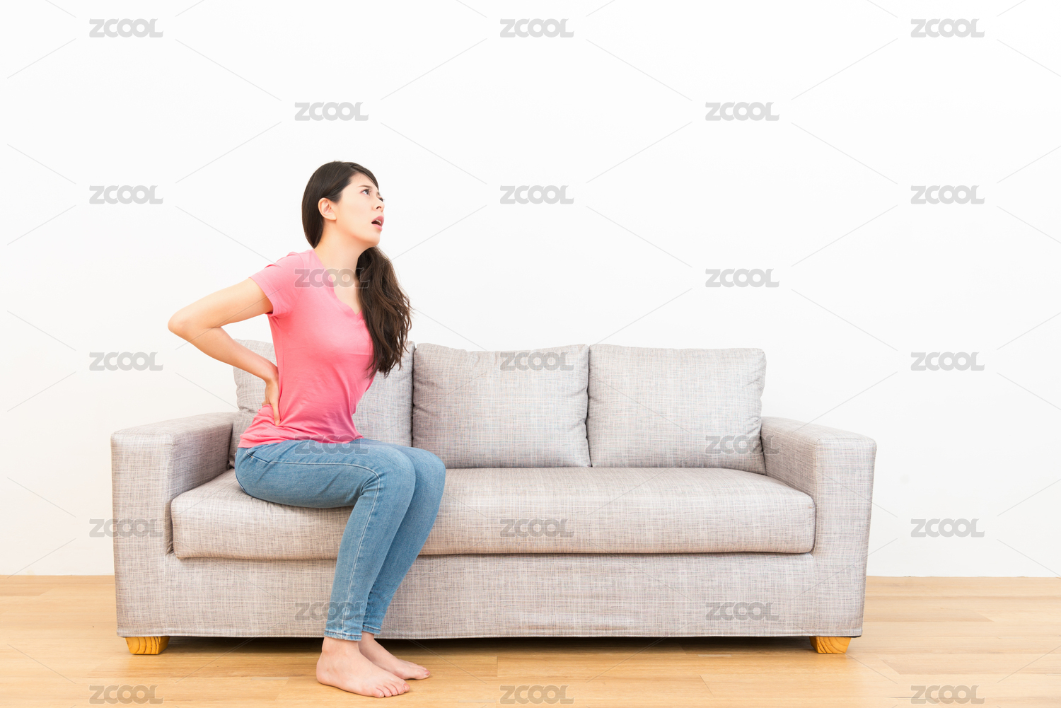 年輕主婦的感覺腰酸背累了坐在沙發(fā)上和休息片刻看著白色背景上的木地板。