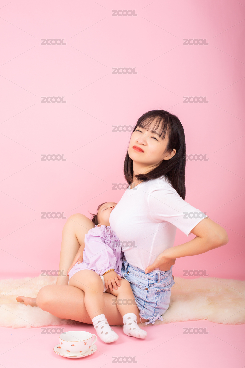 感到腰酸疲勞的亞洲媽媽 抱著孩子