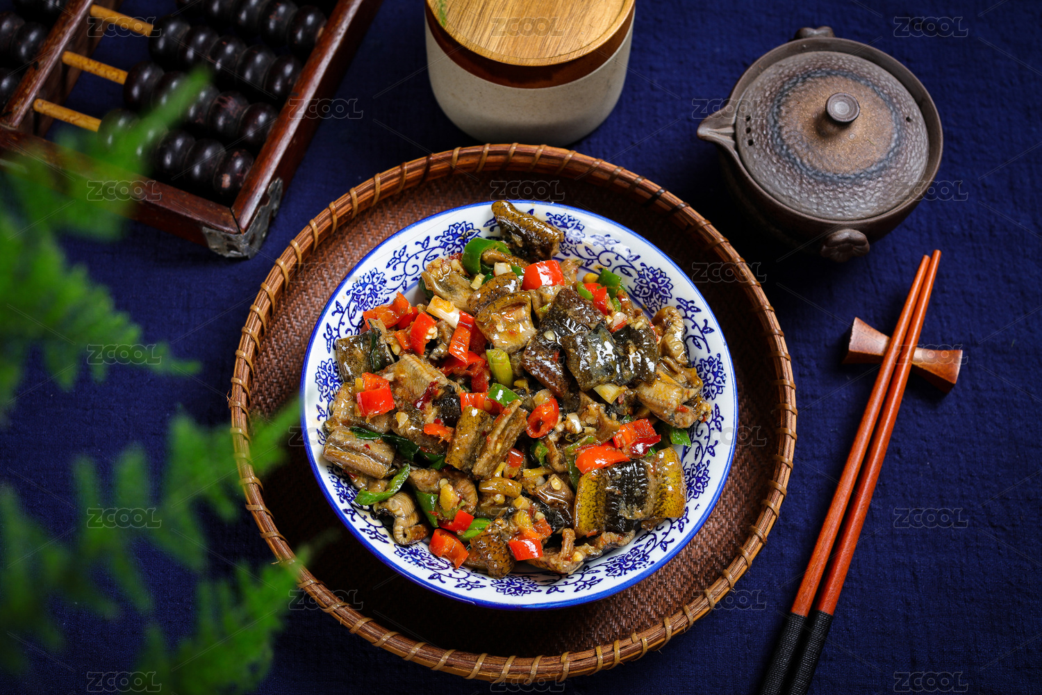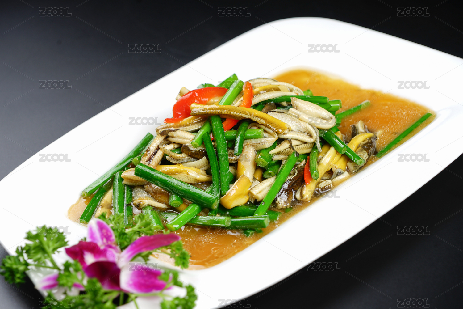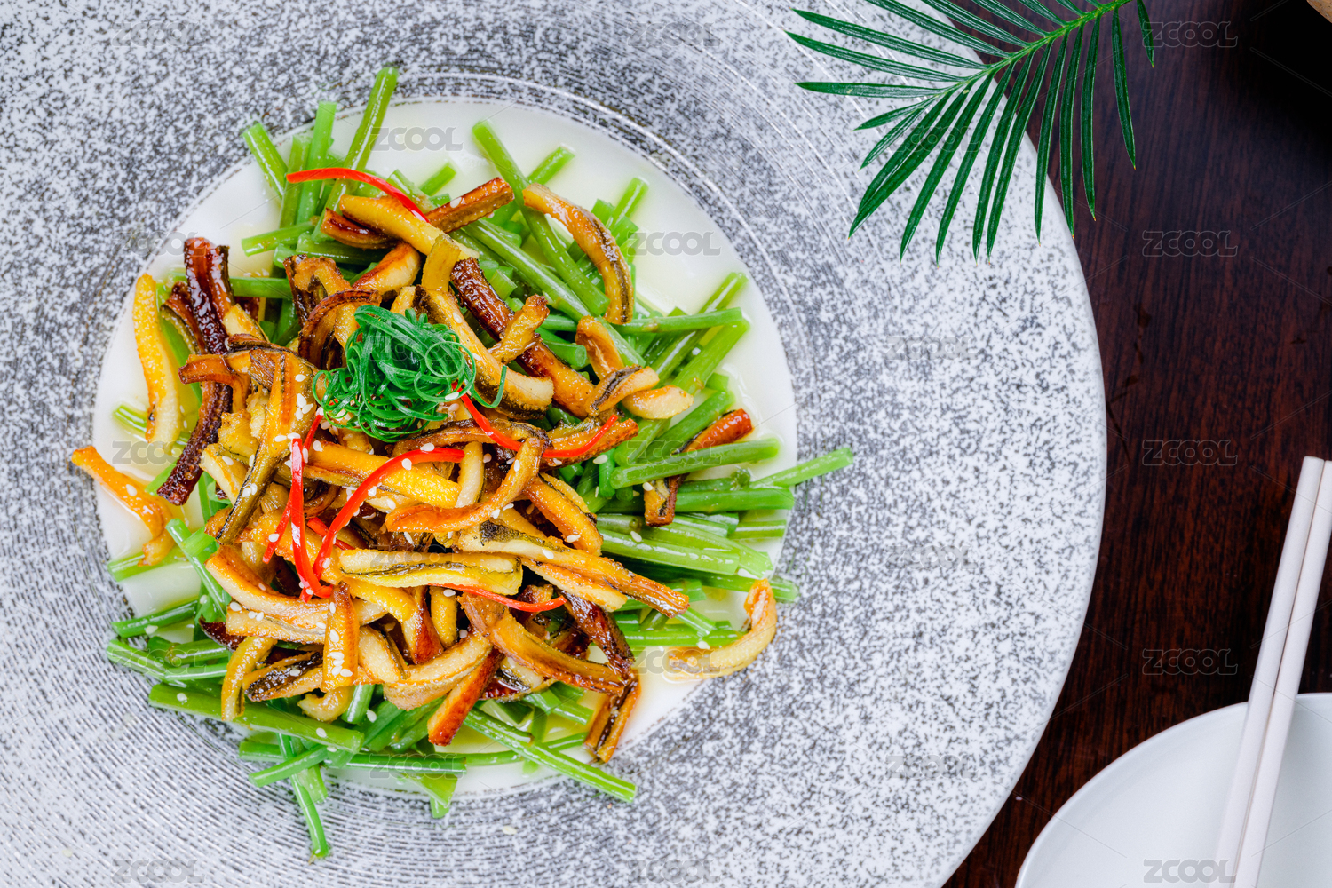 黑色背景白色盤子上蒜苔炒黃鱔絲