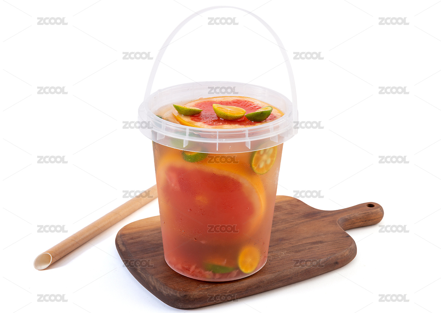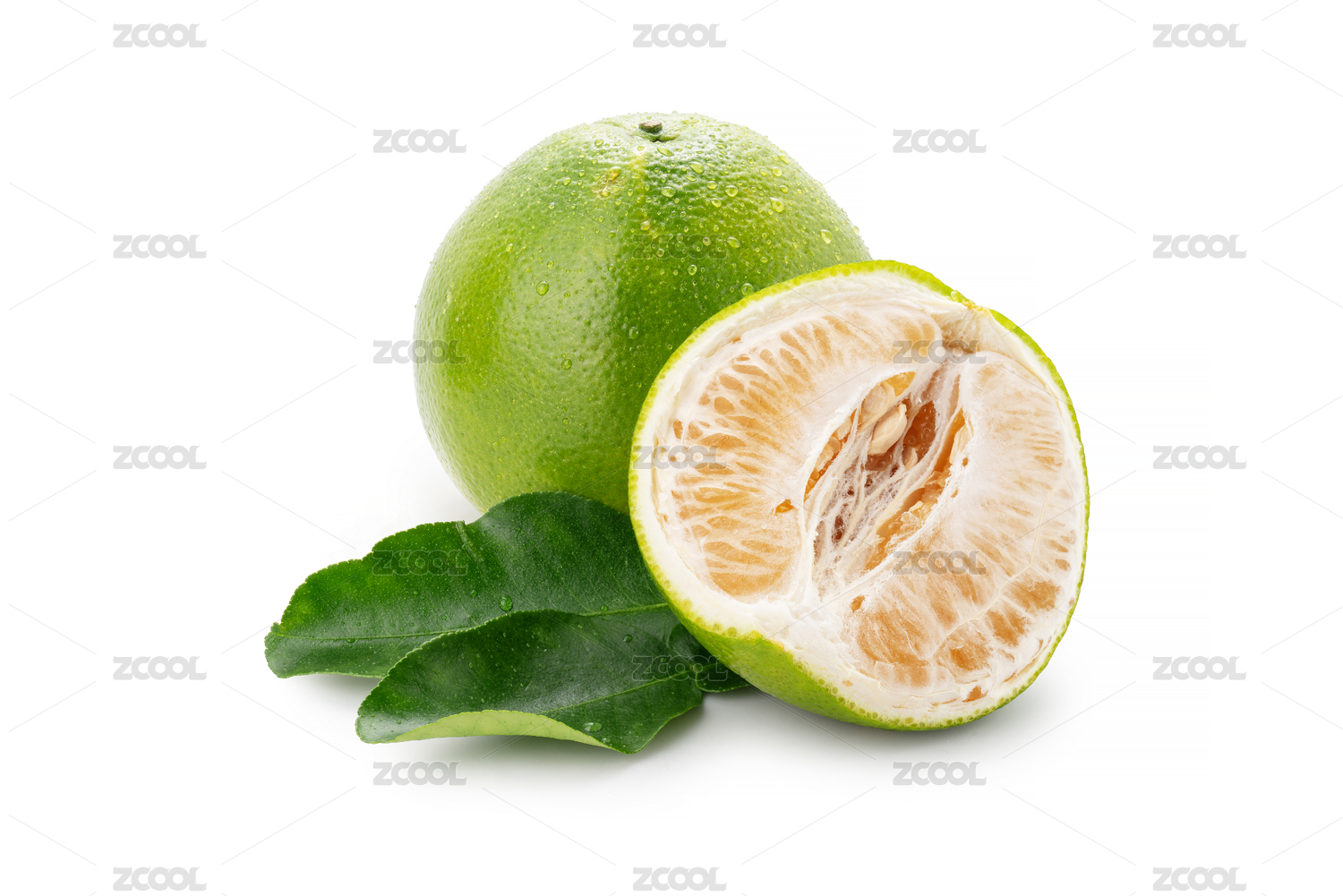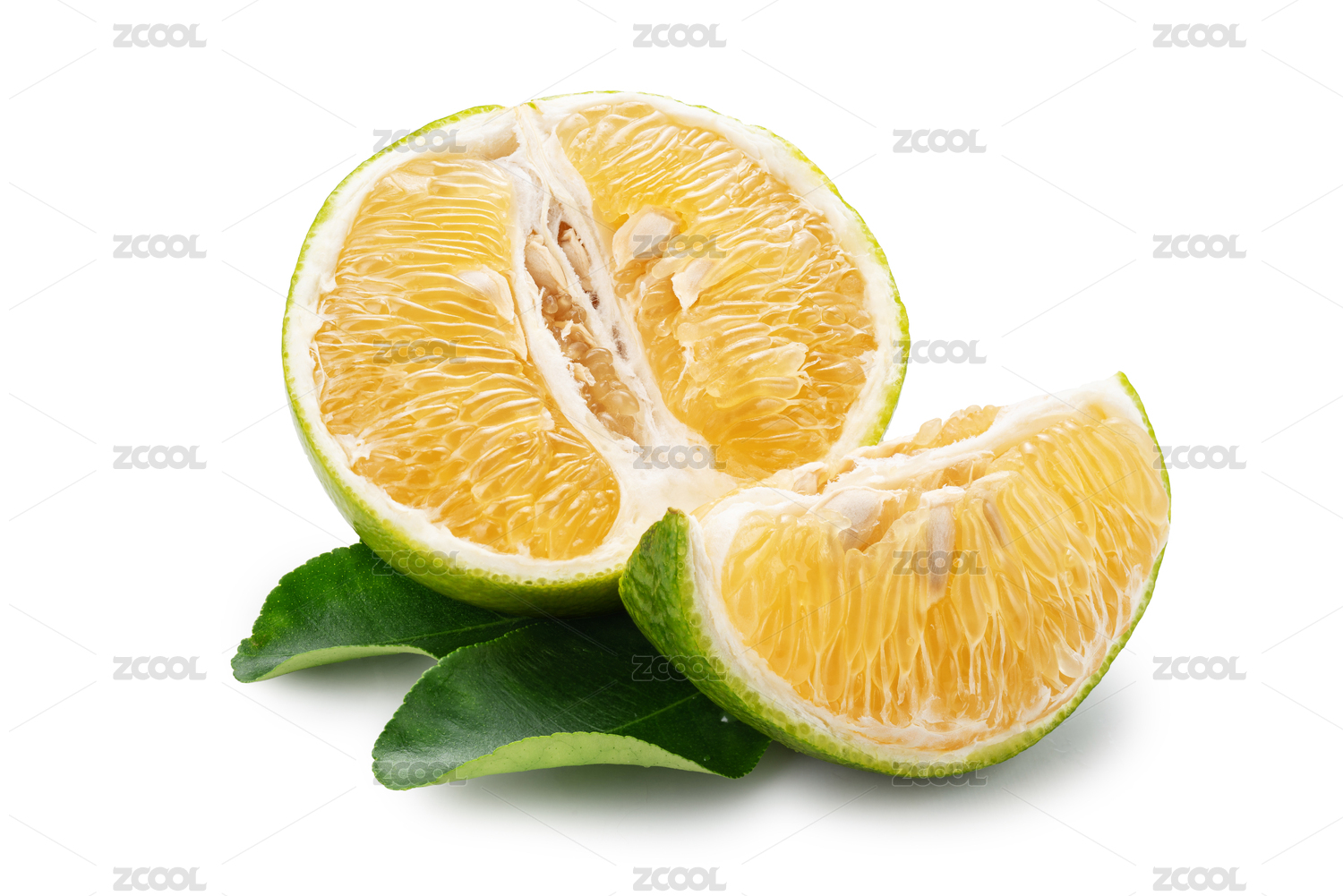 云南青蜜柚和剝開果肉帶綠葉子白底