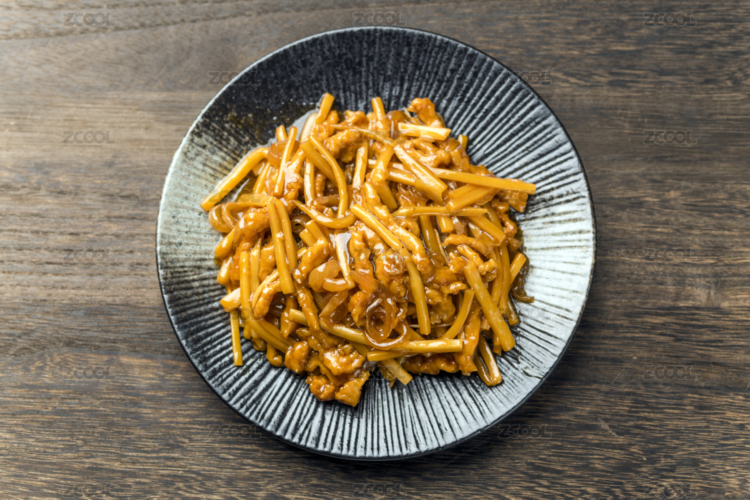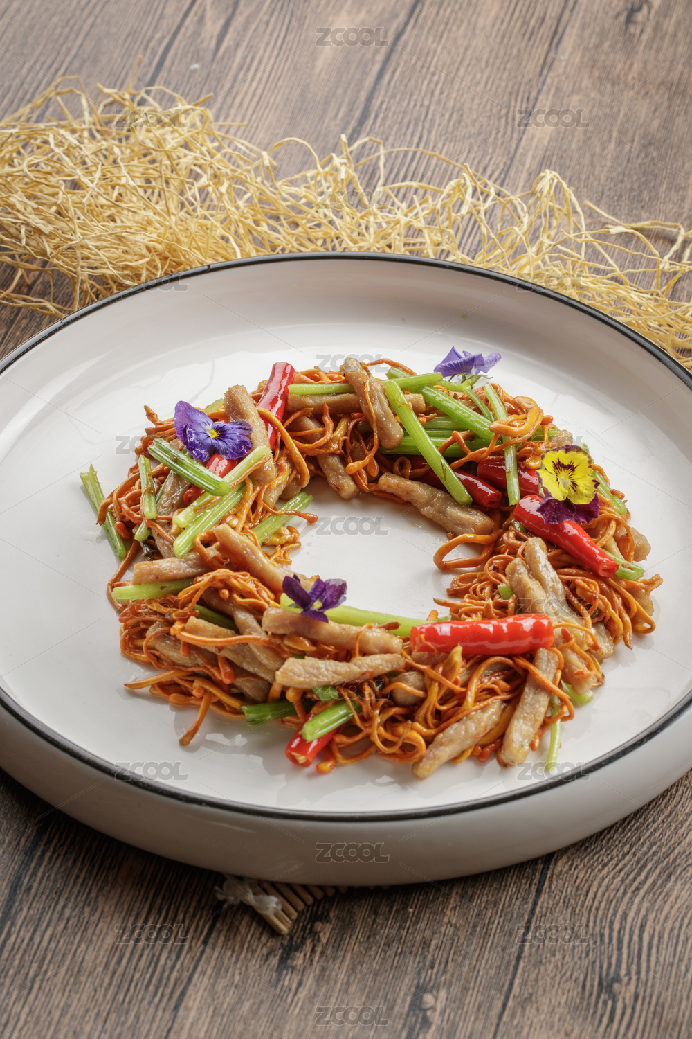 木質(zhì)底紋上的圓瓷盤裝的蟲草花煸里脊絲