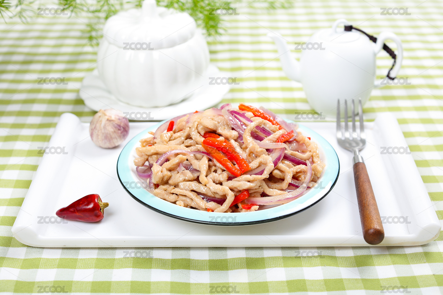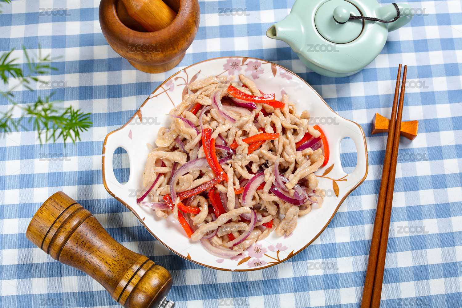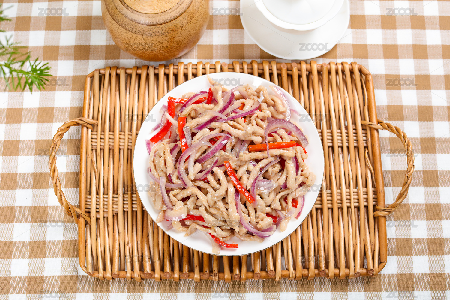 一盤燒三絲擺放在古窗欞木桌面上特寫