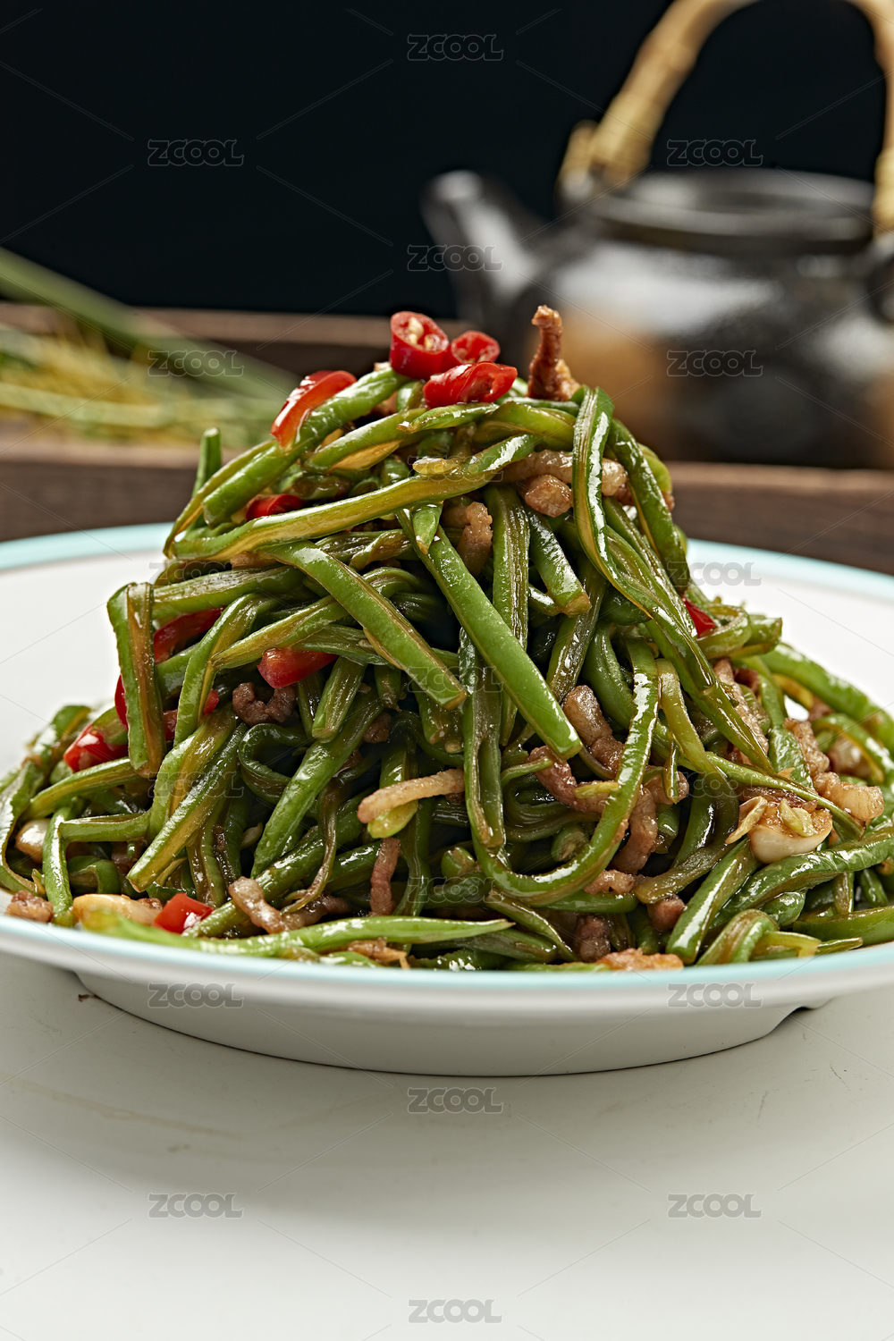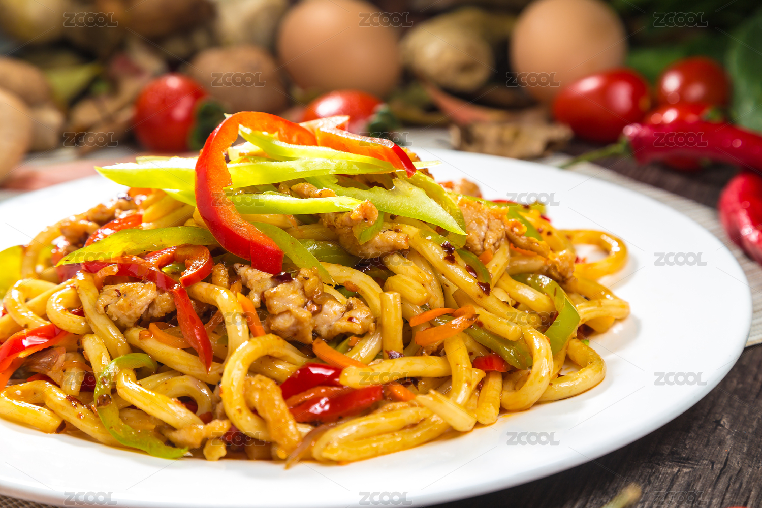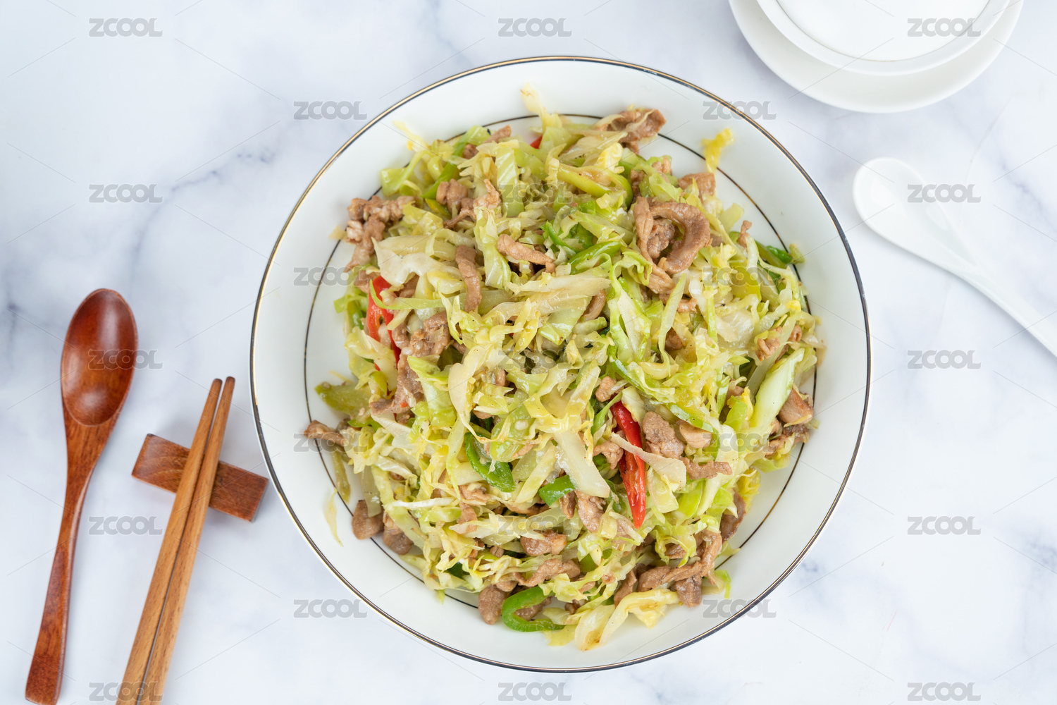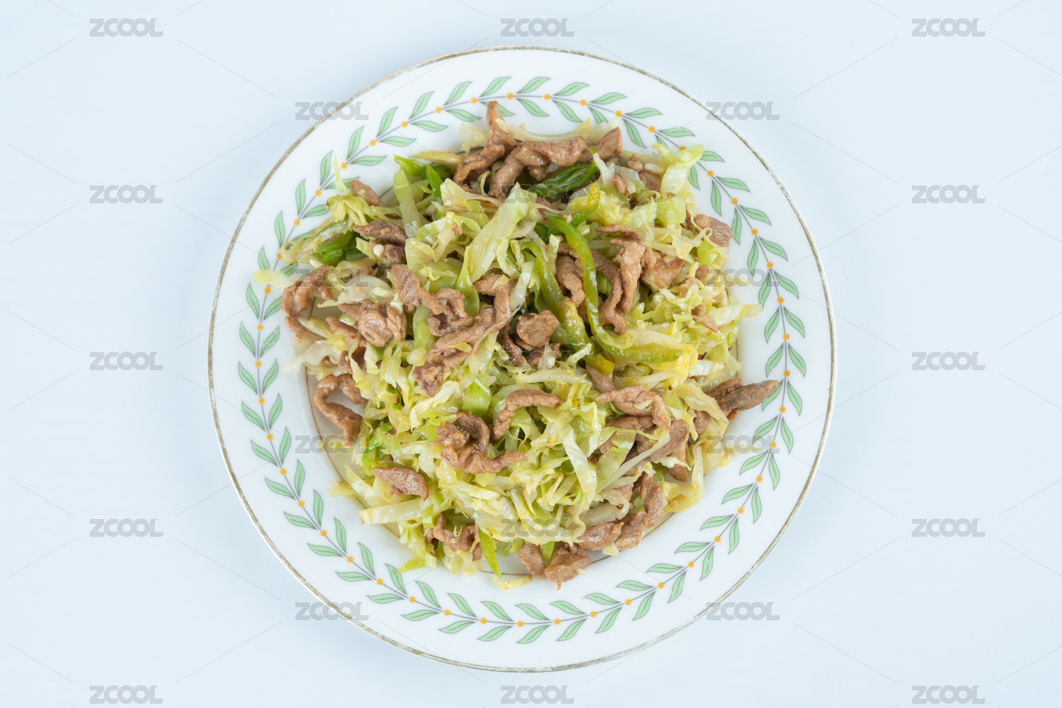 一盤燒三絲擺放在古窗欞木桌面上特寫