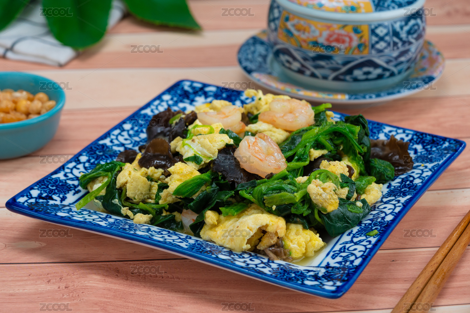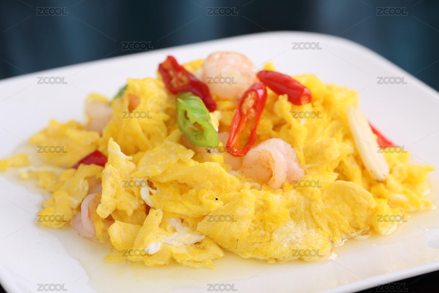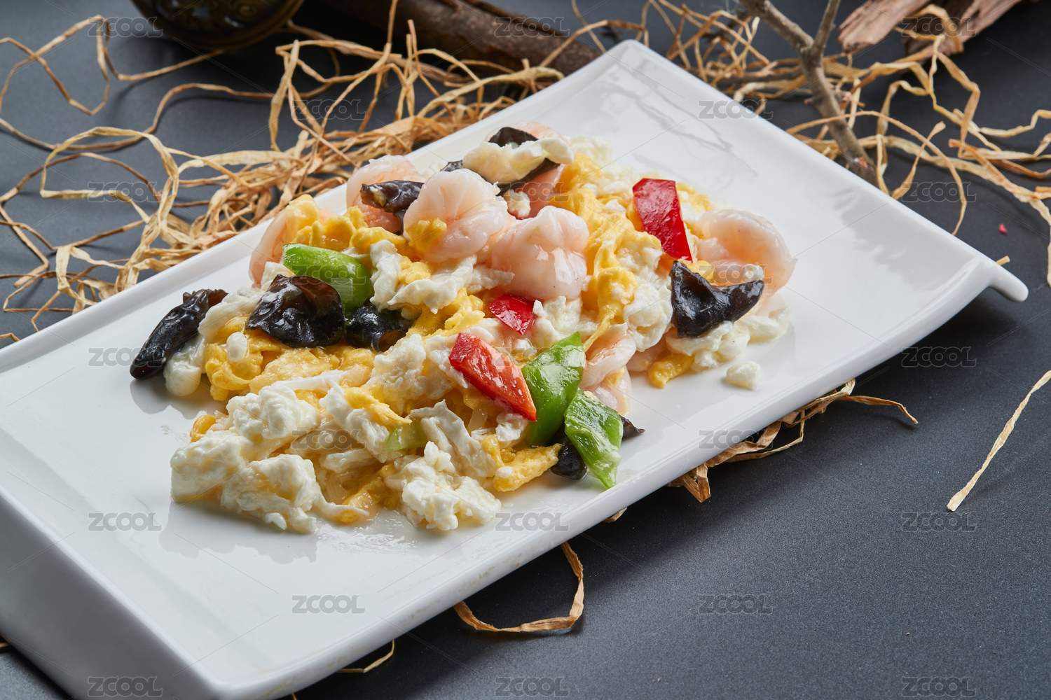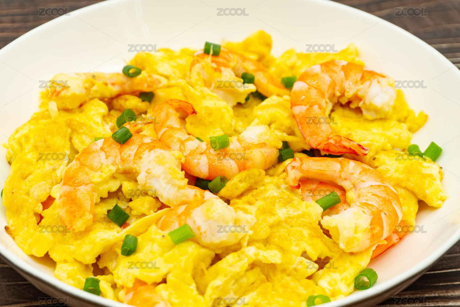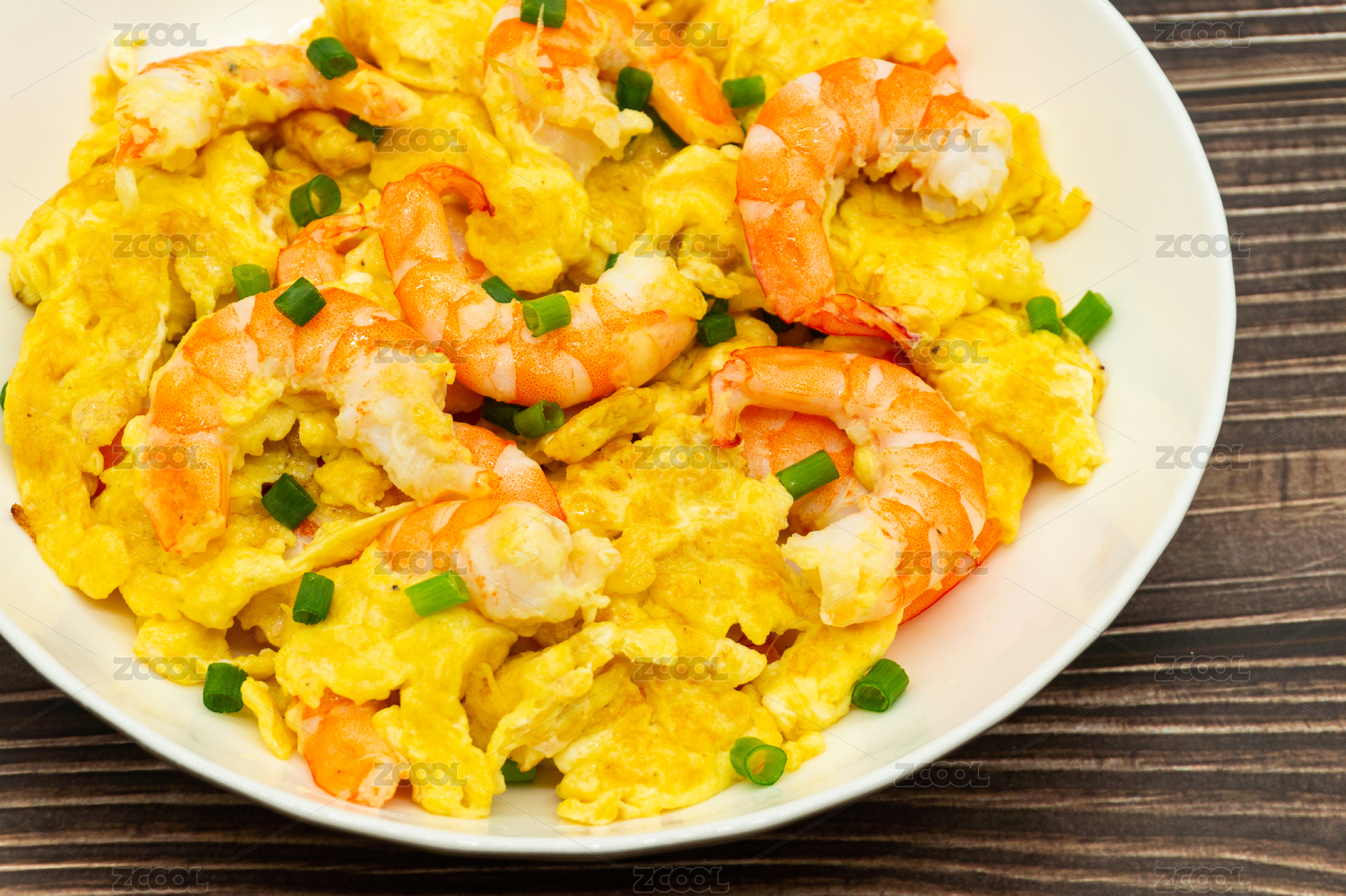 木桌背景一盤家常菜蝦仁炒蛋特寫