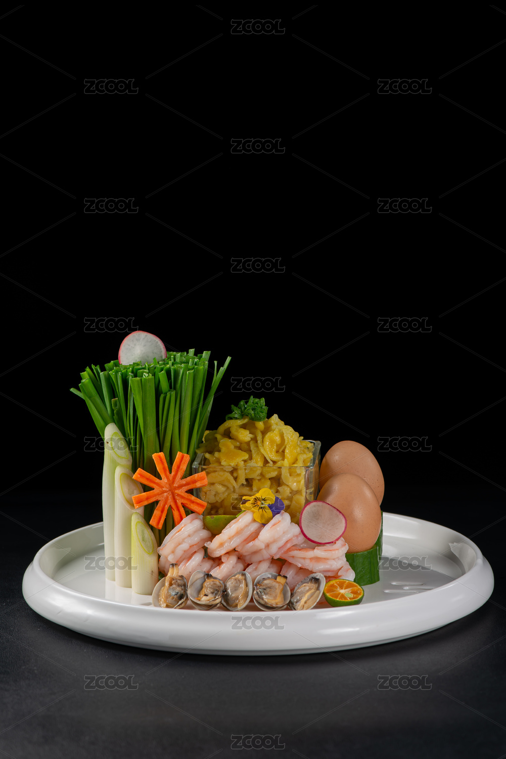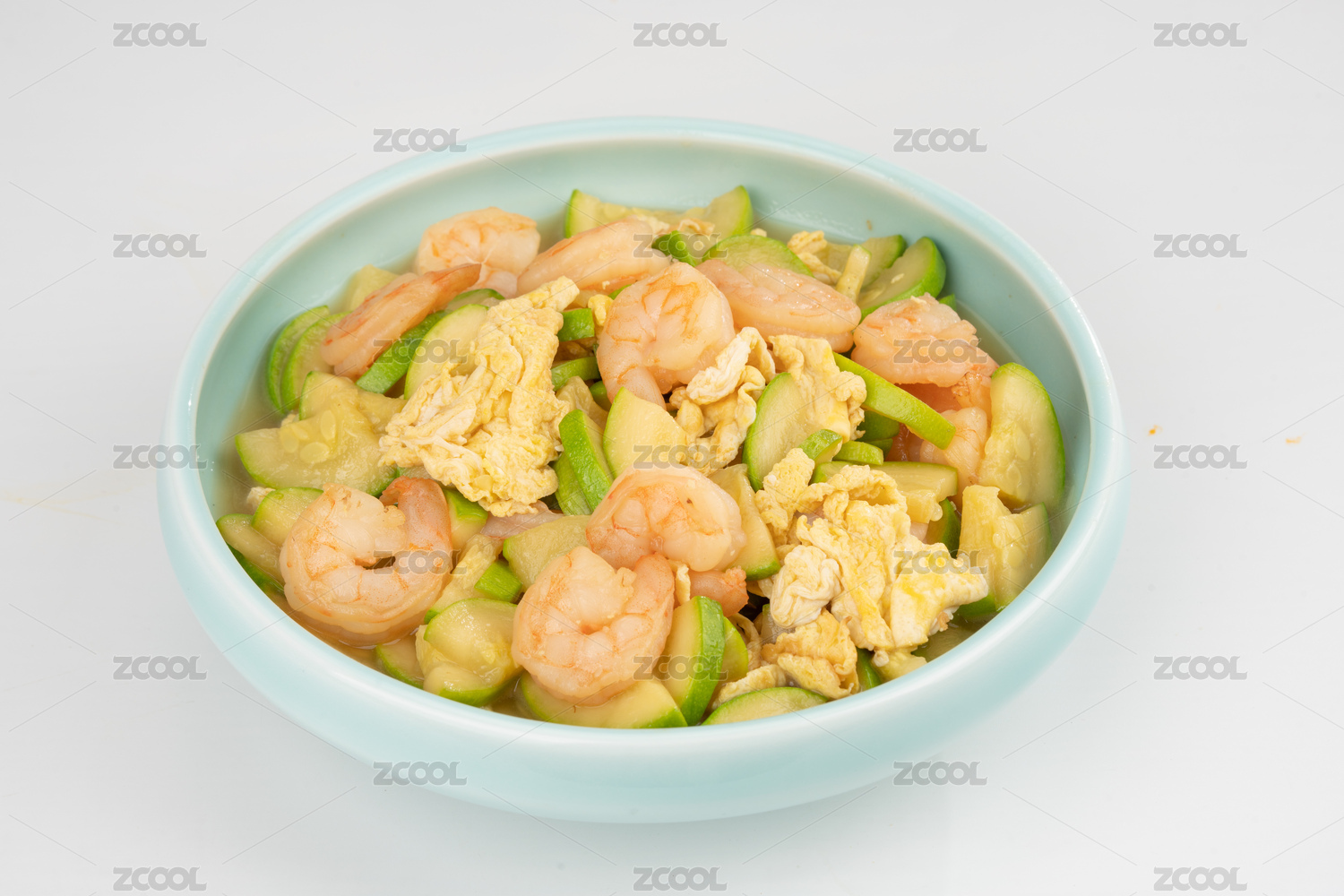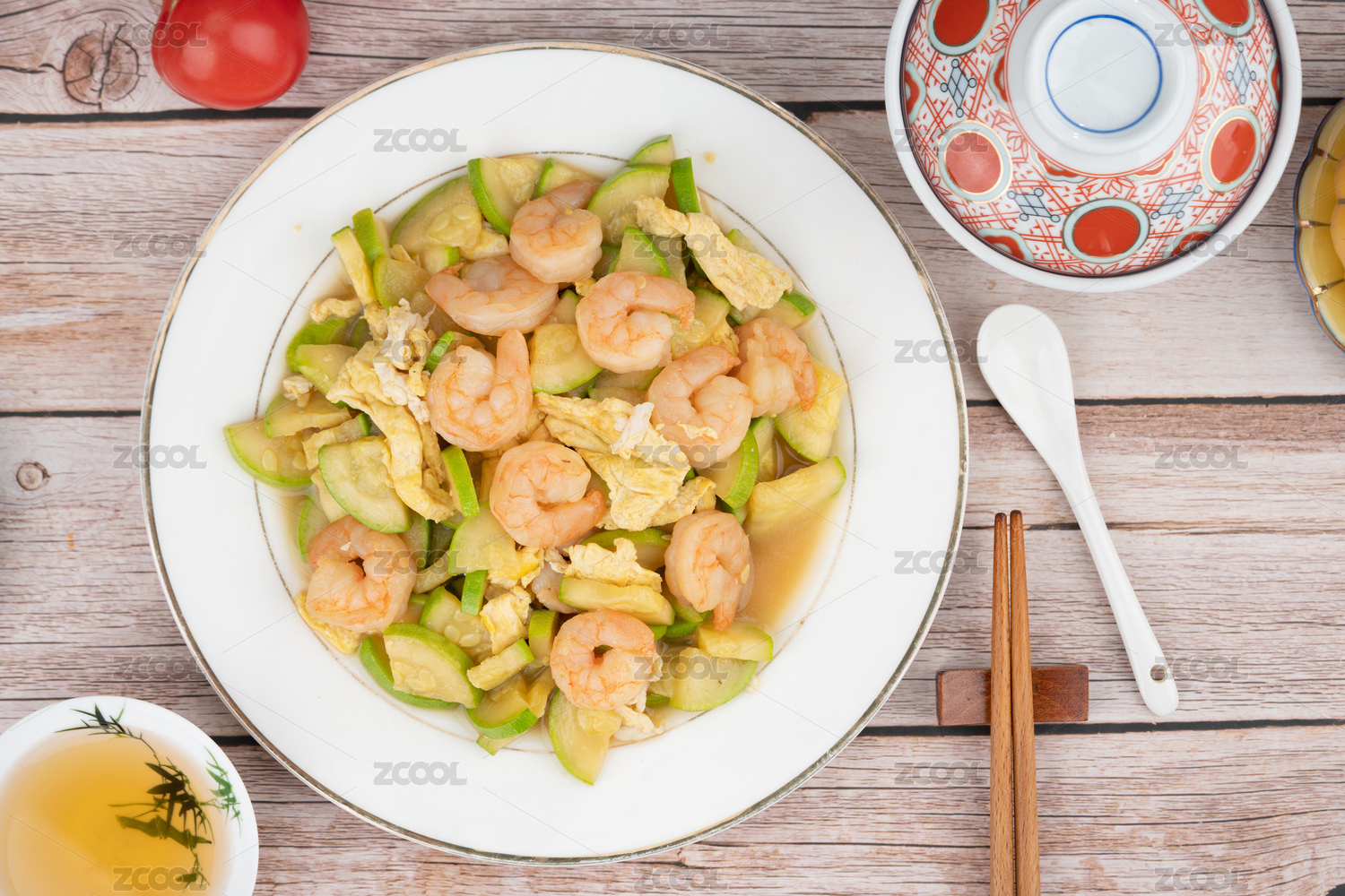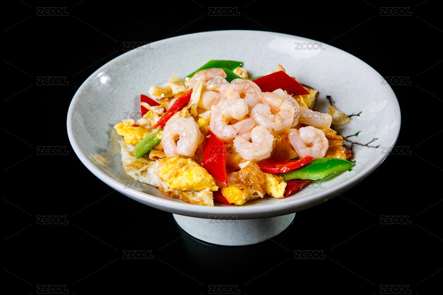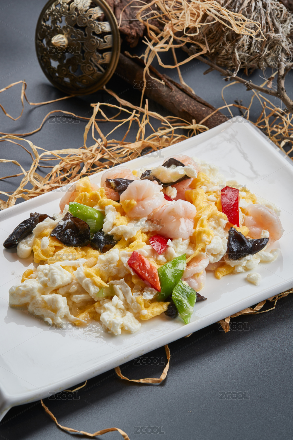 木桌背景一盤家常菜蝦仁炒蛋特寫