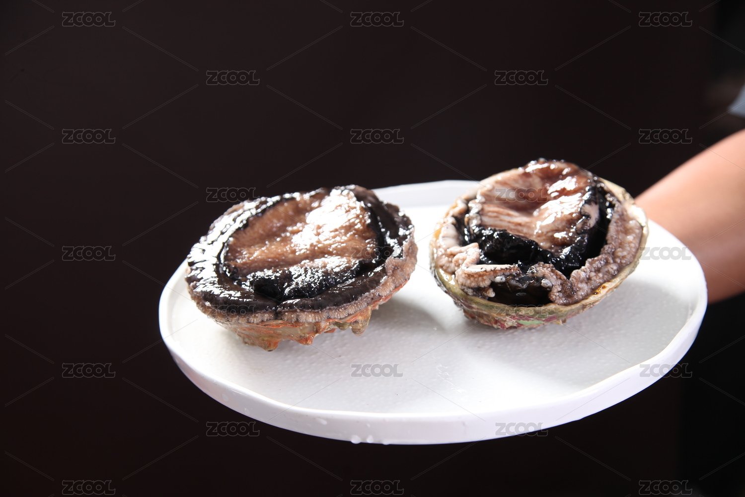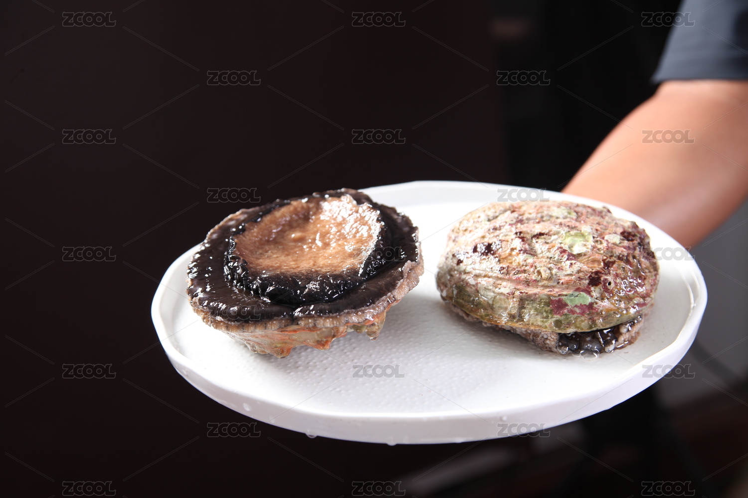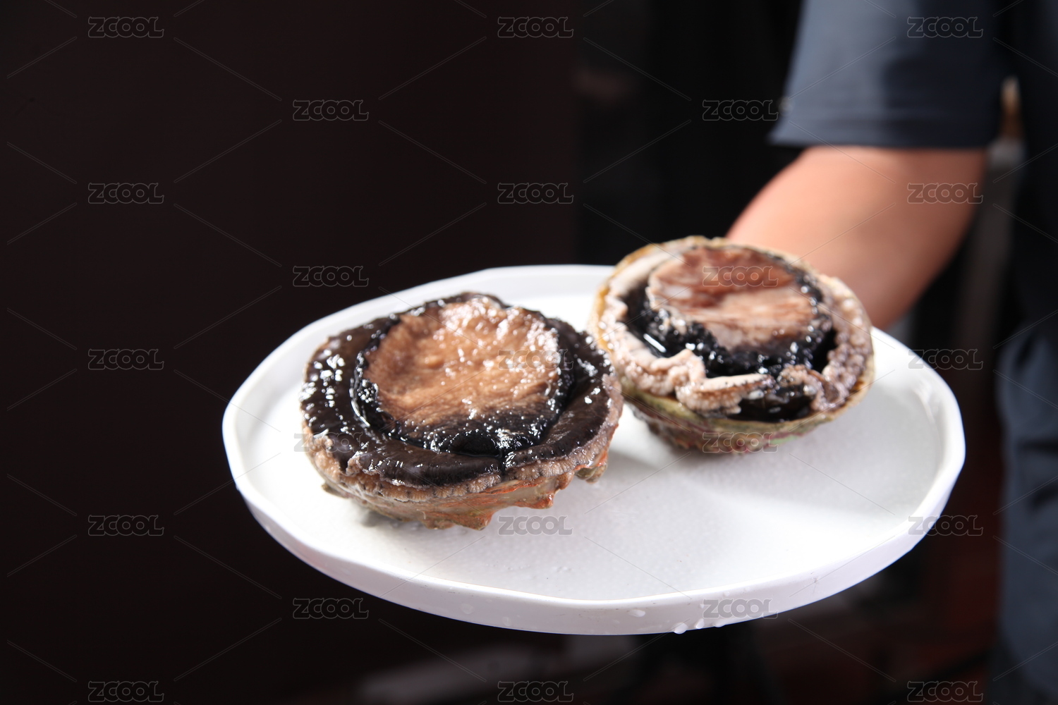 淺灰色背景上黑色圓盤中的堂灼澳洲鮑魚