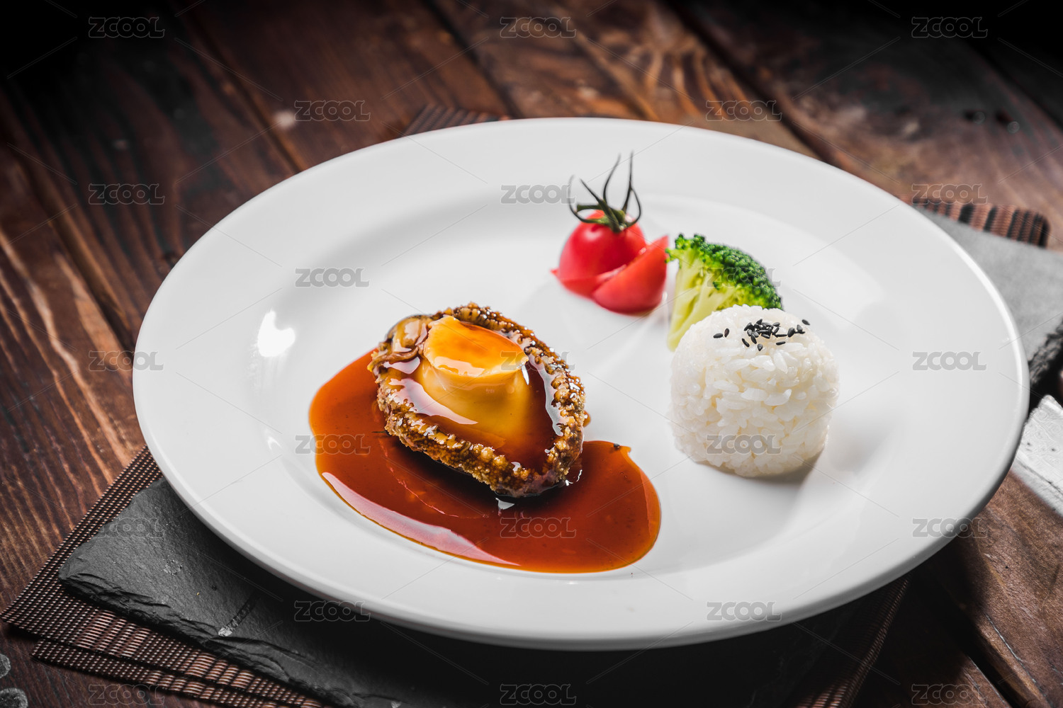棕色木紋桌上放著一盤鮮鮑扣飯