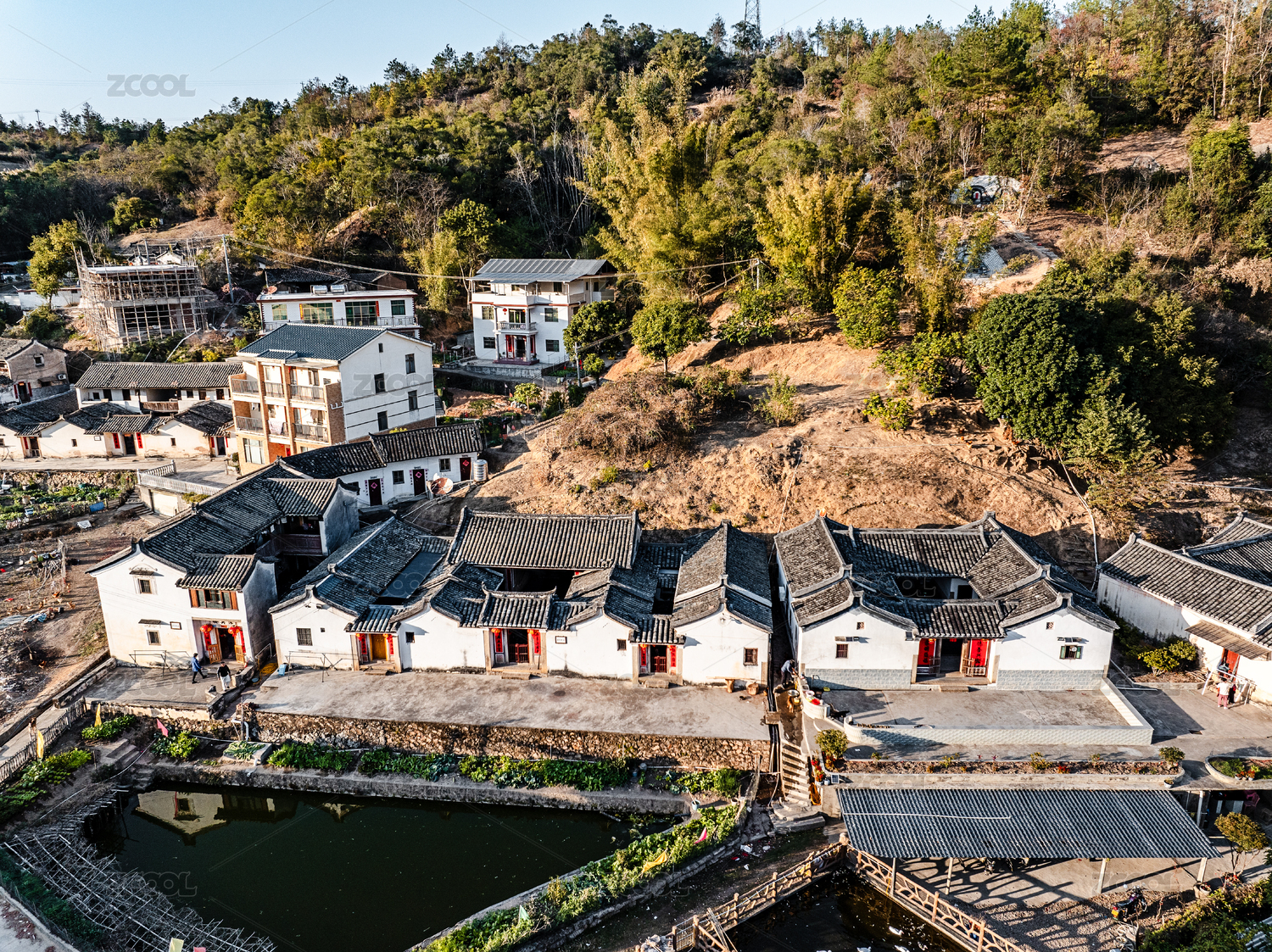夕陽(yáng)下航拍福建下洋鎮(zhèn)初溪村
