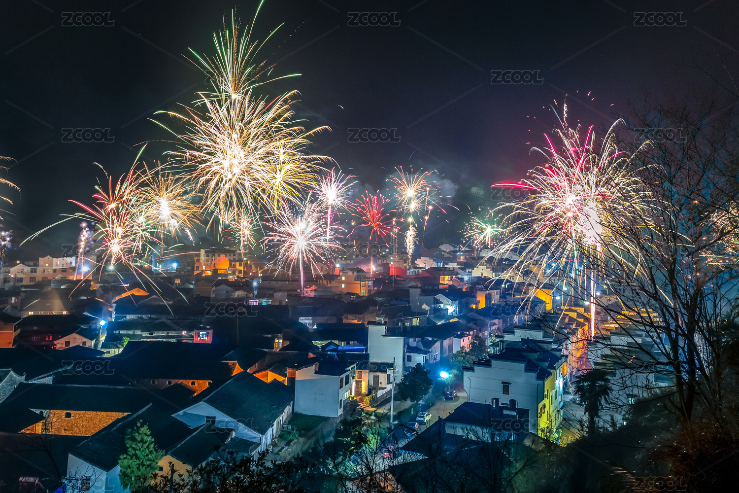 浙江磐安櫸溪村古村落賀歲煙花夜景風(fēng)光