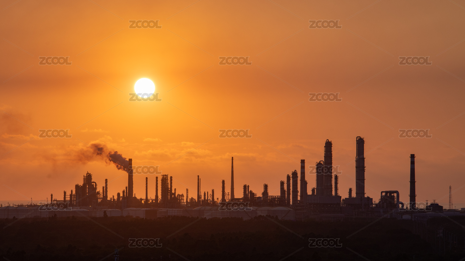 夕陽余暉中的上海化工區(qū)煉化設(shè)備林立風(fēng)光