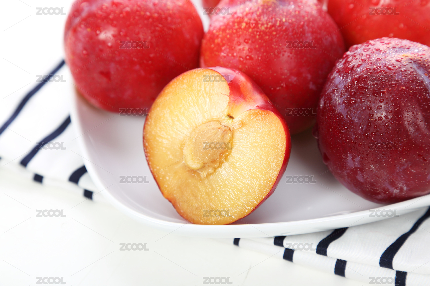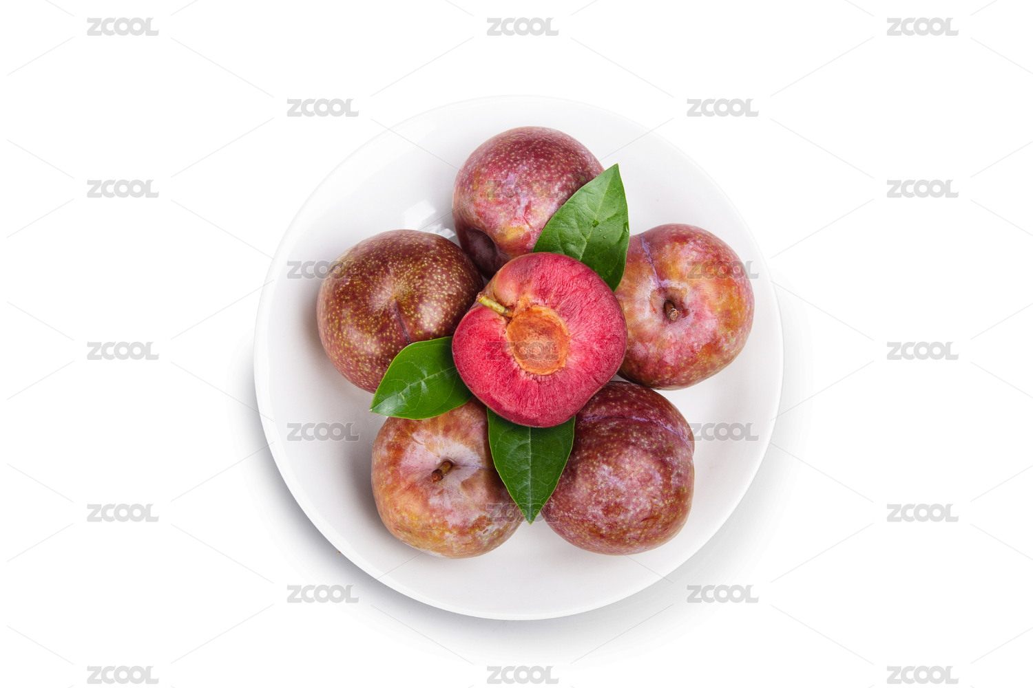 三華李和切開果肉帶綠葉子裝白盤白底