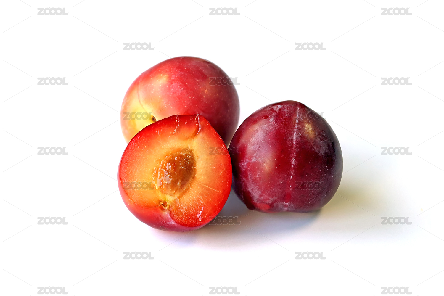 三華李和切開果肉帶綠葉子白底