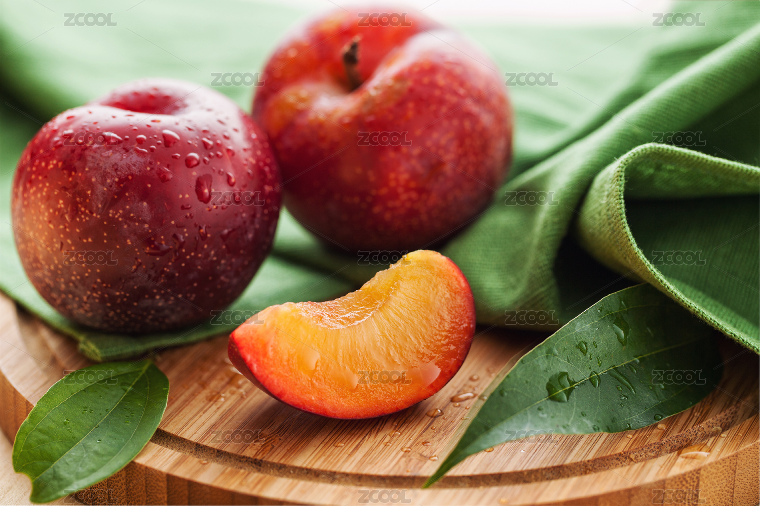 紅色李子和切開果肉帶綠葉放綠布木板上