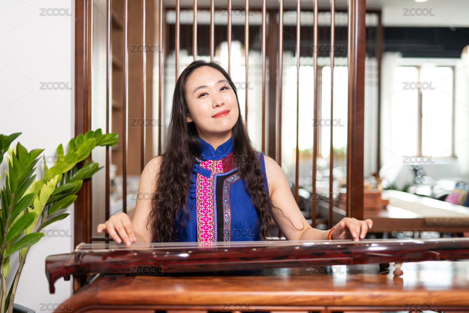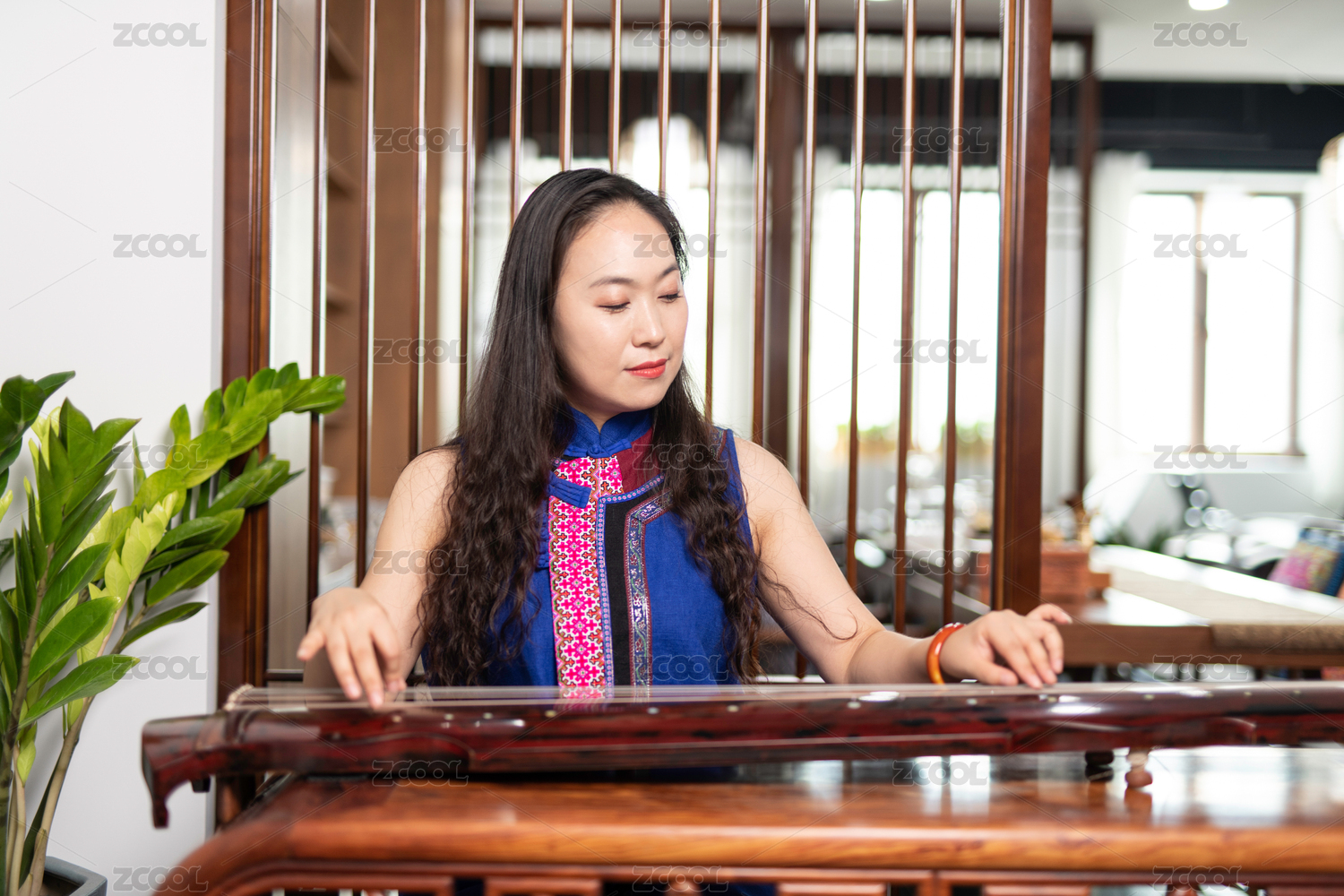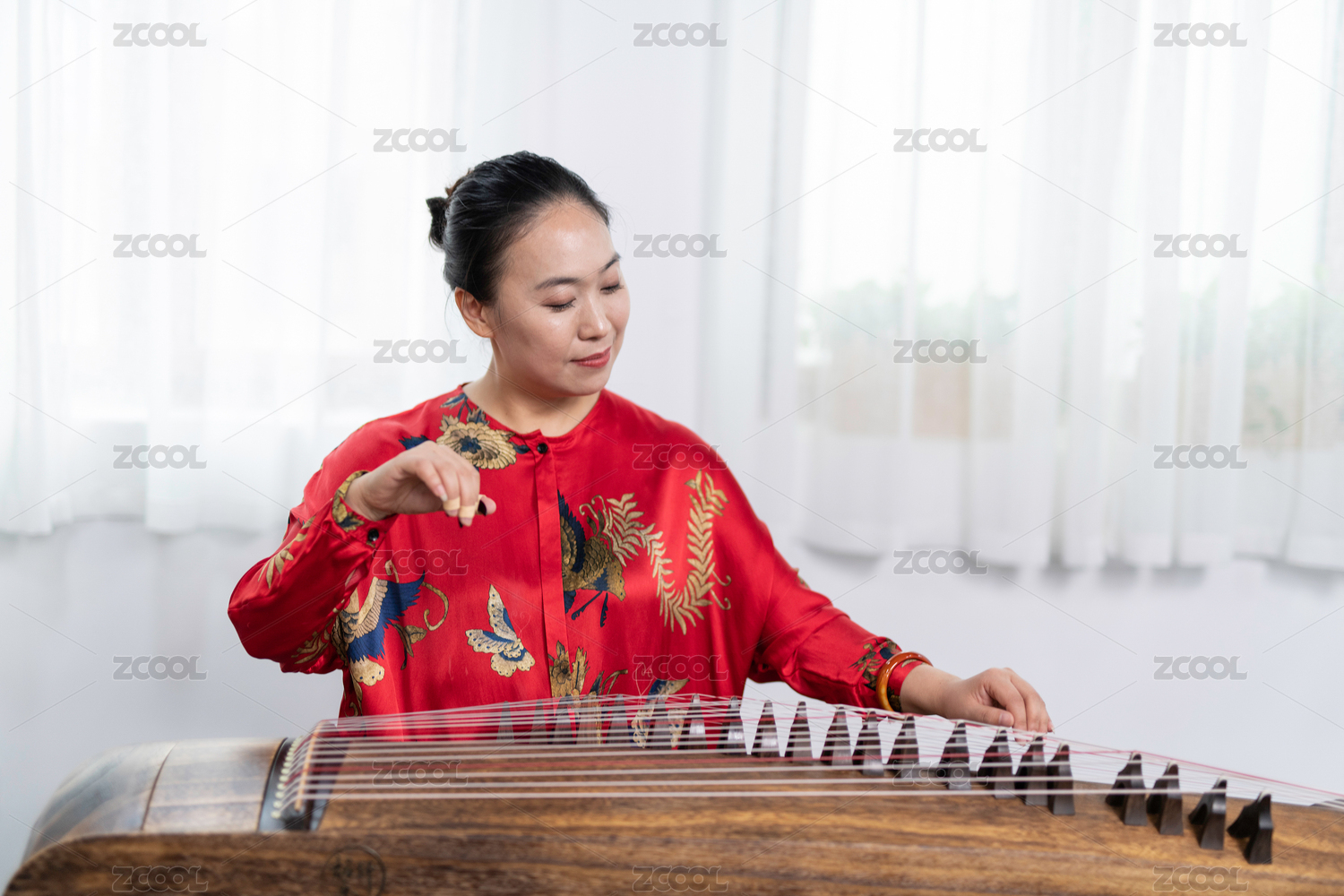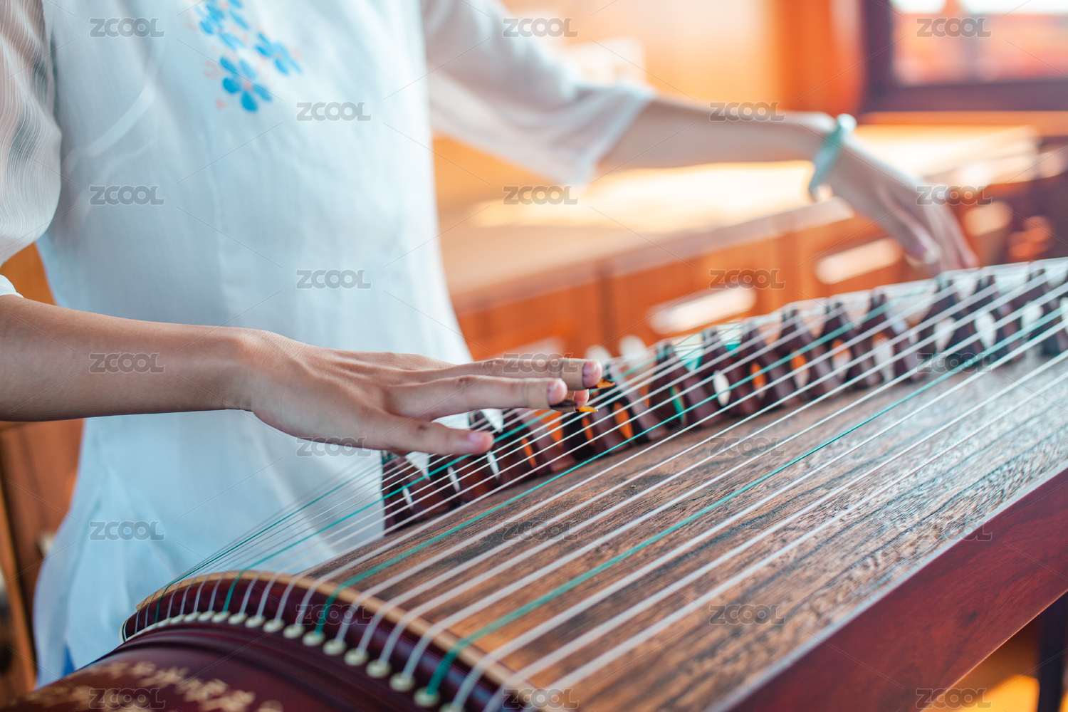 美麗的年輕女子演奏古箏。傳統(tǒng)的東方弦樂器