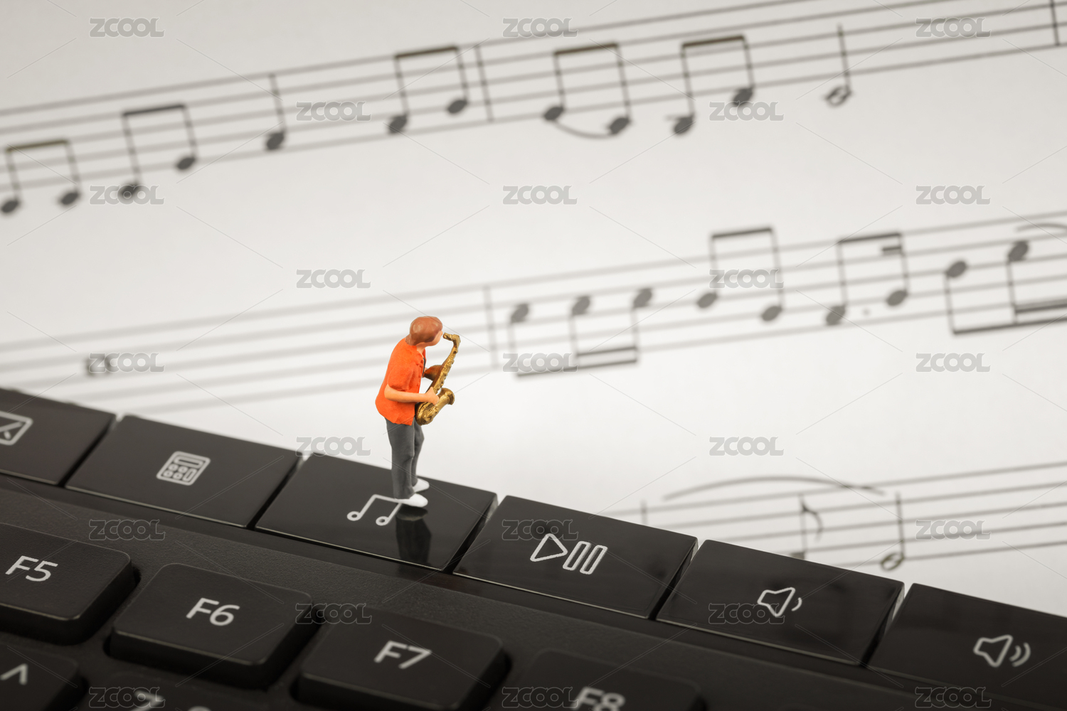 微縮創(chuàng)意音符音樂計(jì)算機(jī)鍵盤上演奏薩克斯