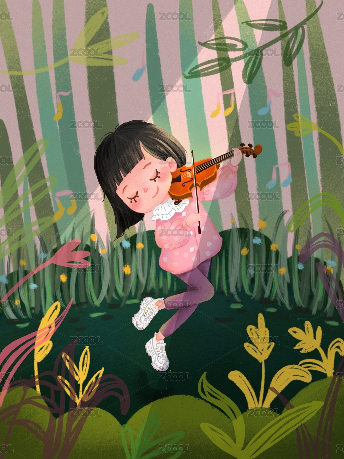 大自然中演奏的女孩插畫