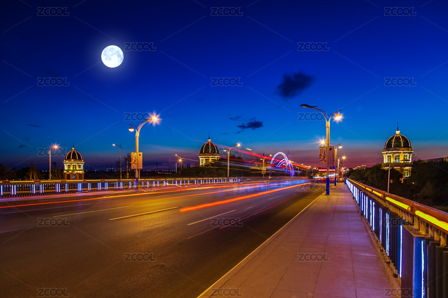 黑龍江省哈爾濱市夜晚月亮光照松花江大橋