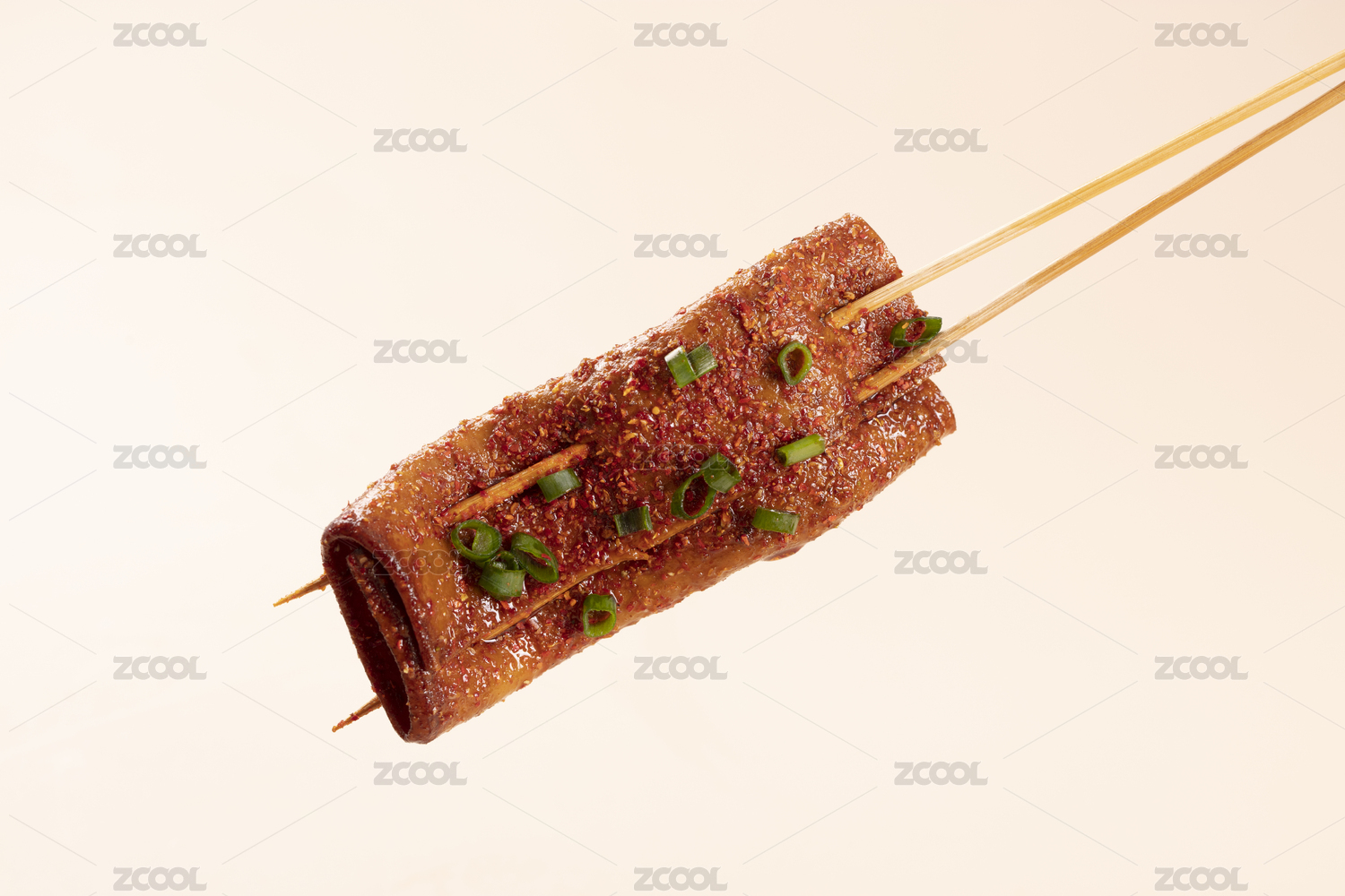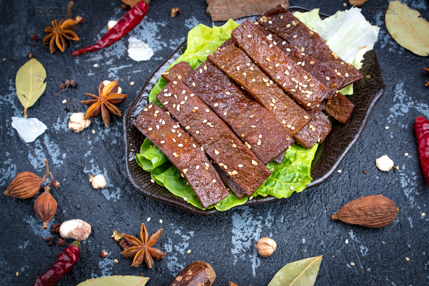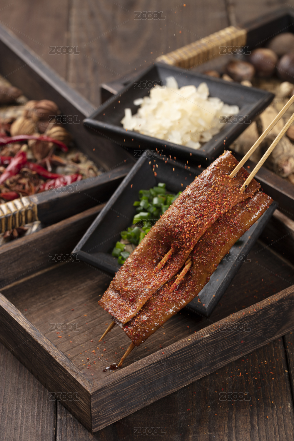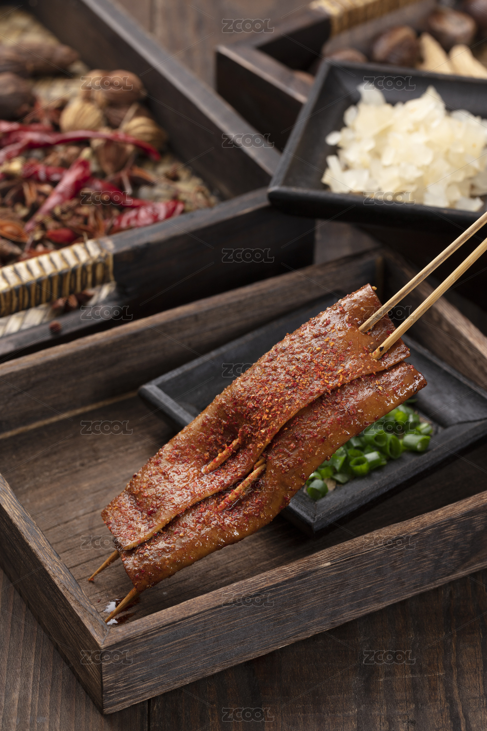 美味的五香醬干烤串放在白色的瓷器盤子上面