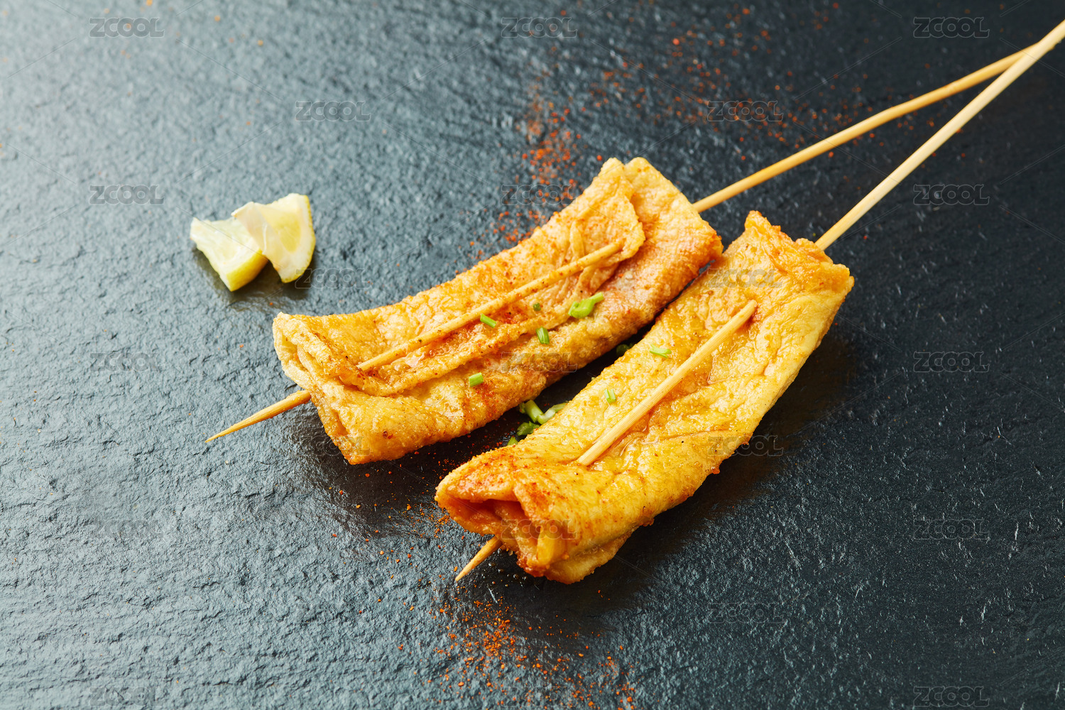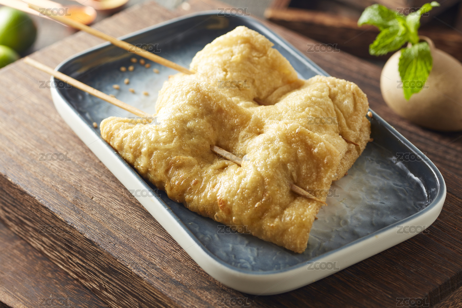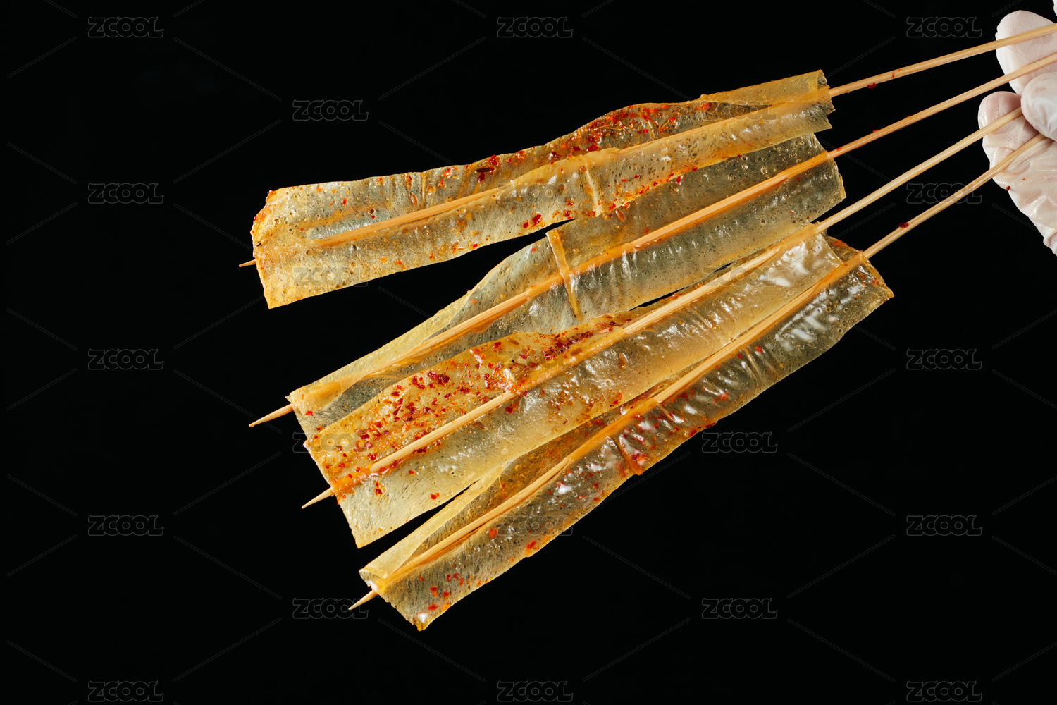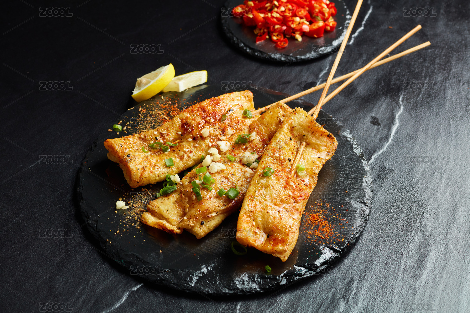 美味的五香醬干烤串放在白色的瓷器盤子上面