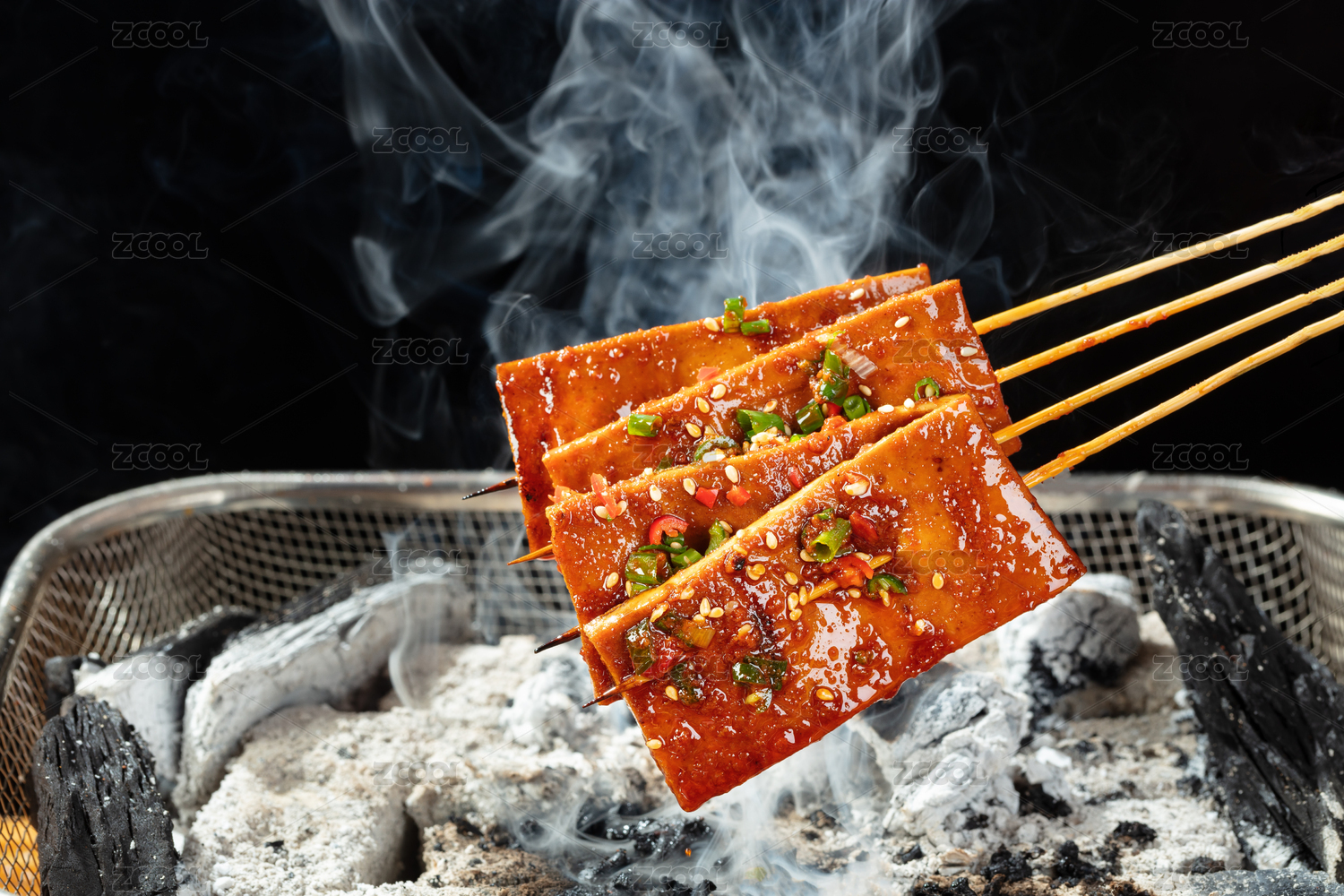 炭火燒烤架上正在烤著的小吃麻辣烤豆干