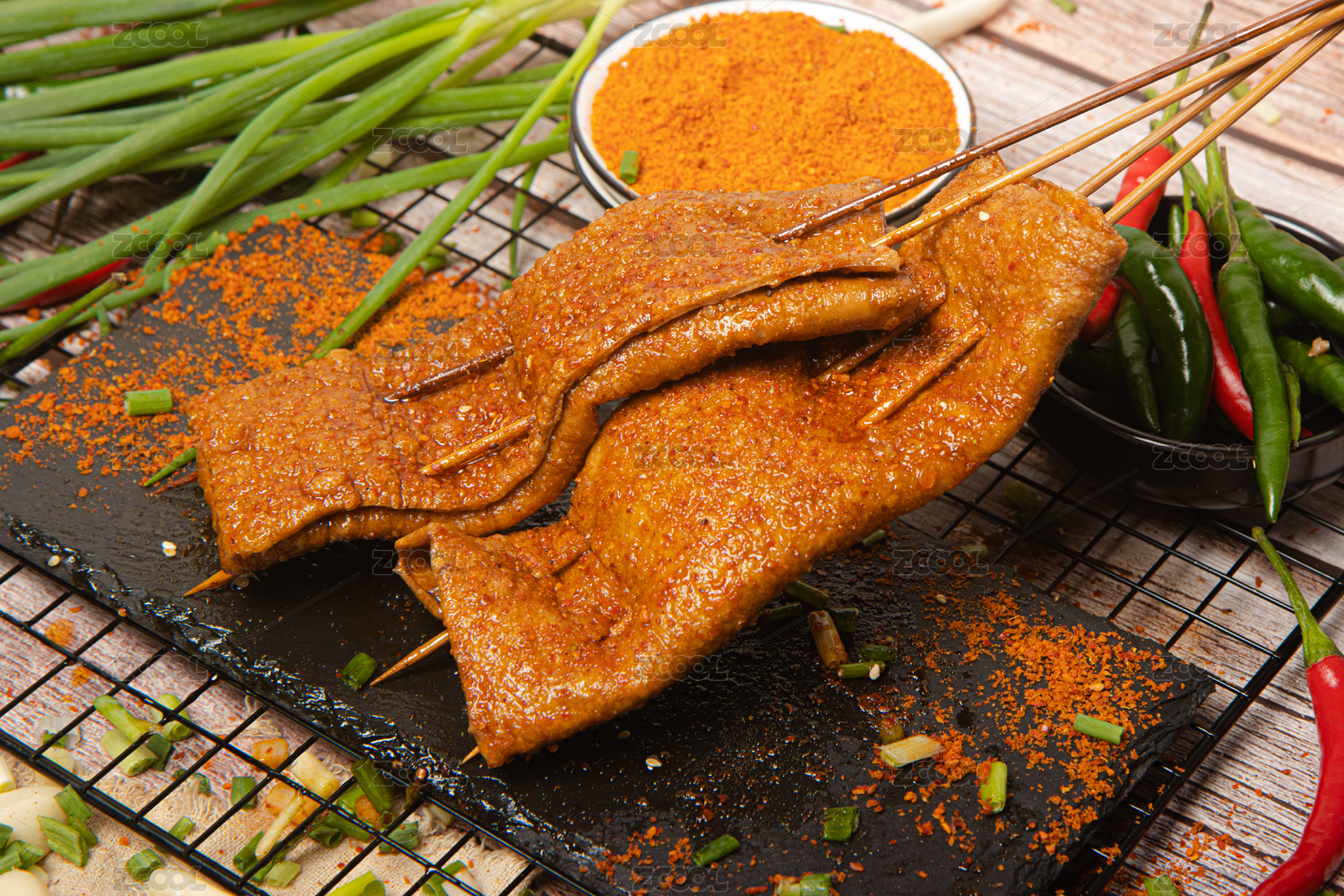 炭火燒烤架上正在烤著的小吃麻辣烤牛肉豆干