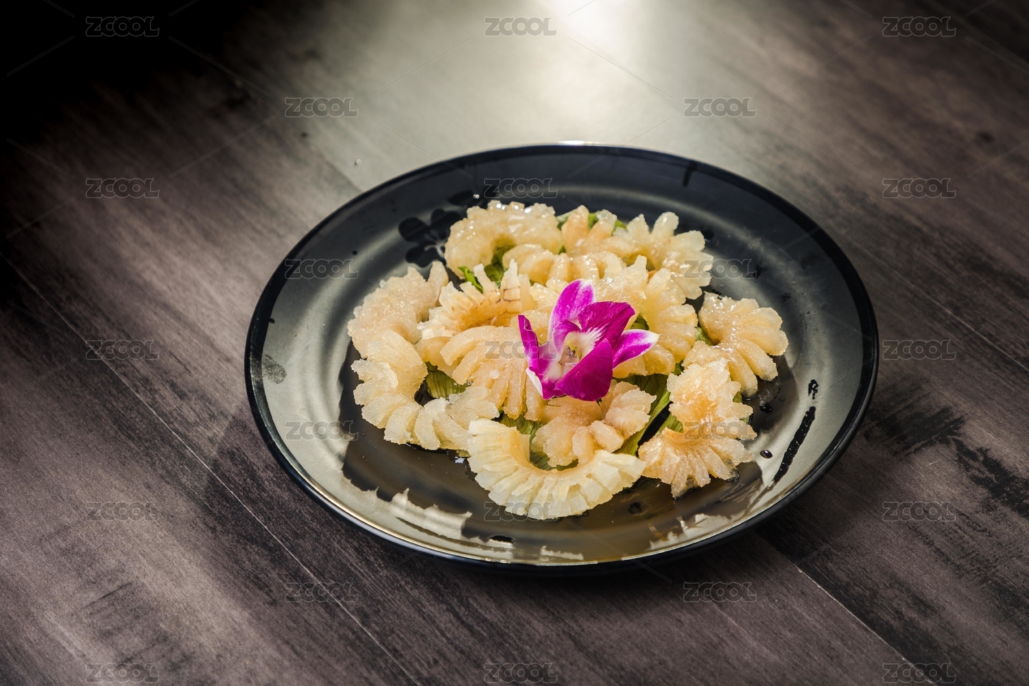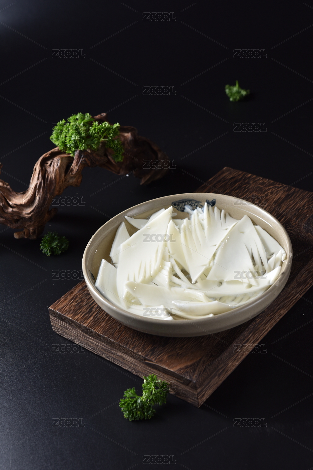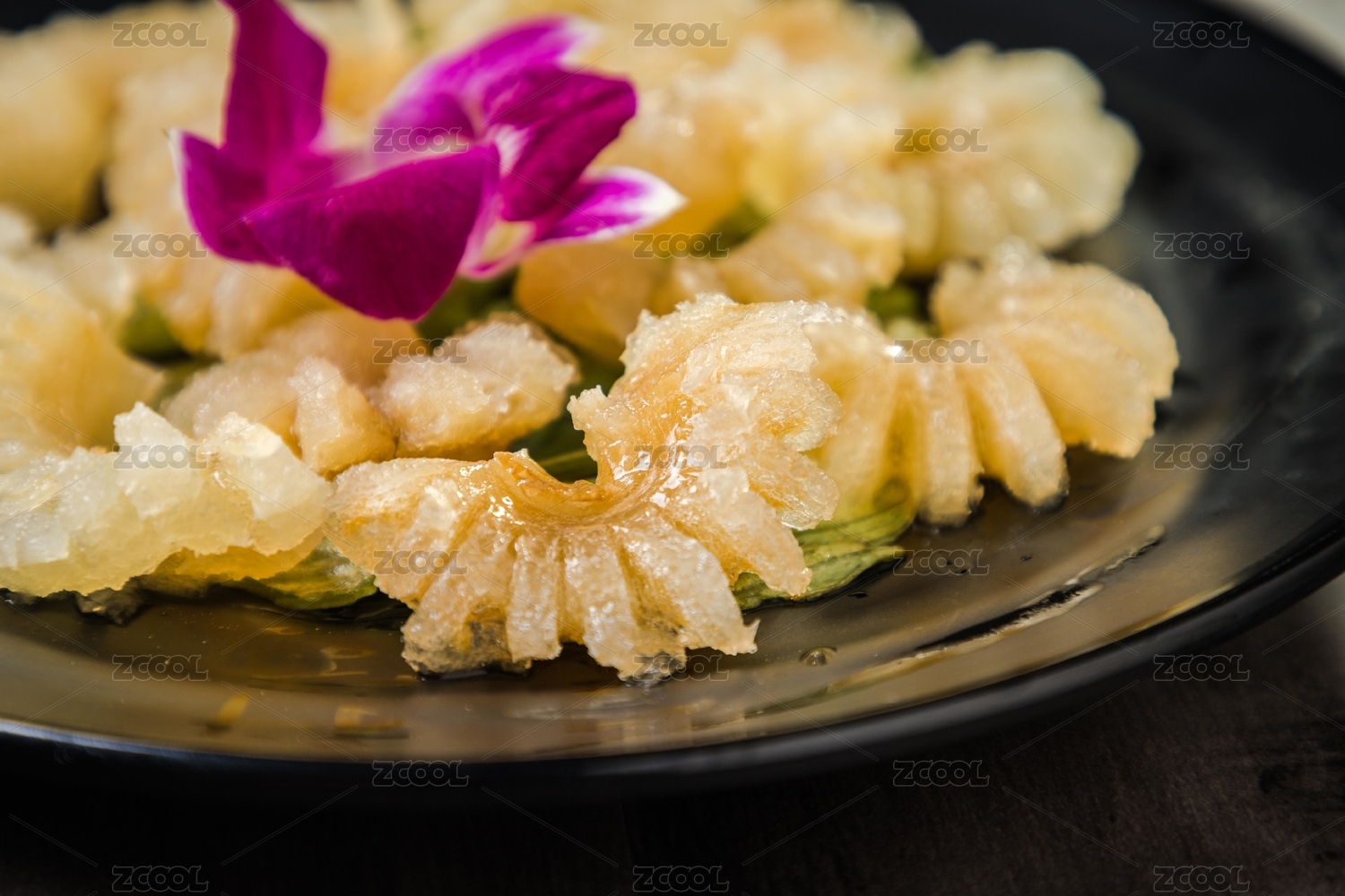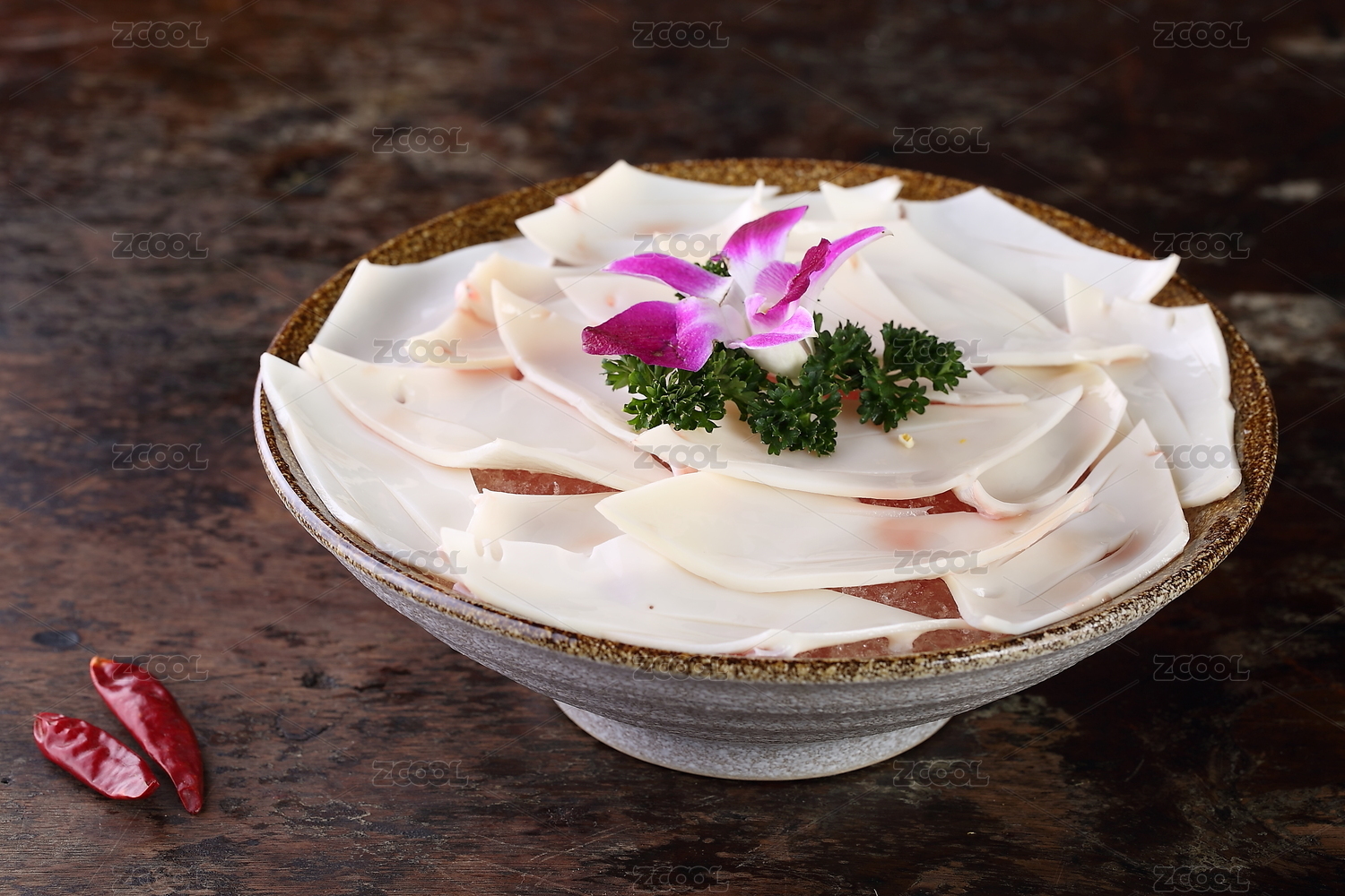 木桌上五邊形盤里的重慶火鍋菜品豬黃喉