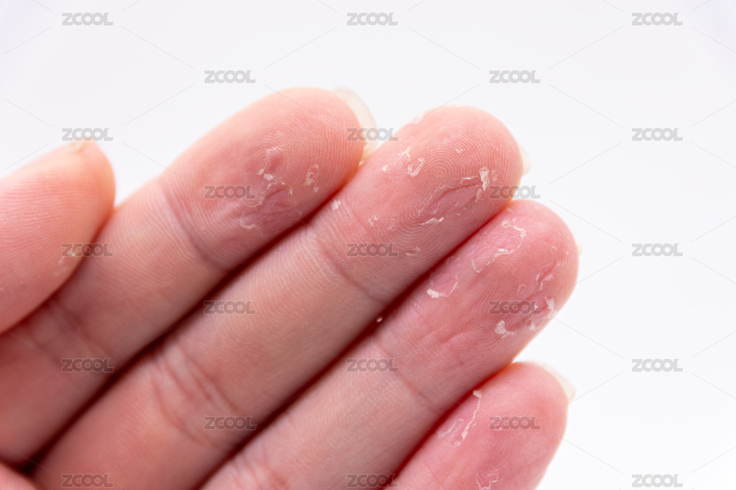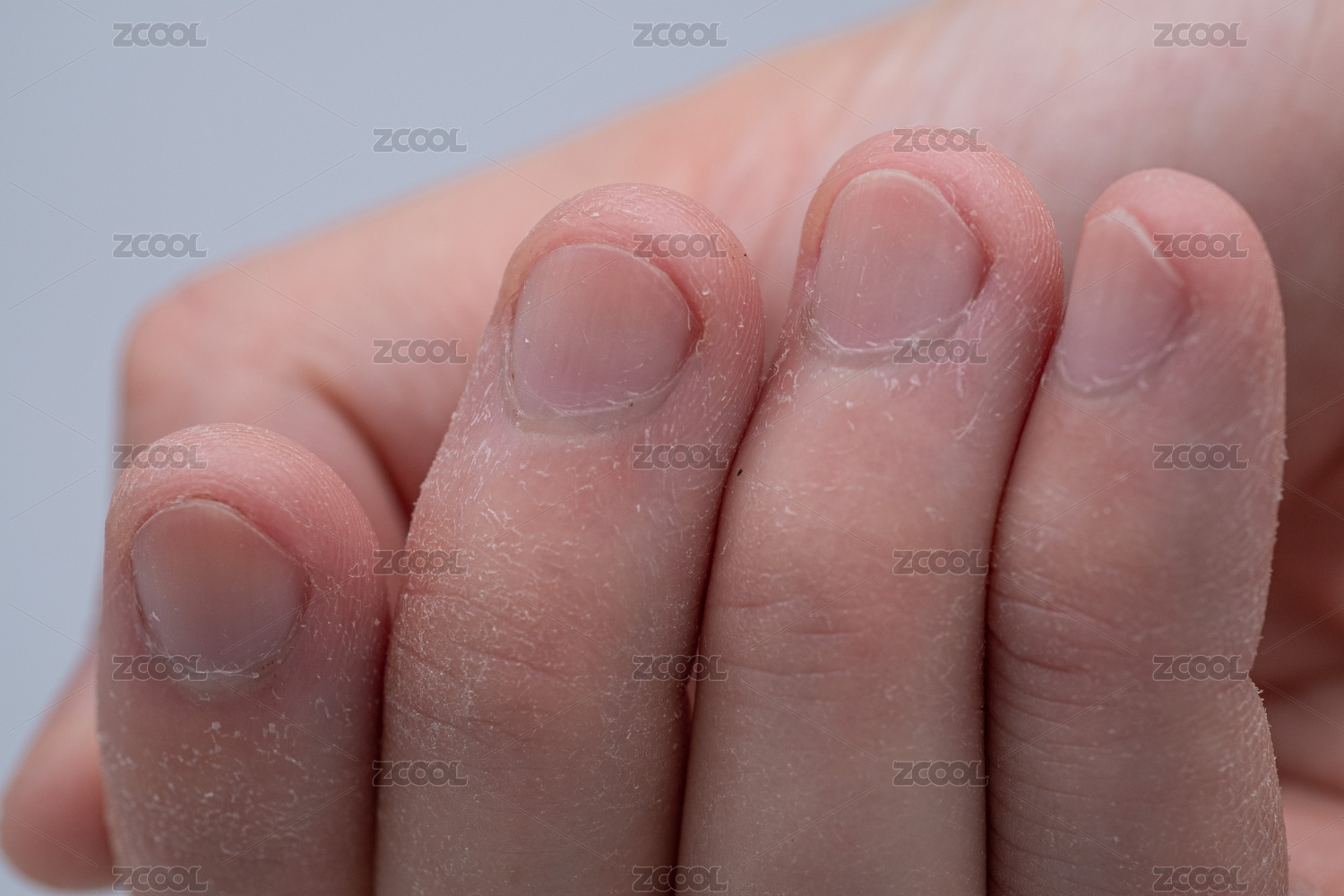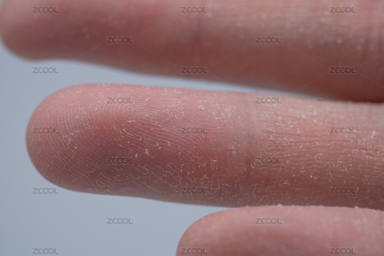 微距特寫手指出現(xiàn)汗皰疹之后蛻皮,角質(zhì)層脫