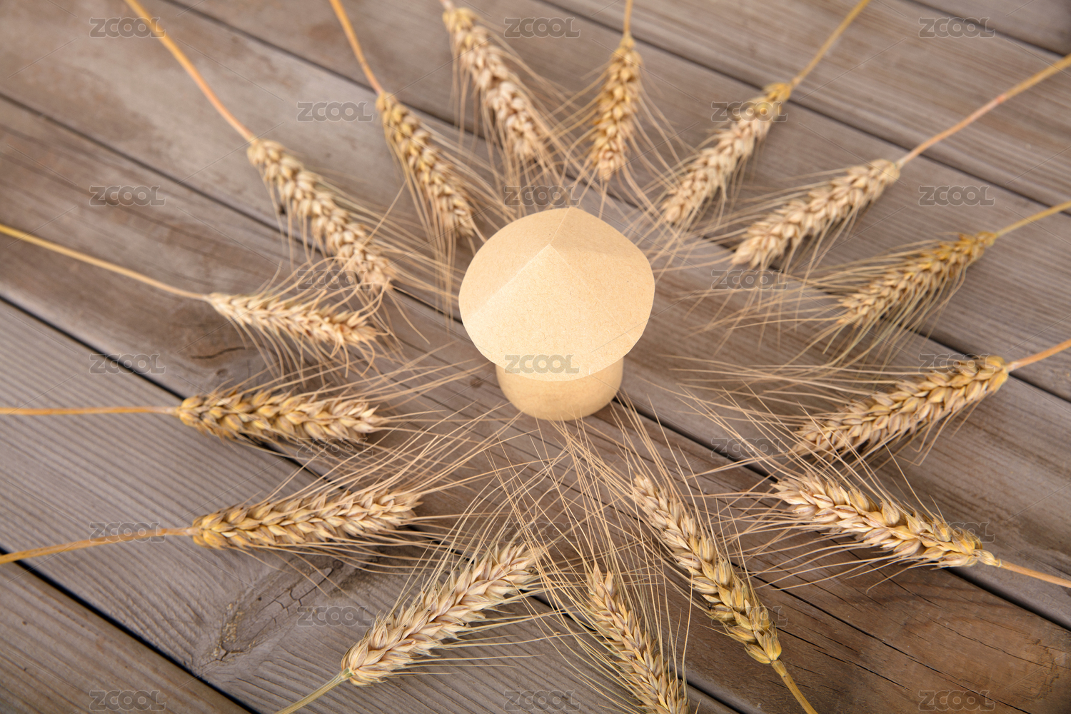 木板背景上金黃色的麥穗擺成一個(gè)圓圈和圓圈中一個(gè)紙糊的糧倉模型