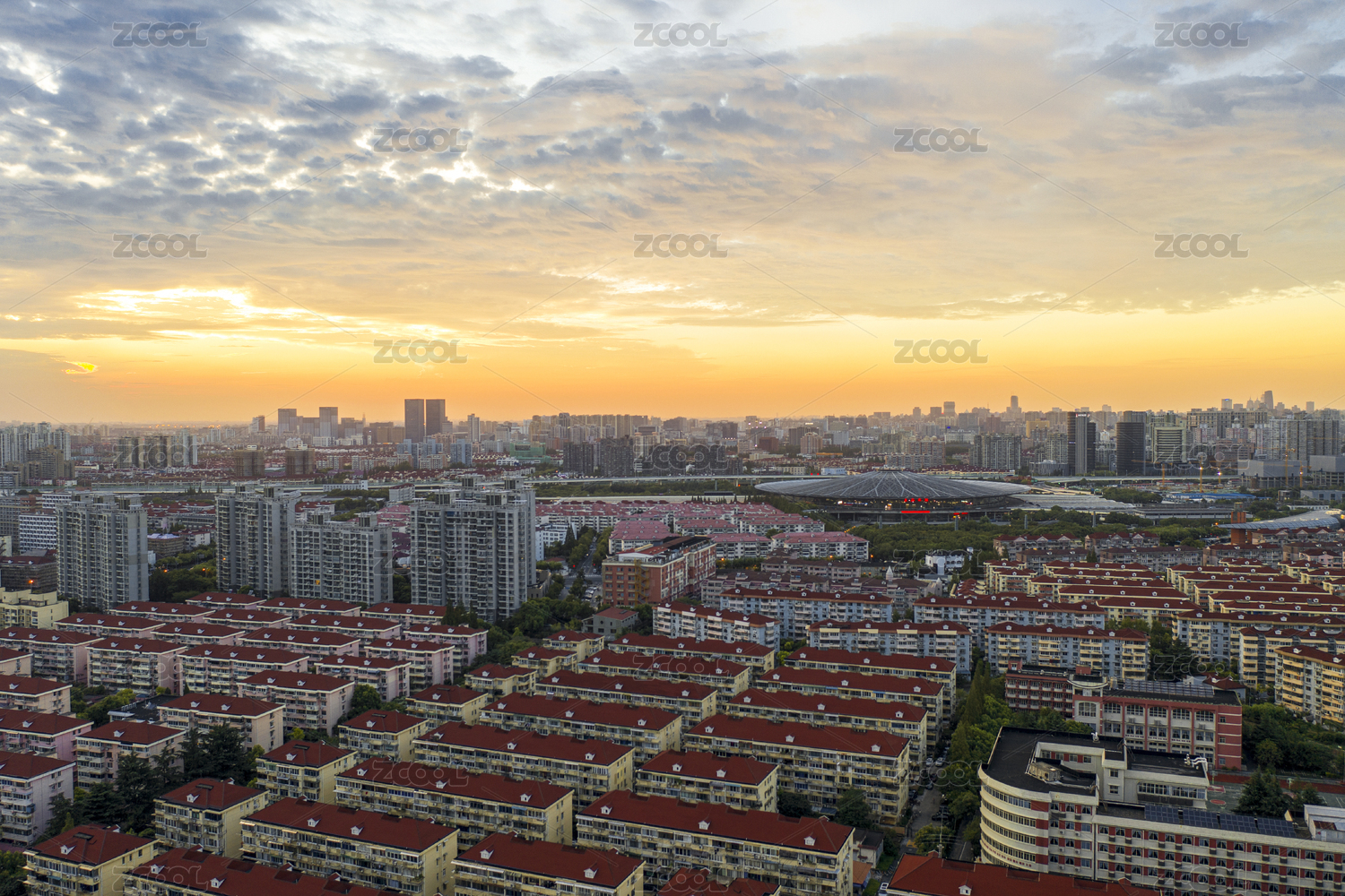晚霞下的中國(guó)上海火車南站和周邊住宅區(qū)