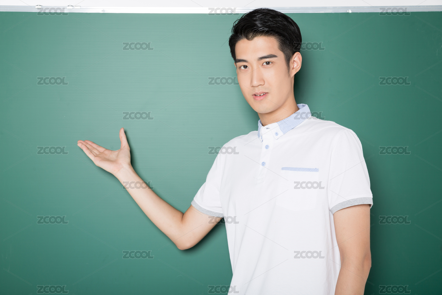 影棚拍攝黑板前的年輕男教師、培訓師、學生