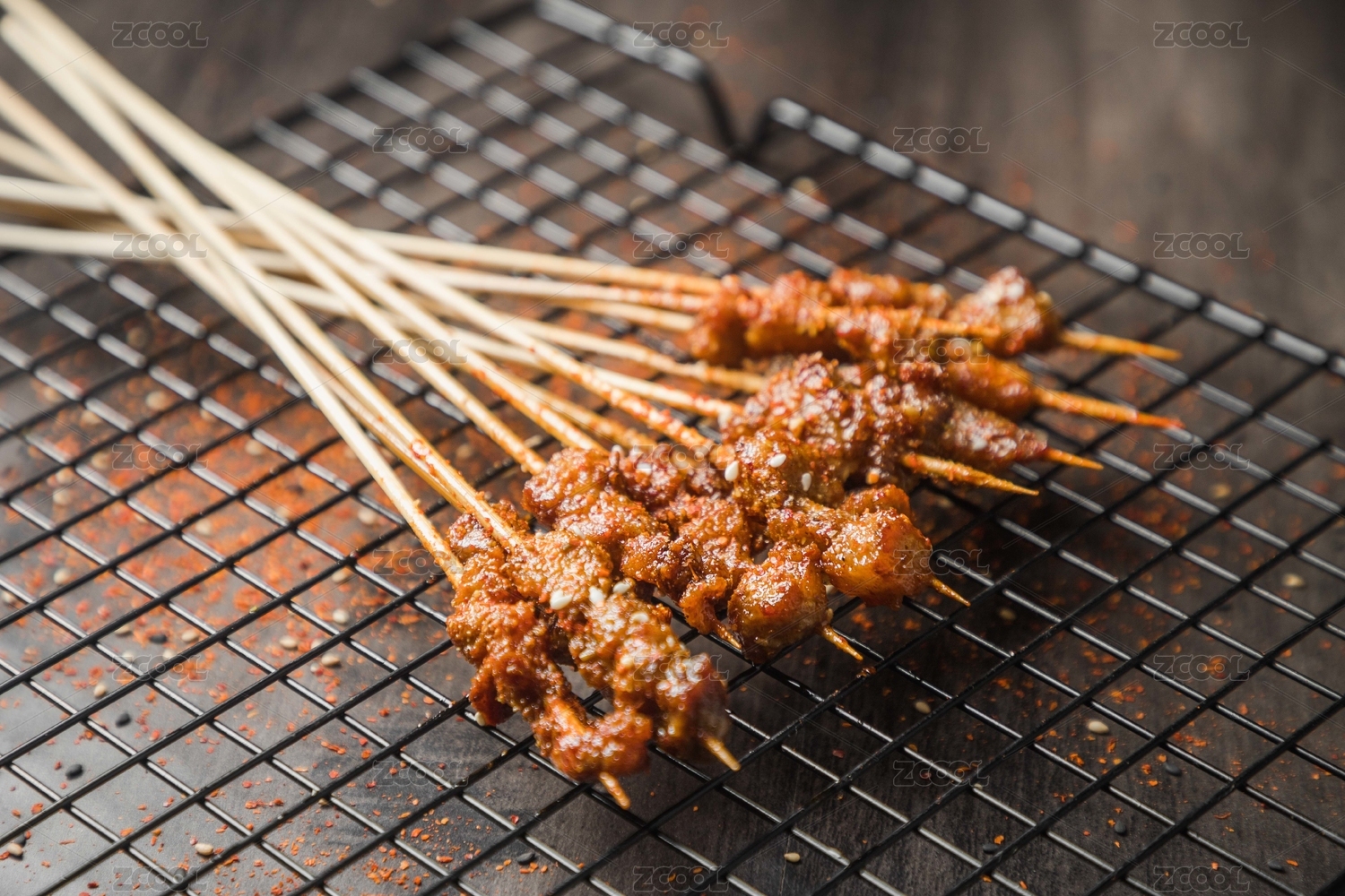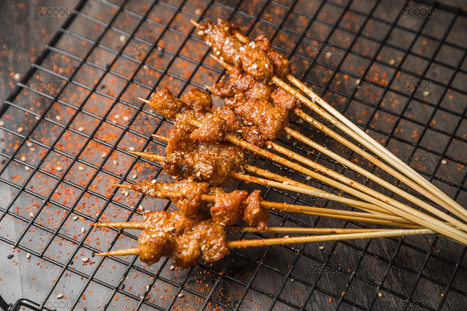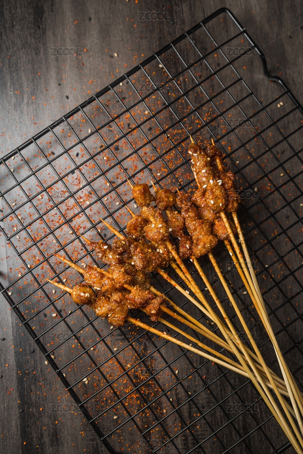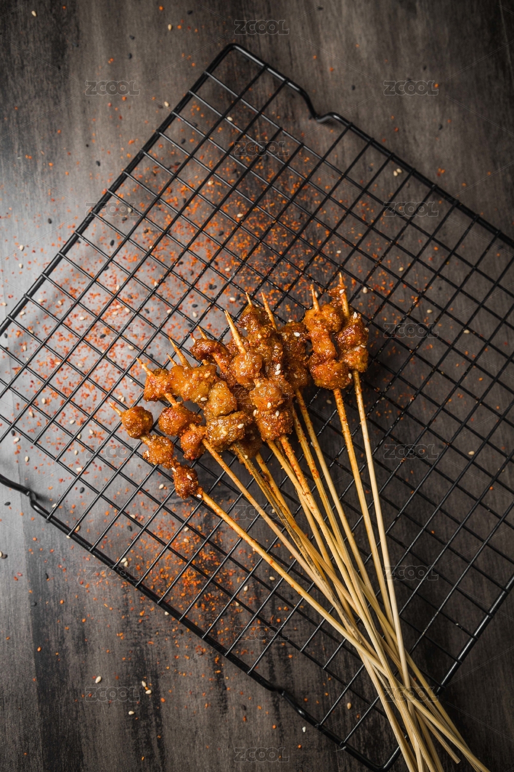 黑色烤架上放著幾串撒著辣椒面的油炸肉筋
