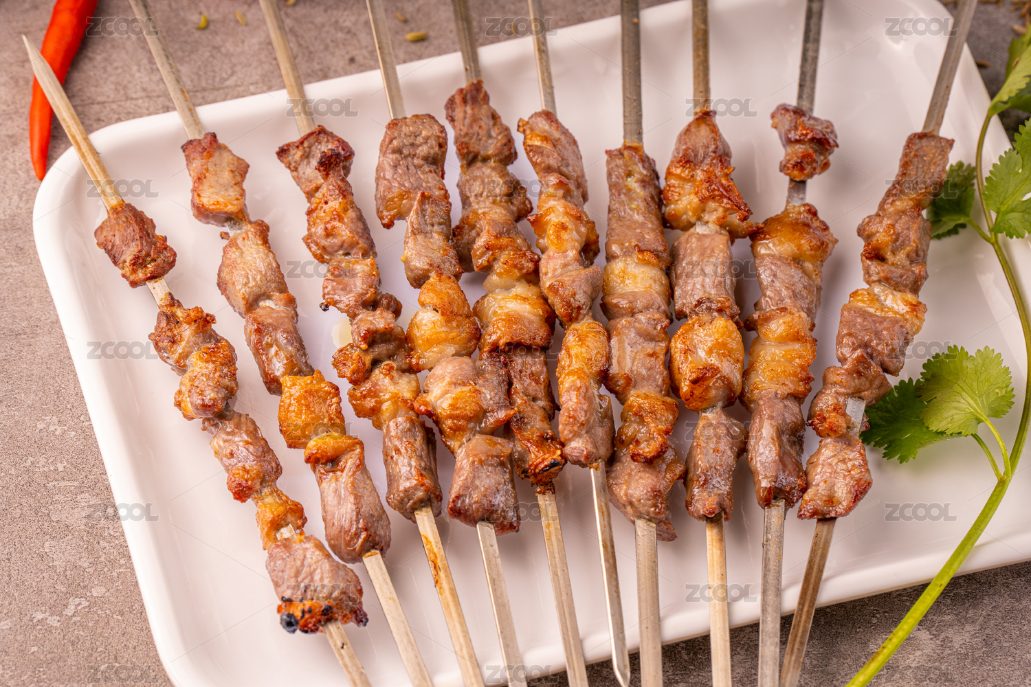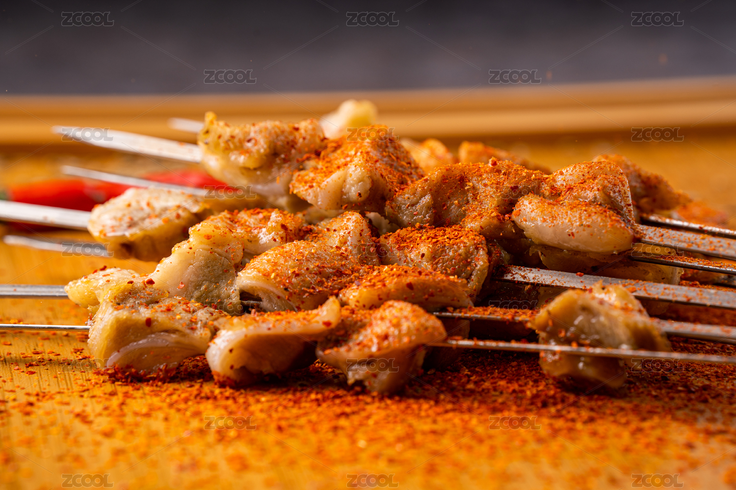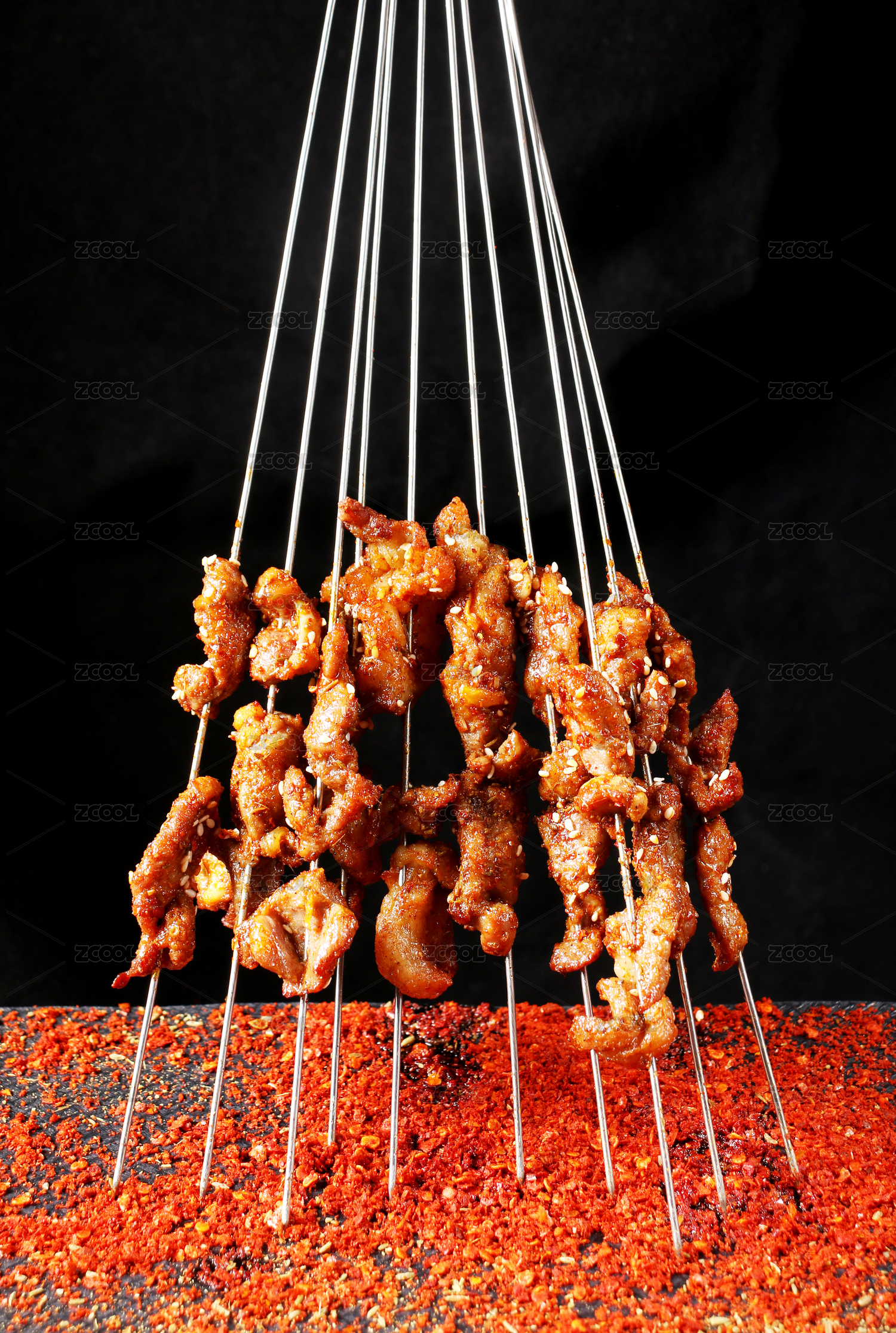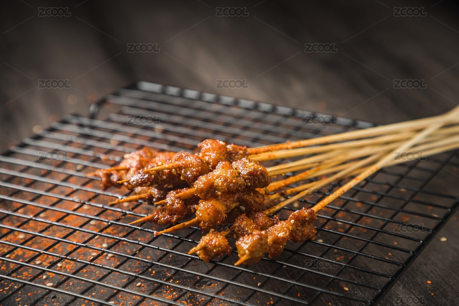 黑色烤架上放著幾串撒著辣椒面的油炸肉筋