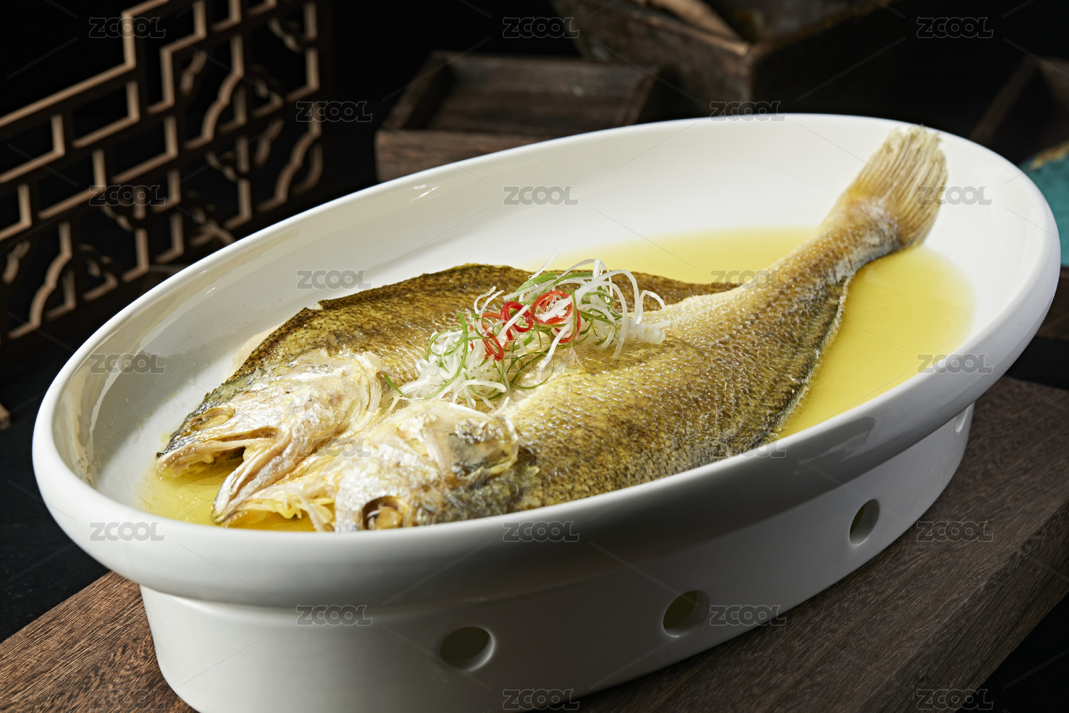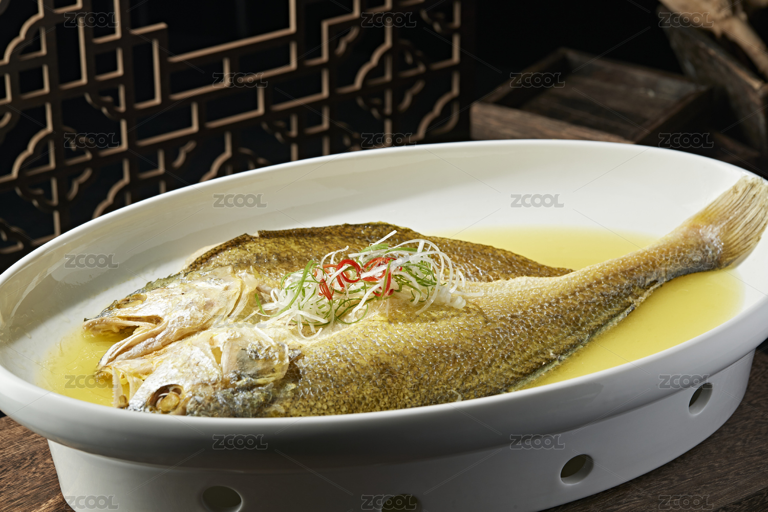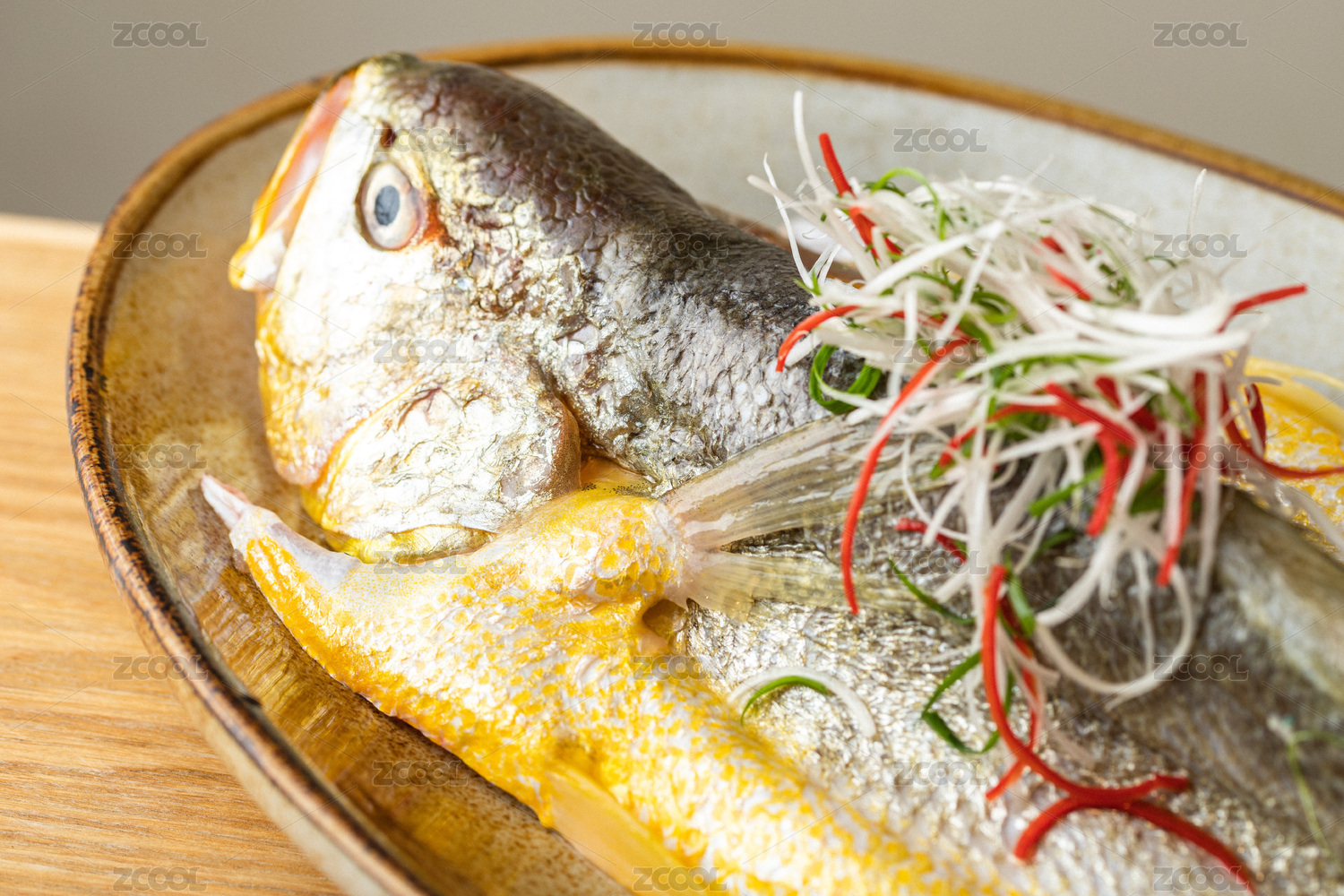木紋桌面上有一盤清蒸大黃魚
