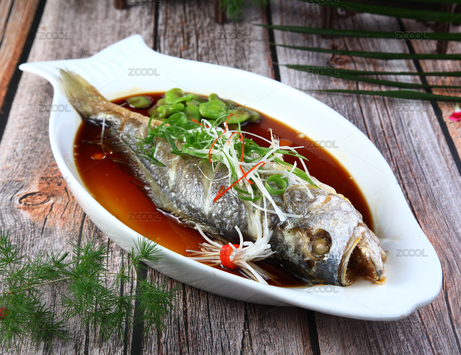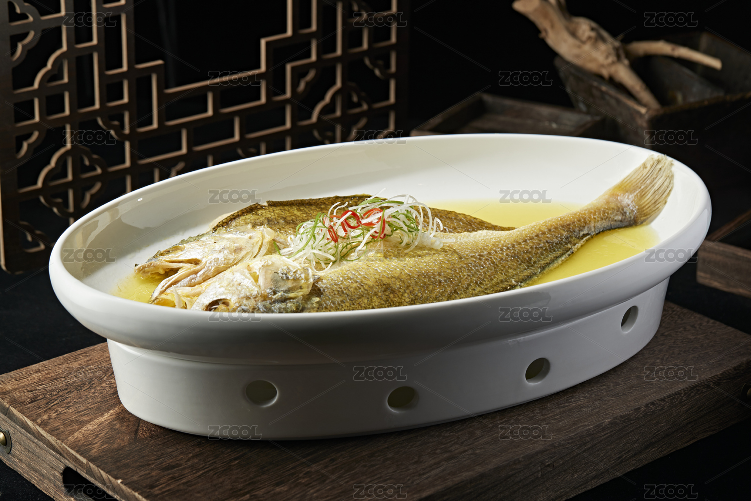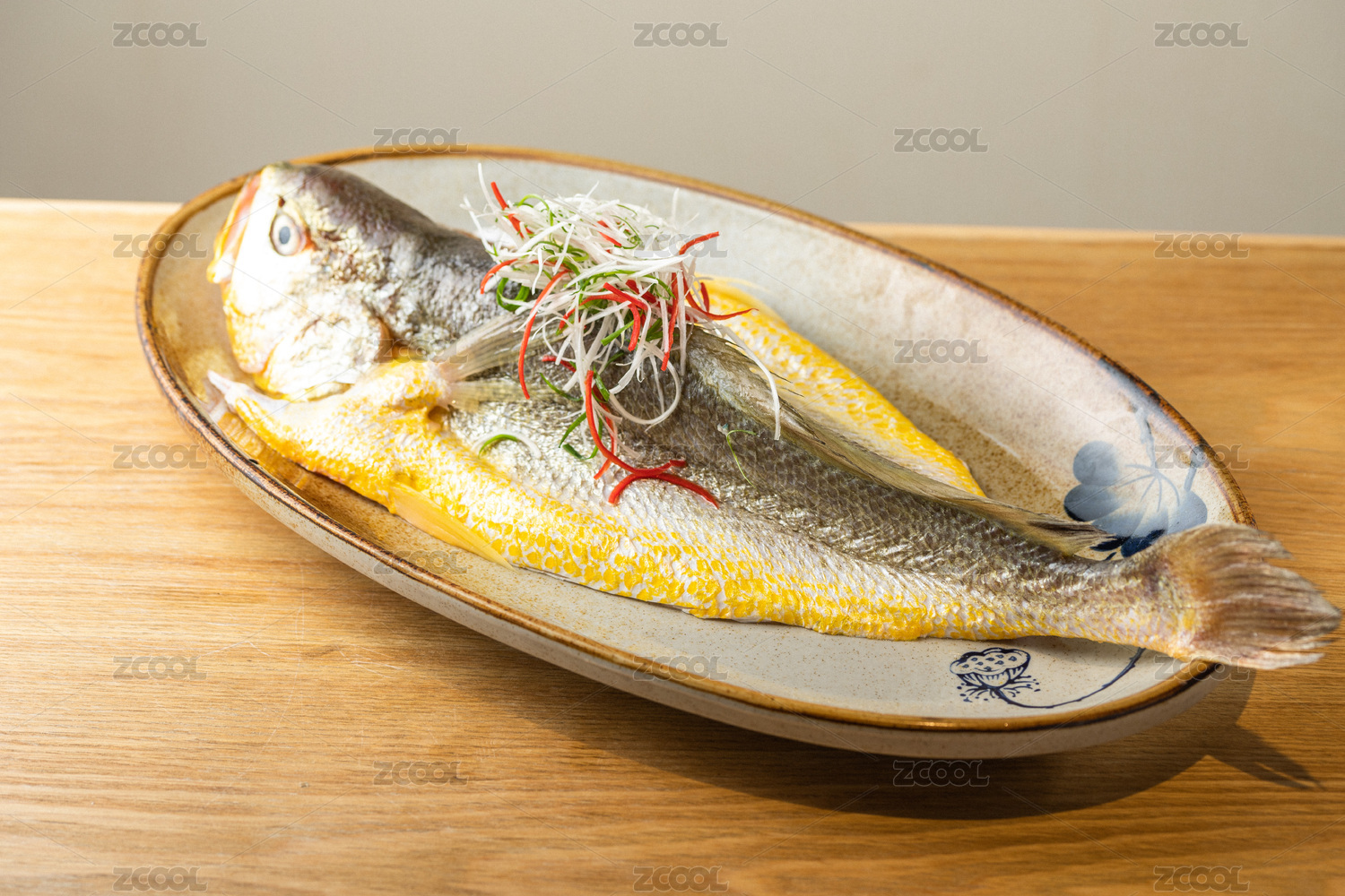 木紋桌面上有一盤清蒸大黃魚