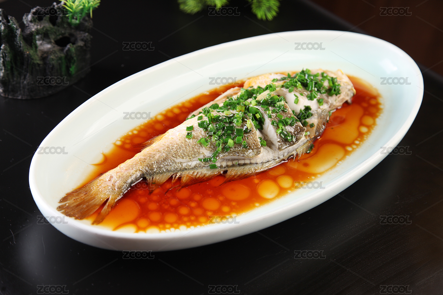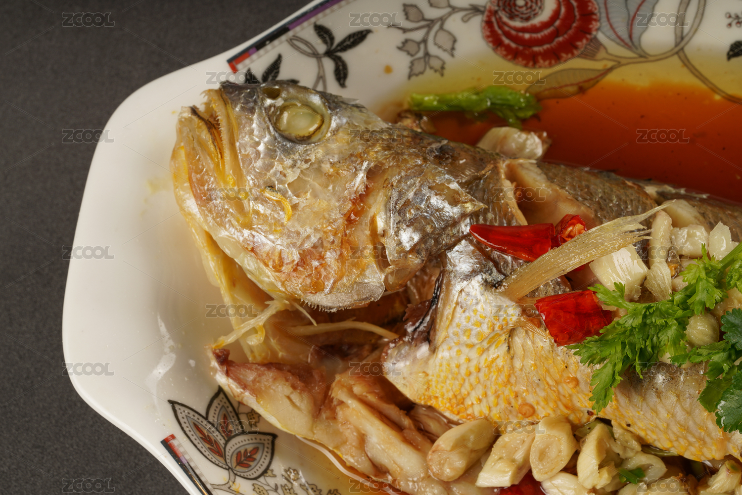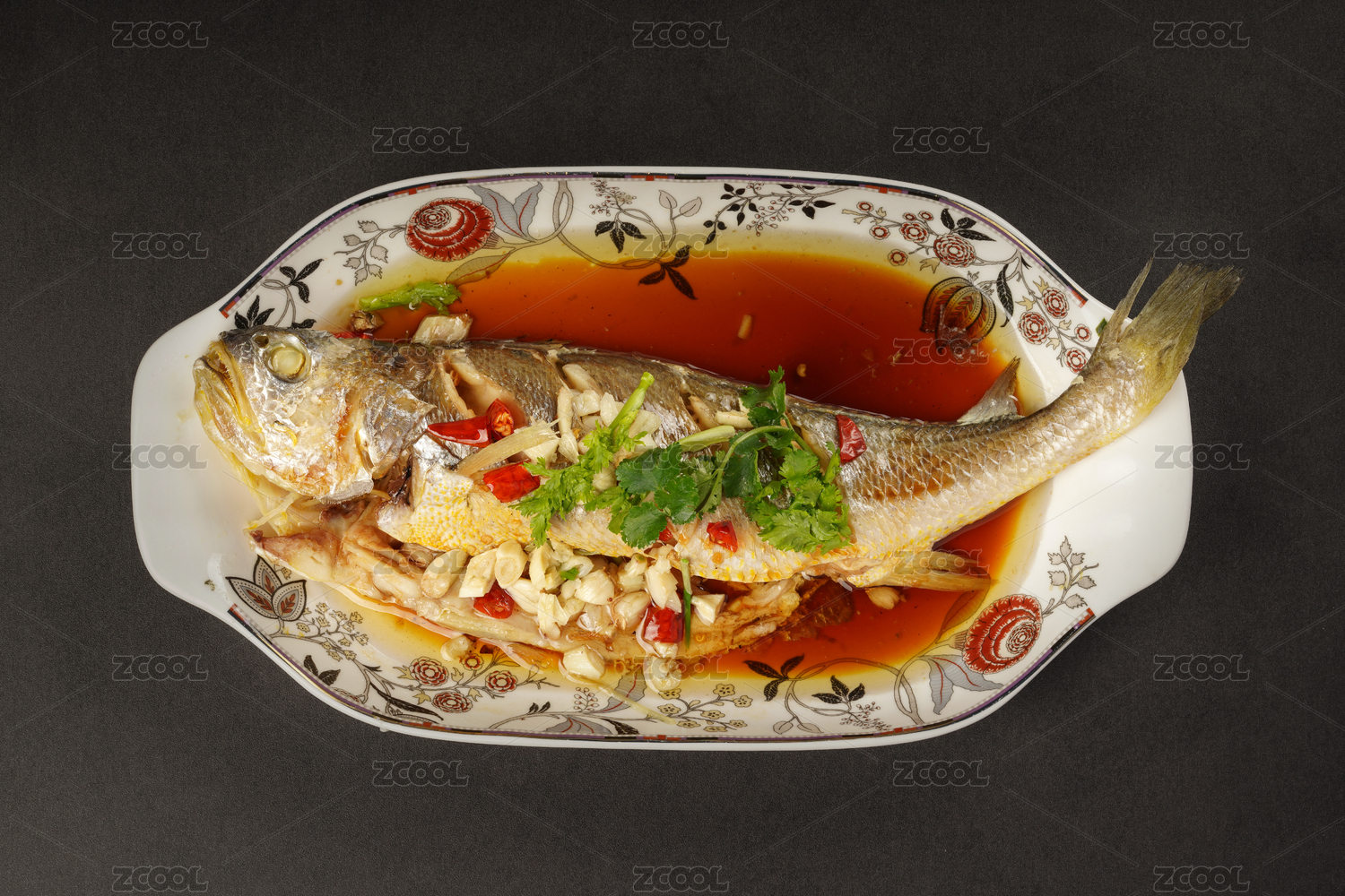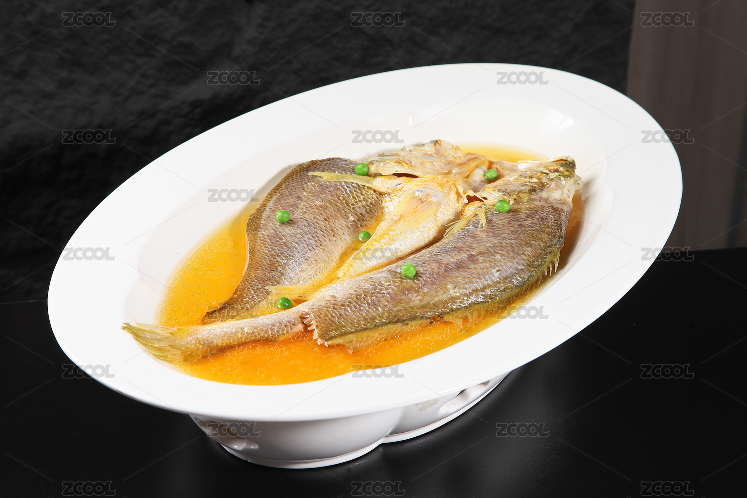 黑色背景上的清蒸大黃魚特寫