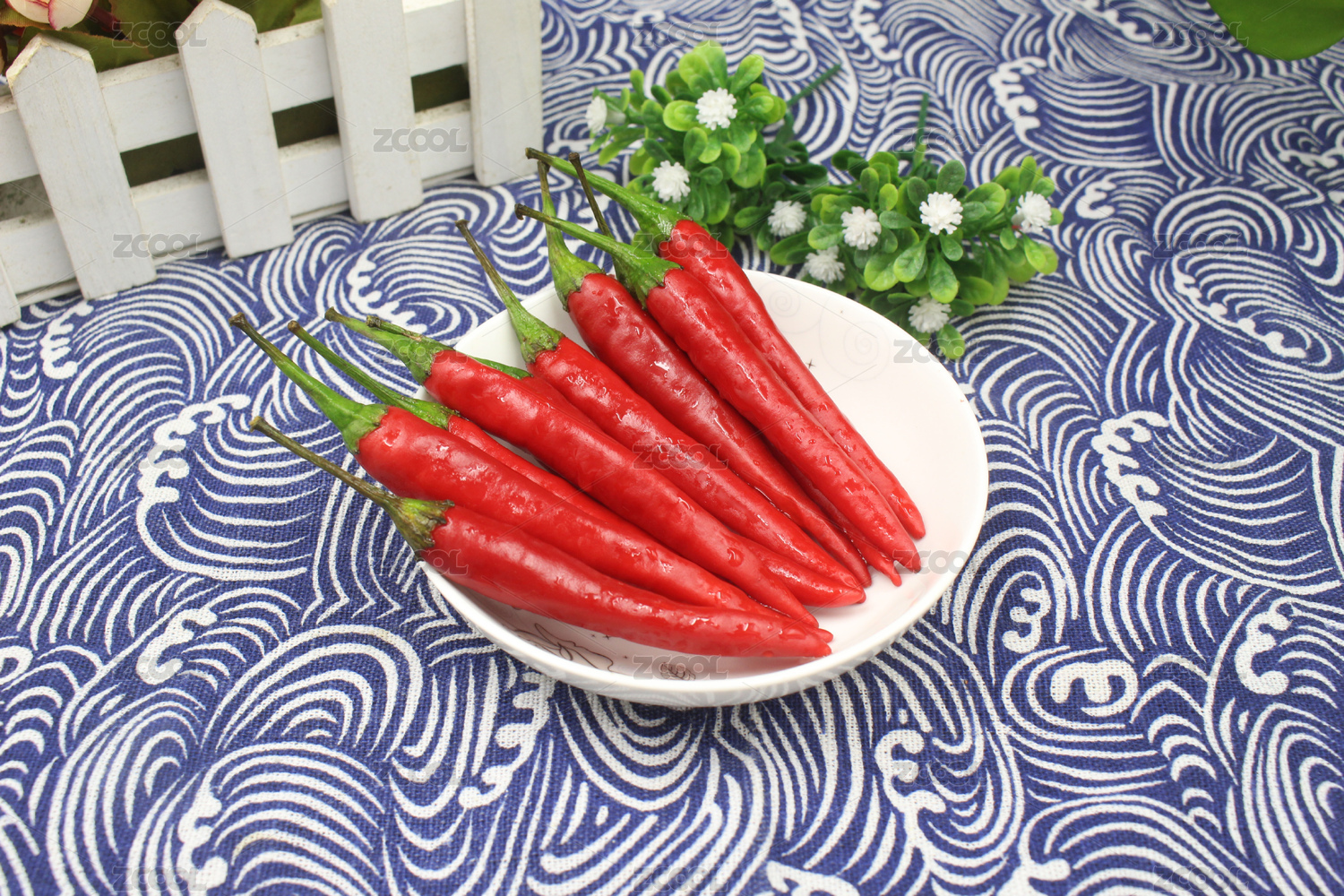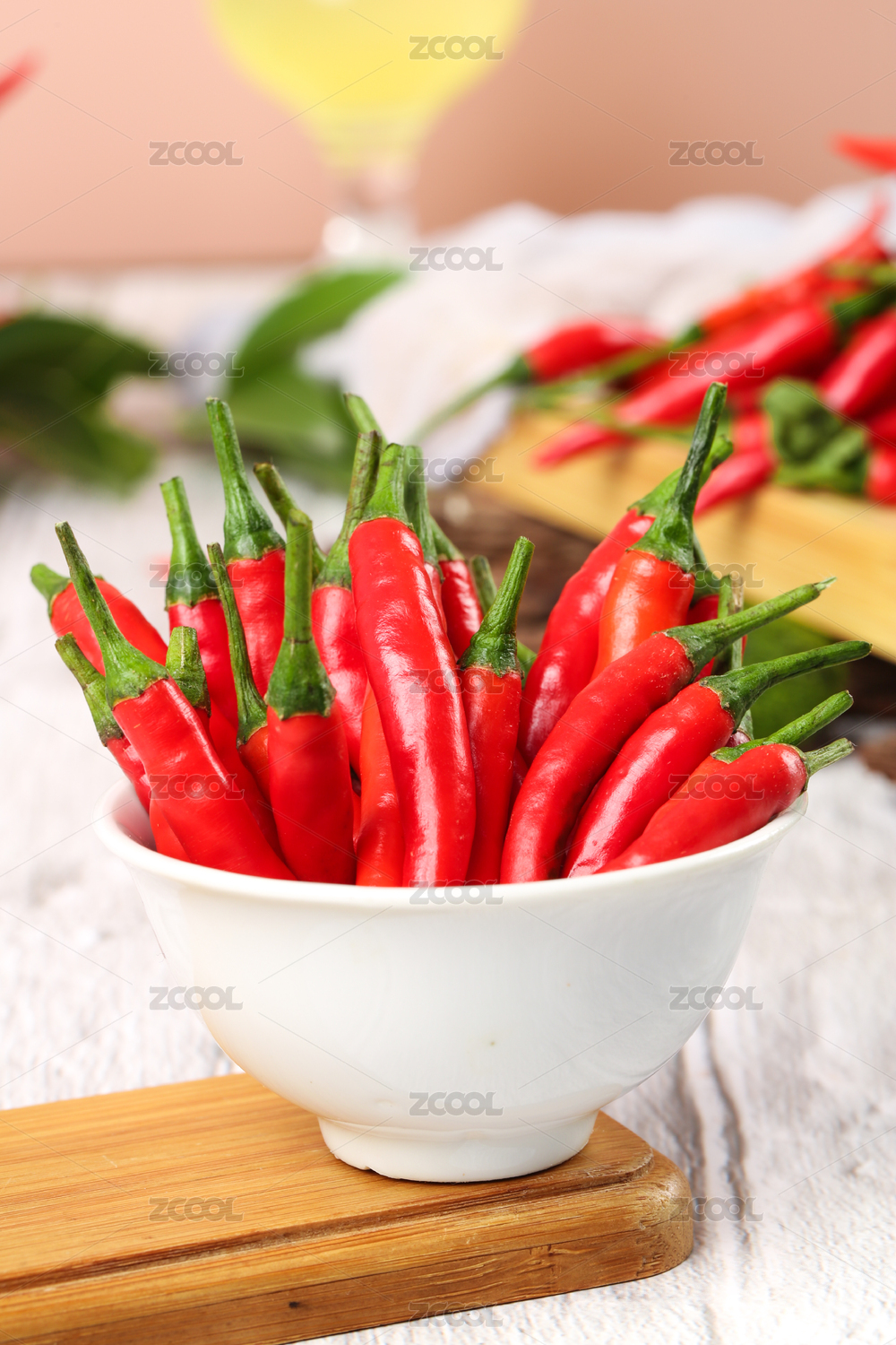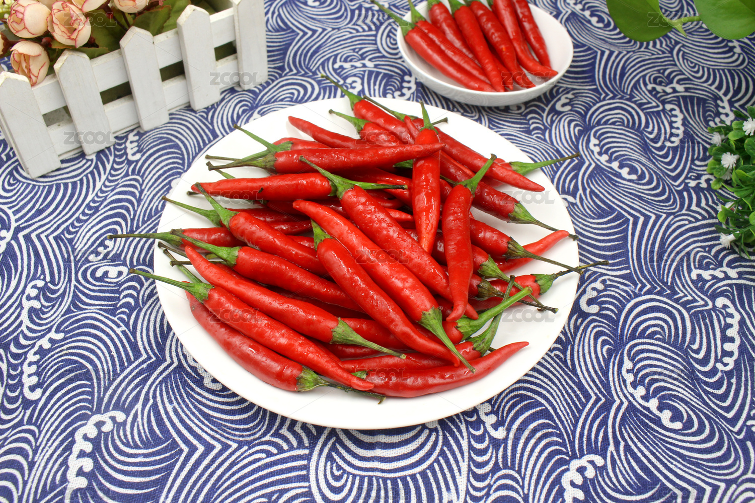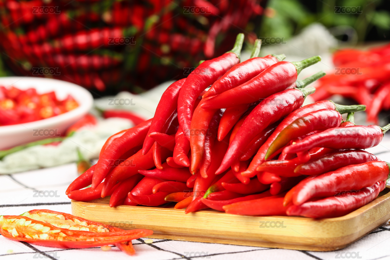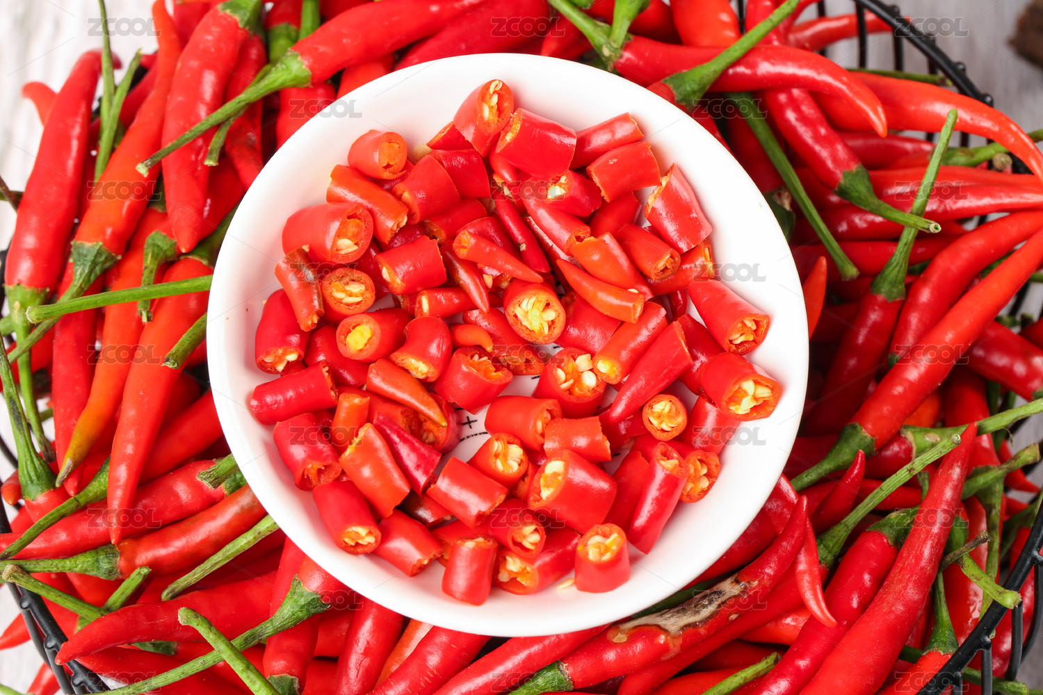 一堆新鮮小米椒和一盤切丁的紅辣椒