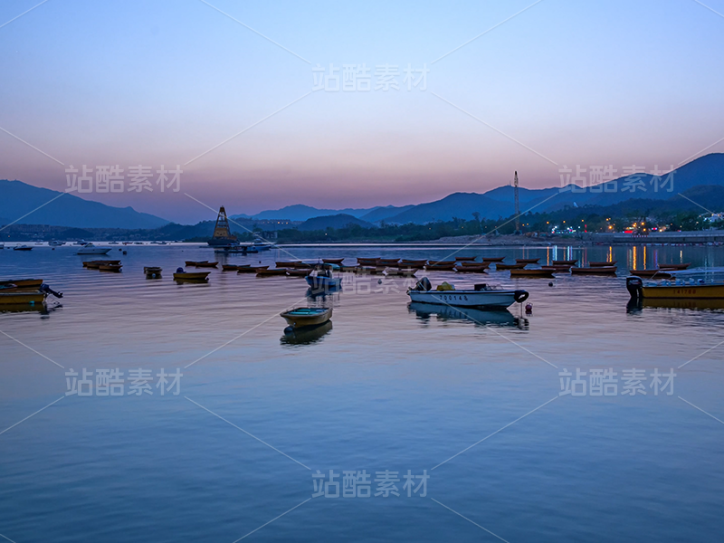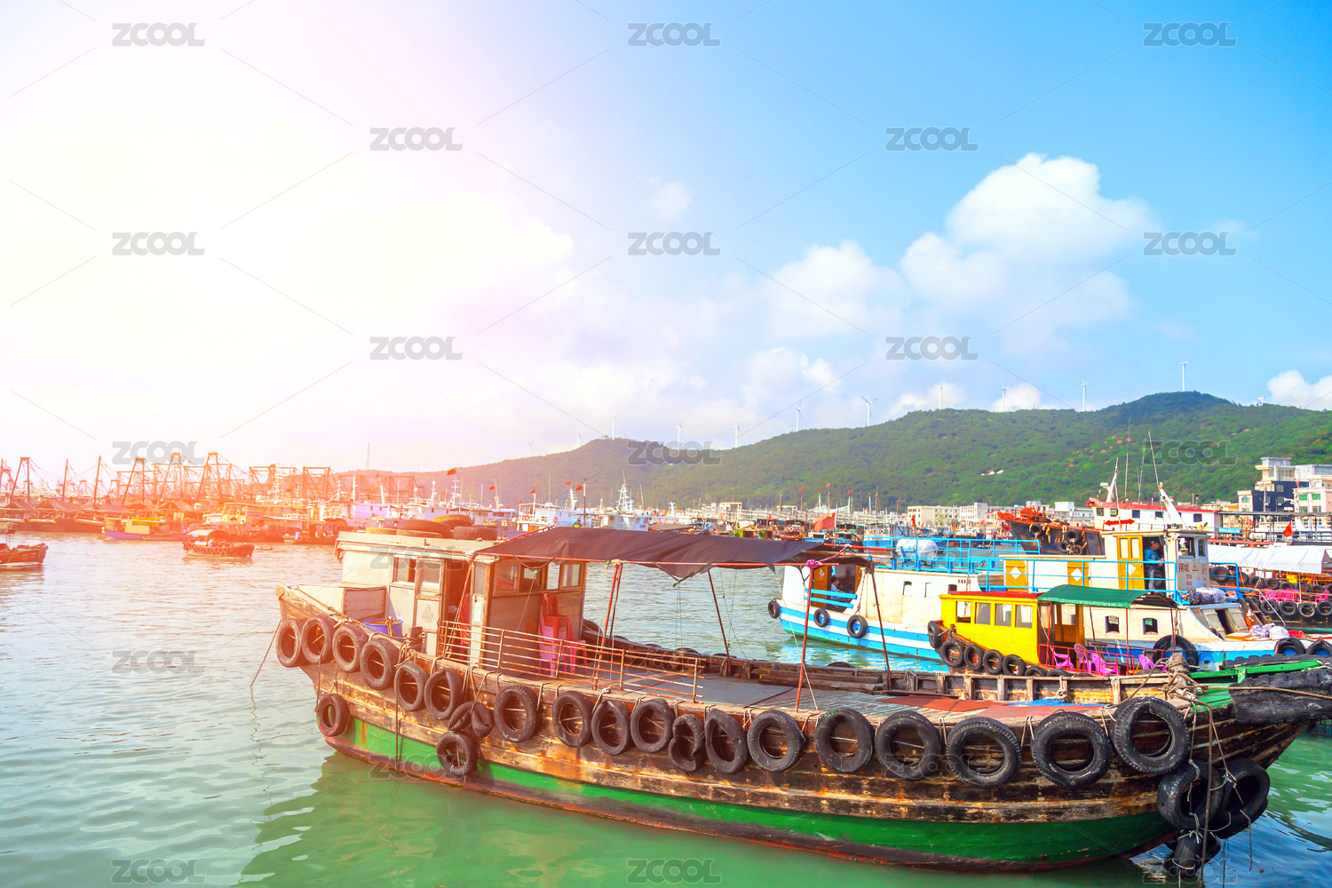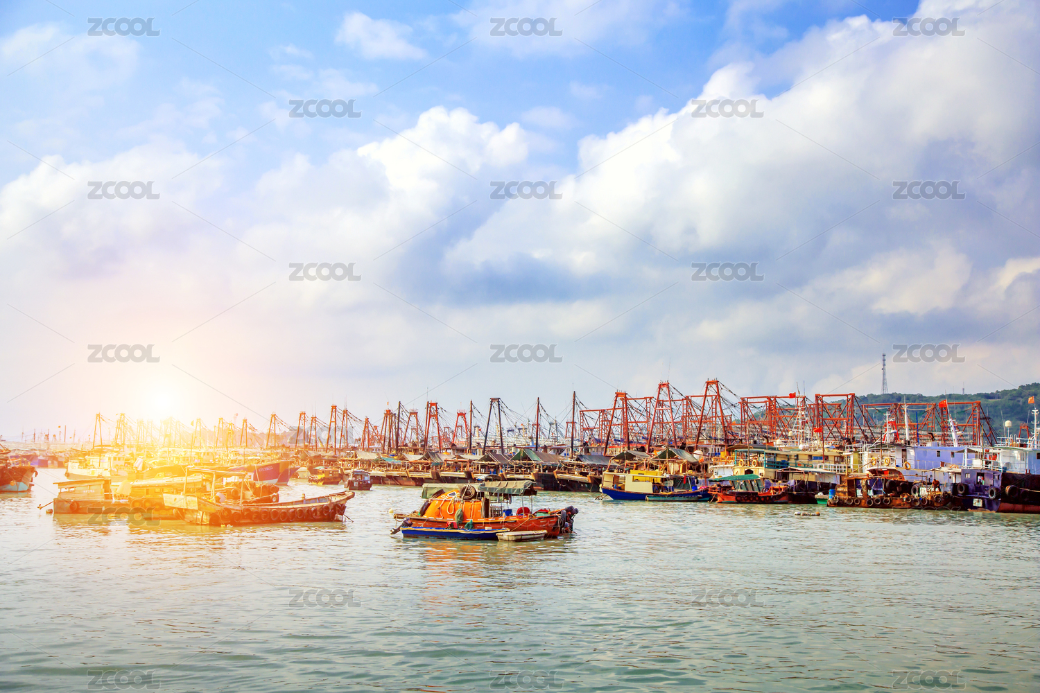 香港大埔大美督海港碼頭漁船與黃昏余暉