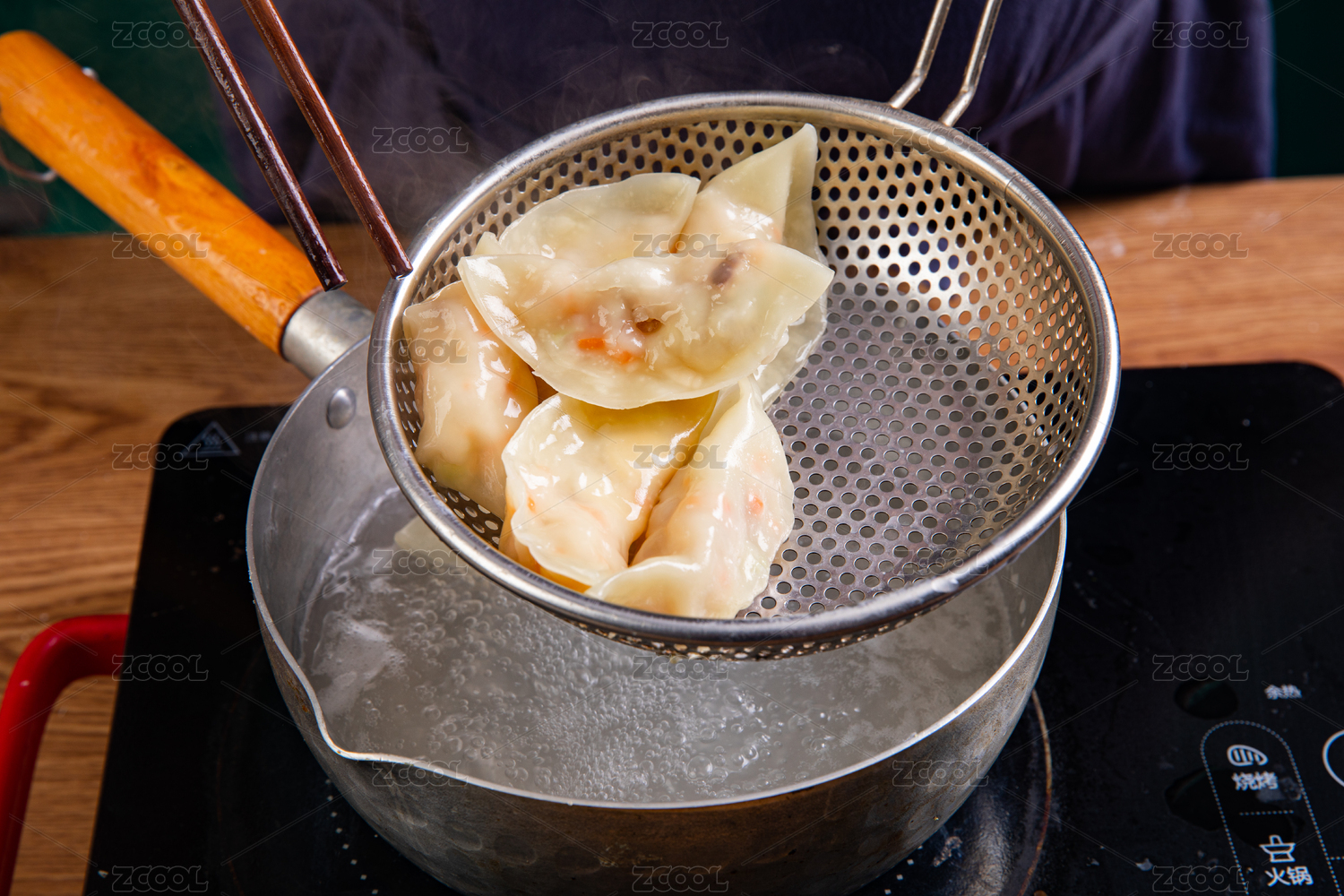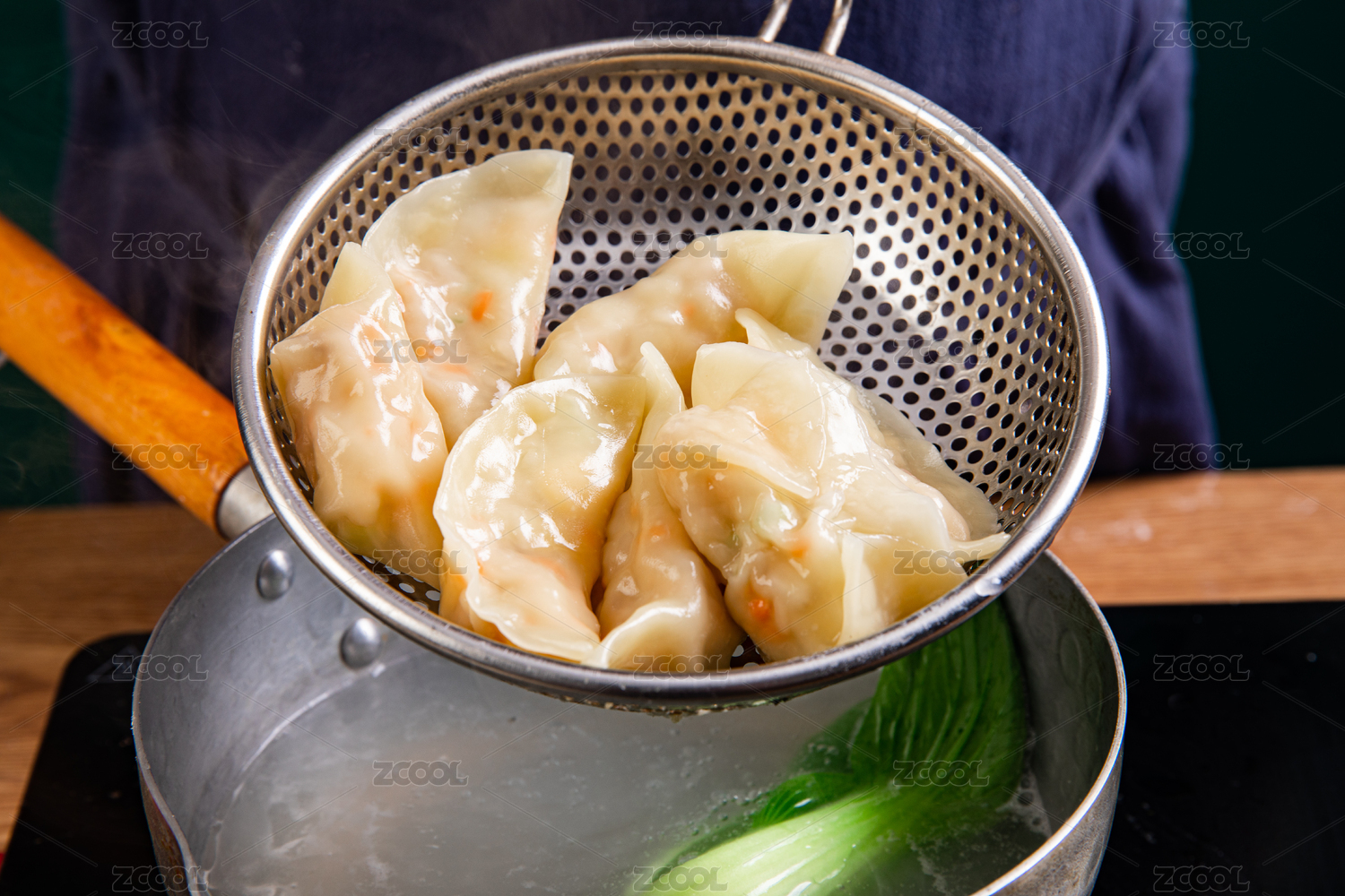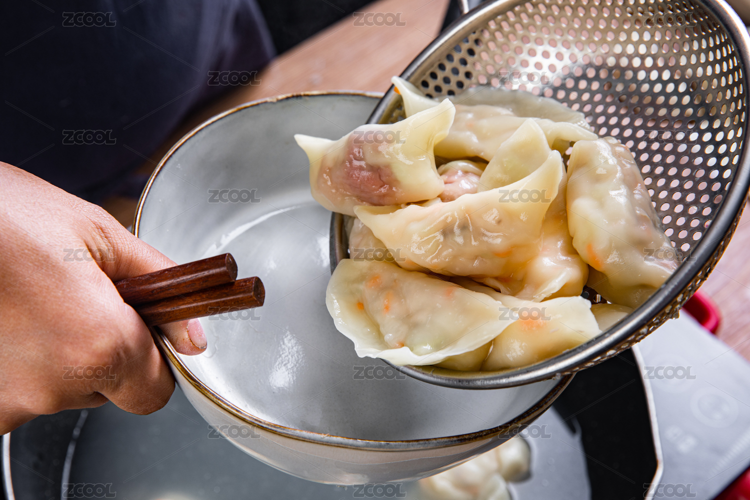 煮熟的水餃用漏勺剛撈起的動作