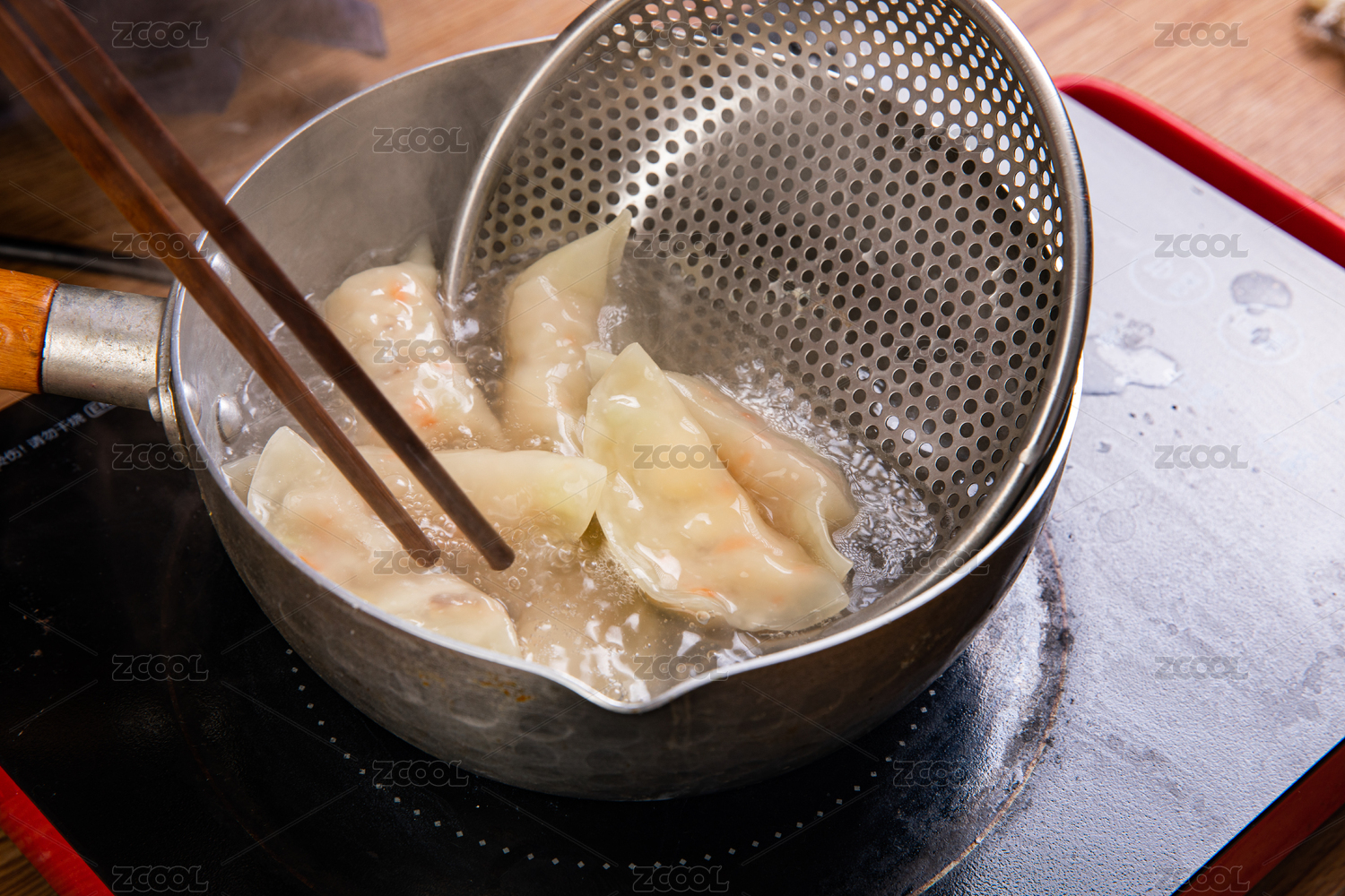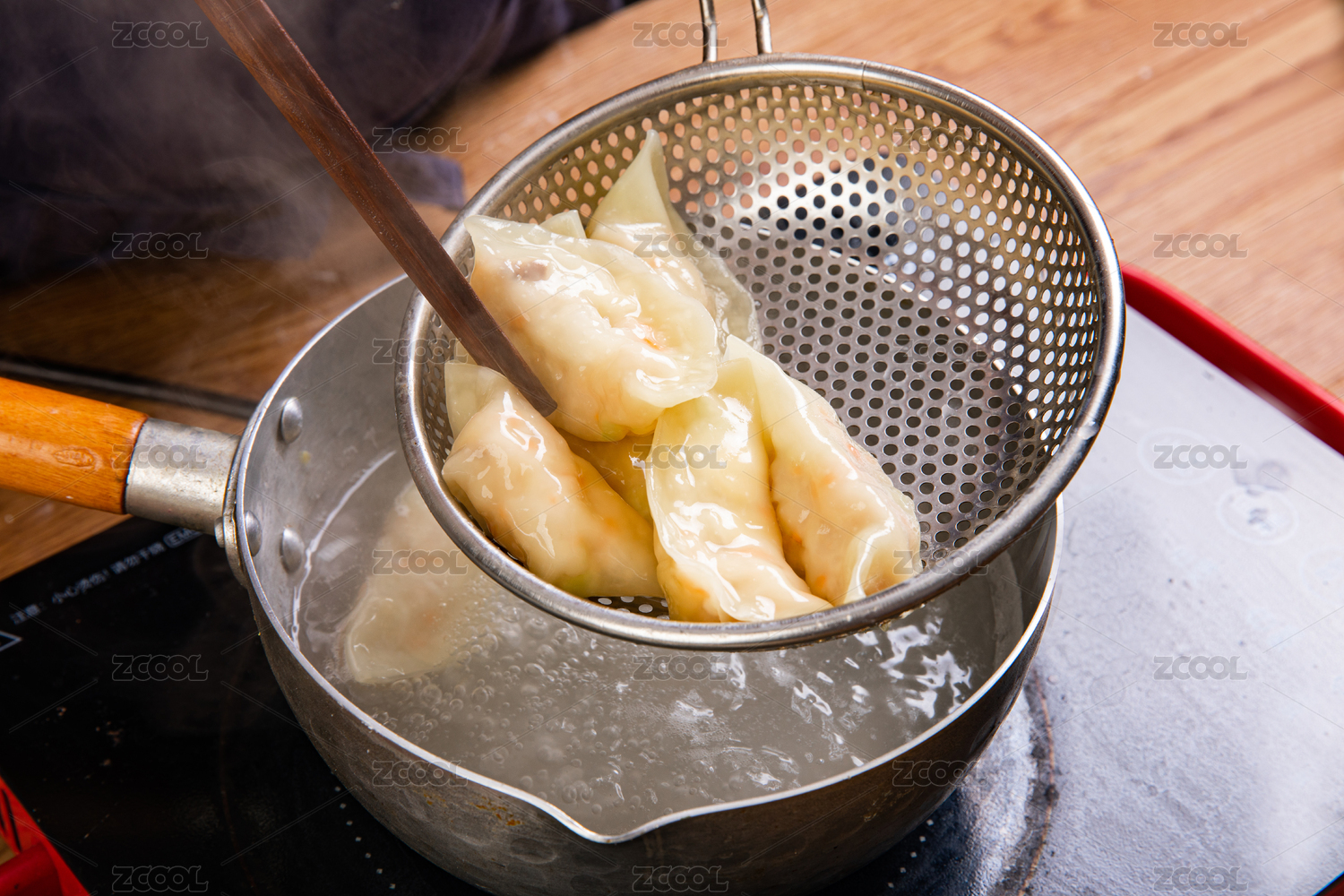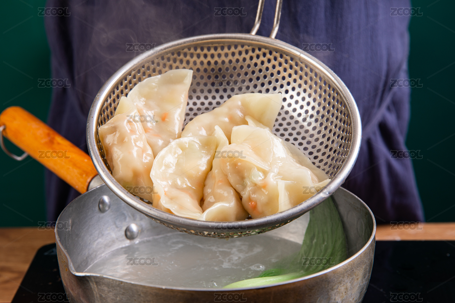 煮熟的水餃用漏勺剛撈起的動作