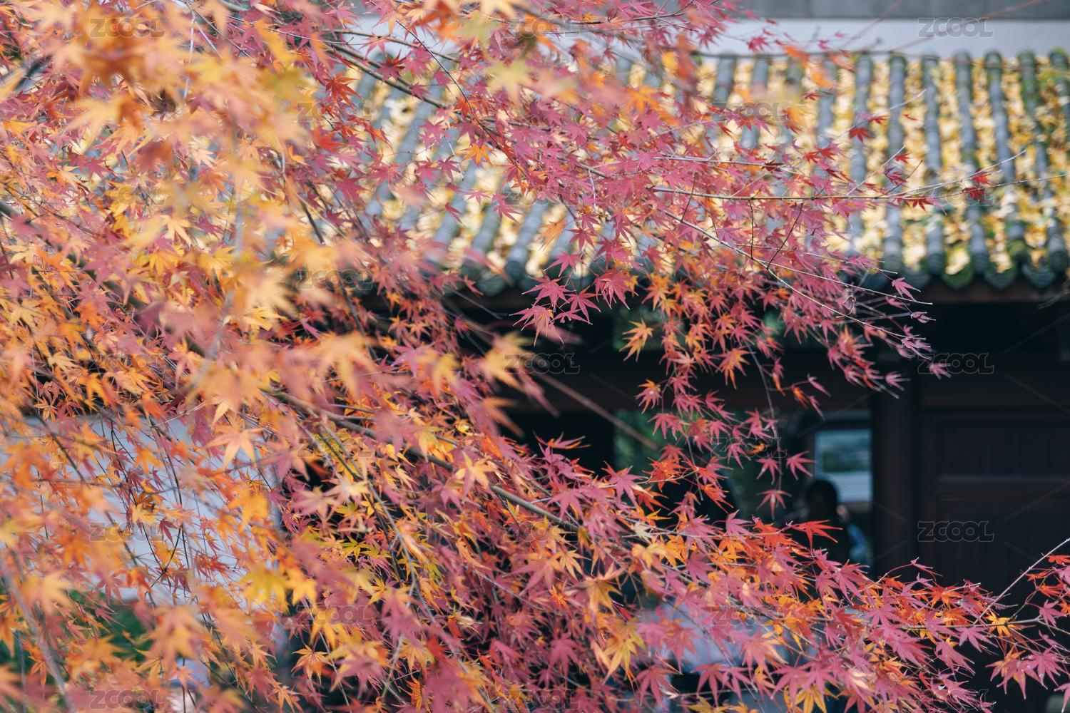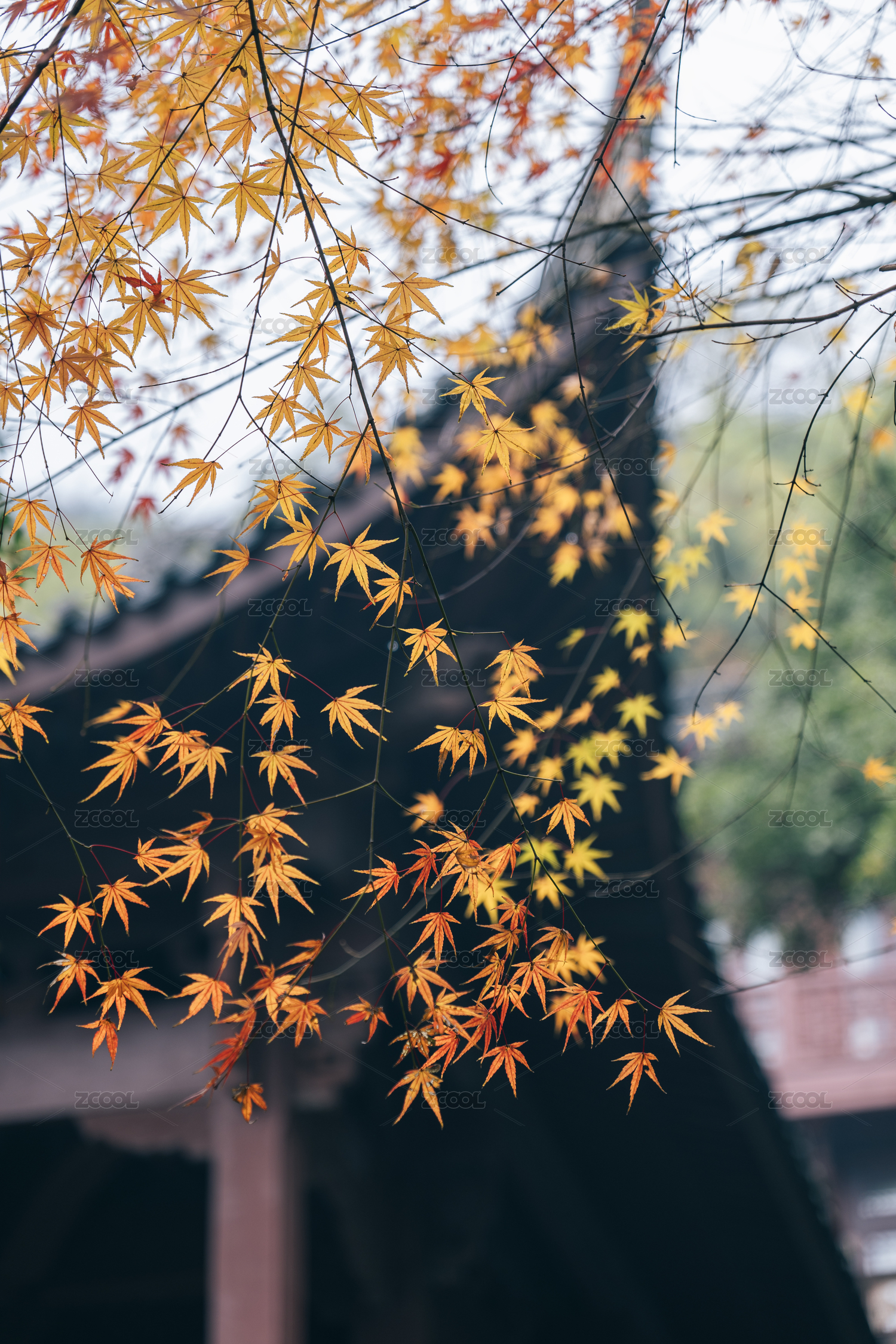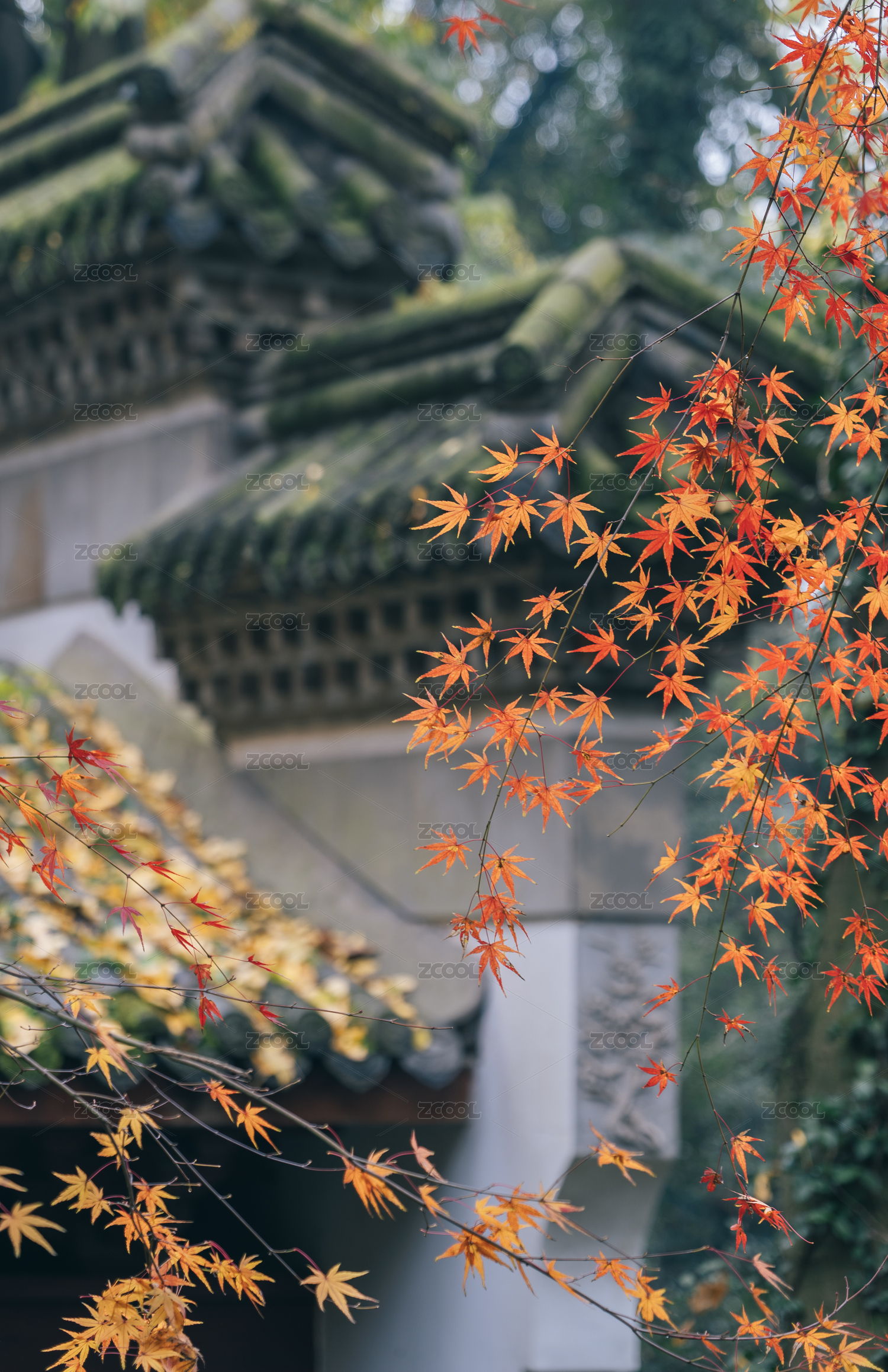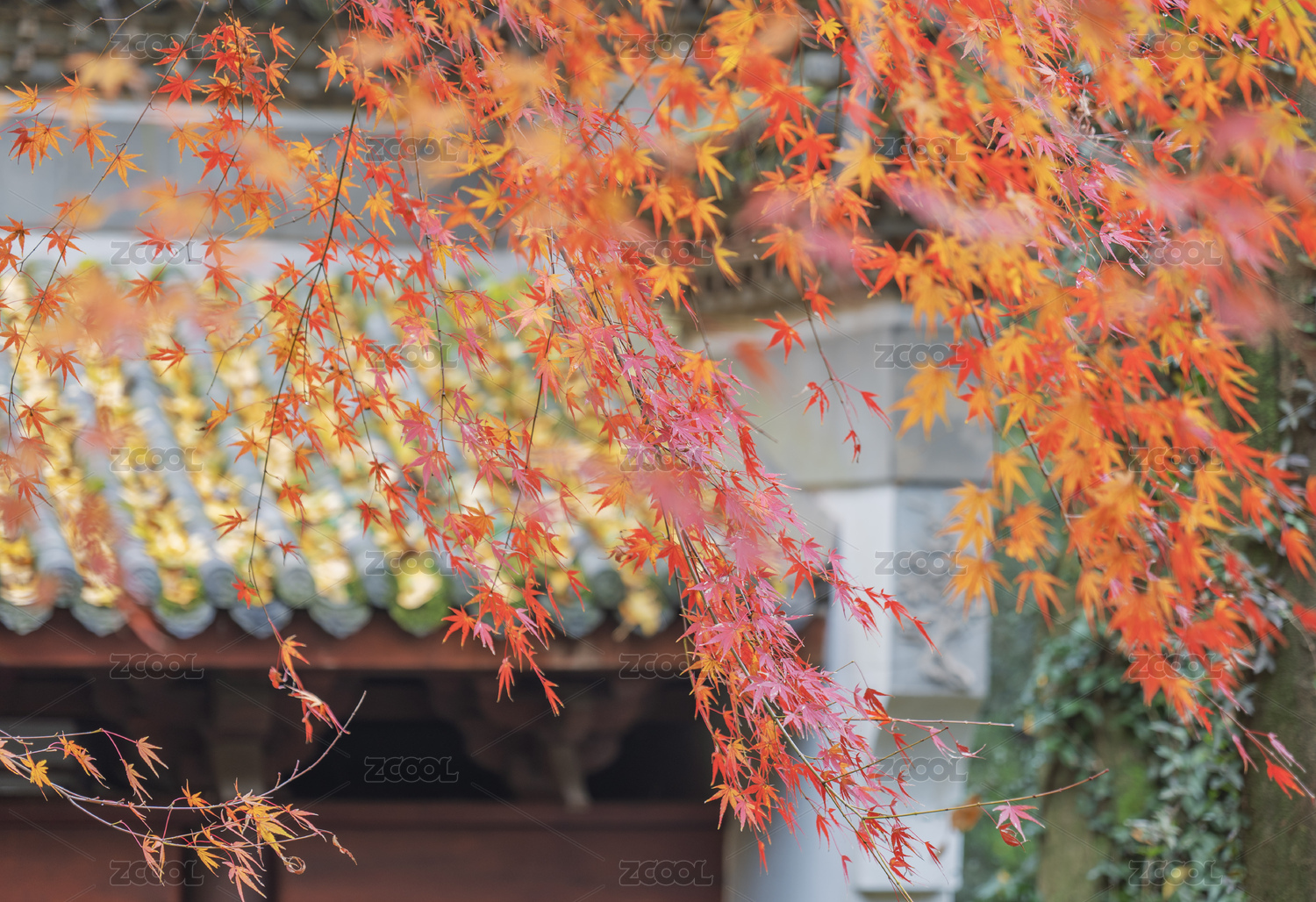 杭州韜光寺廟宇建筑旁秋景楓葉