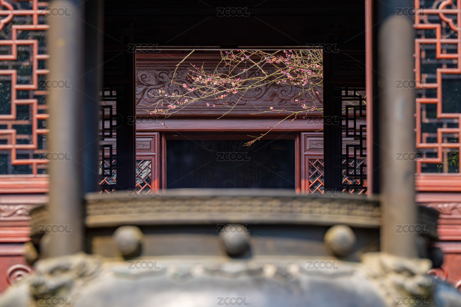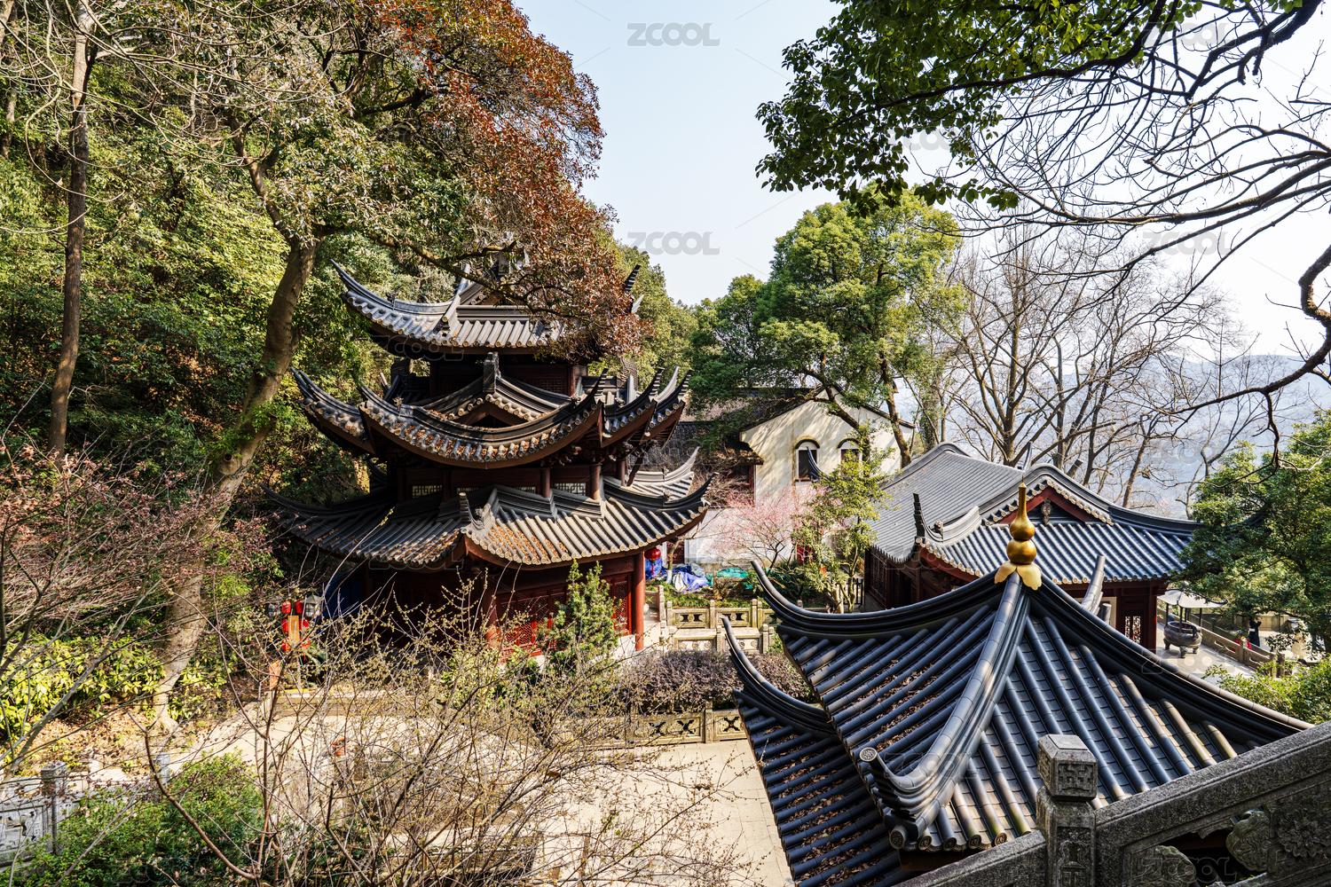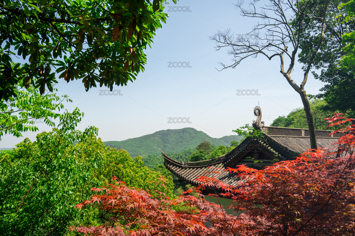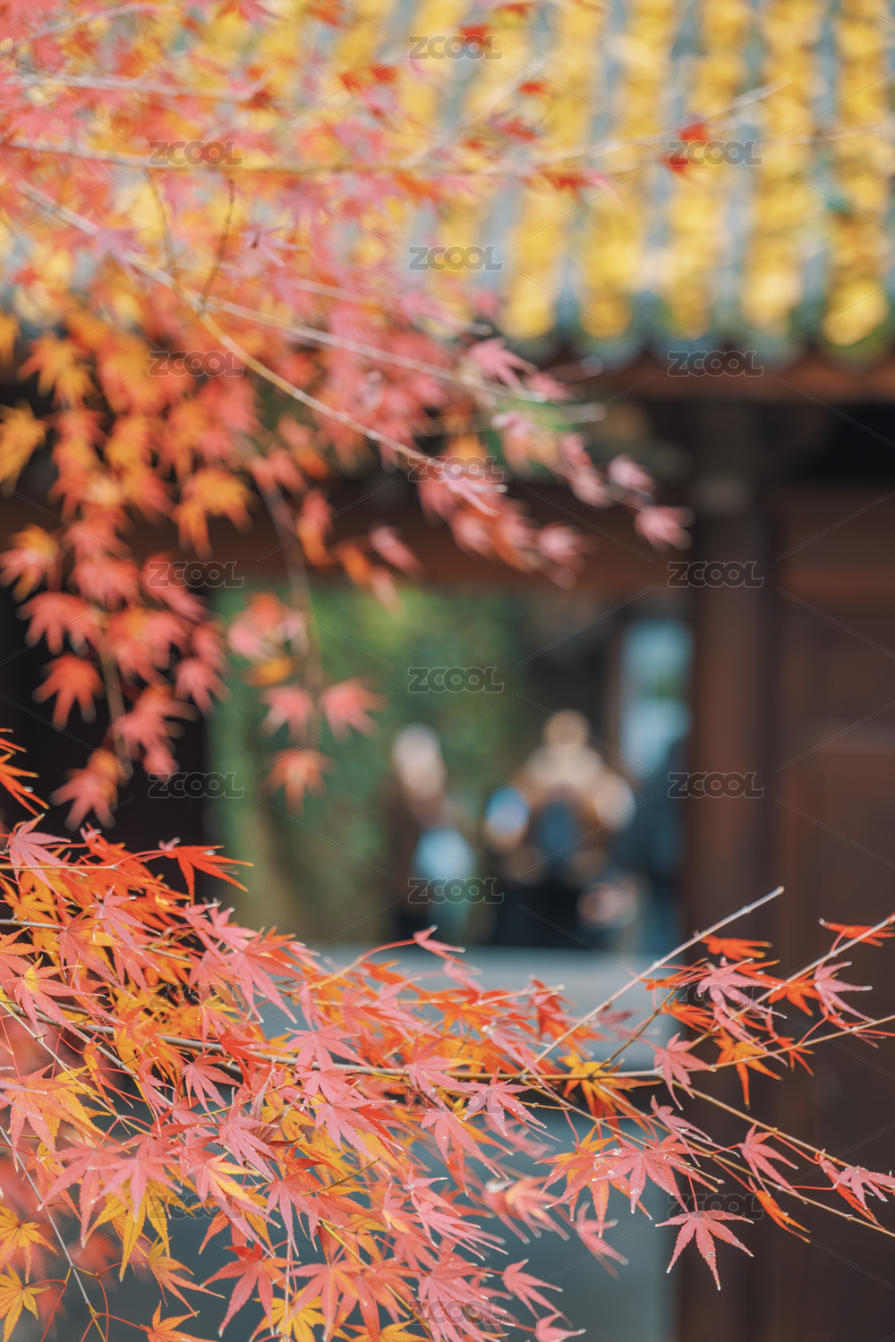 杭州韜光寺廟宇建筑旁秋景楓葉