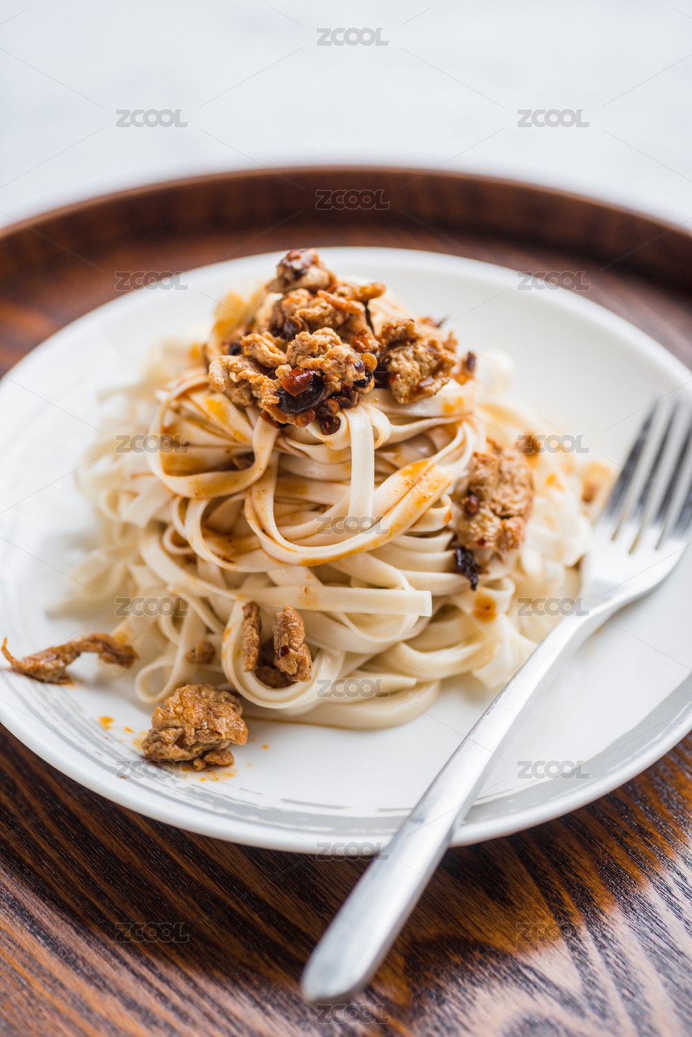 棕色木紋桌面上放著一碗肉醬拌面